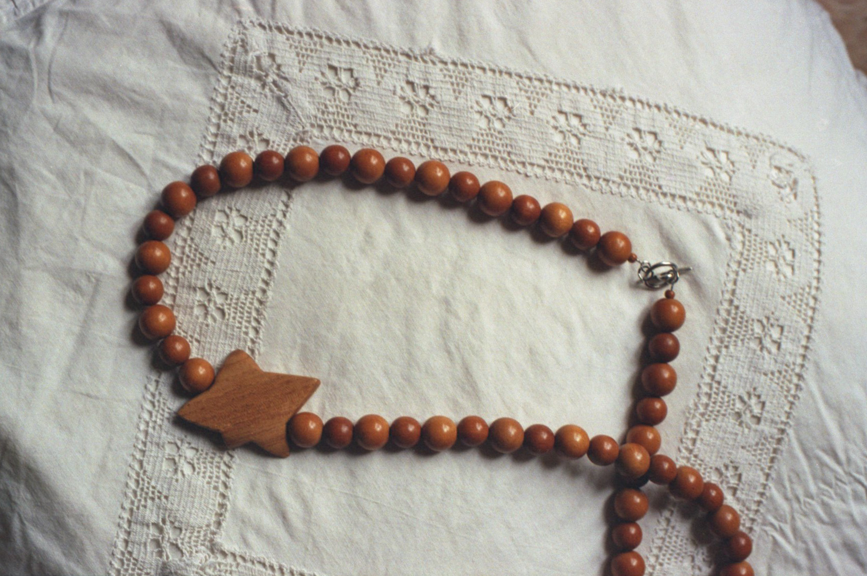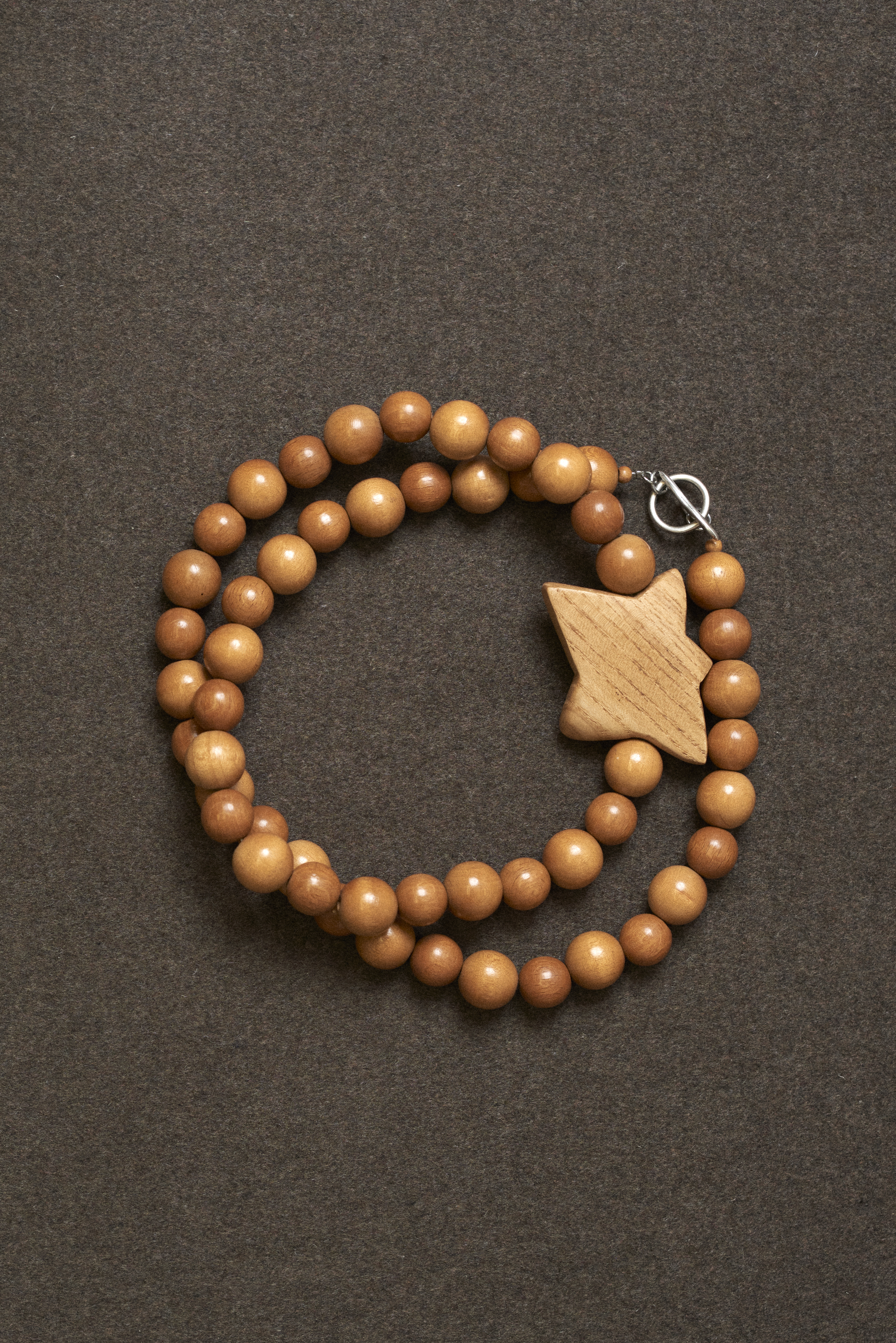 La ceinture Carthagène unique est composée de perles en bois vintage soigneusement sélectionnées, sublimées par une étoile en bois sculptée à la main par l'artiste Margot Lacombe . L'étoile en bois prend la place de la cuillère dans cette collaboration.