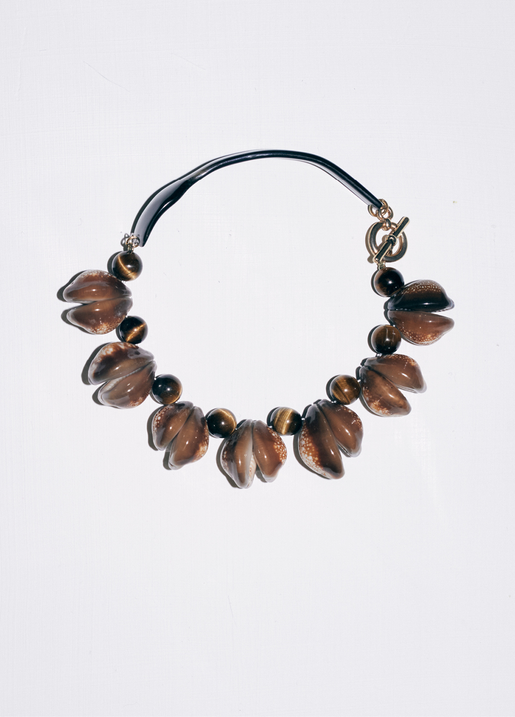 Les perles sont semi-précieuses oeil de tigre et avec des coquillages vintage.