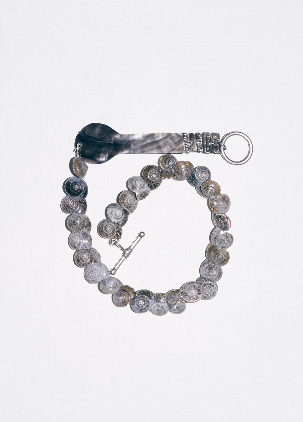 Le collier SPALMATORE est composé d'une cuillère tahitienne en nacre.
