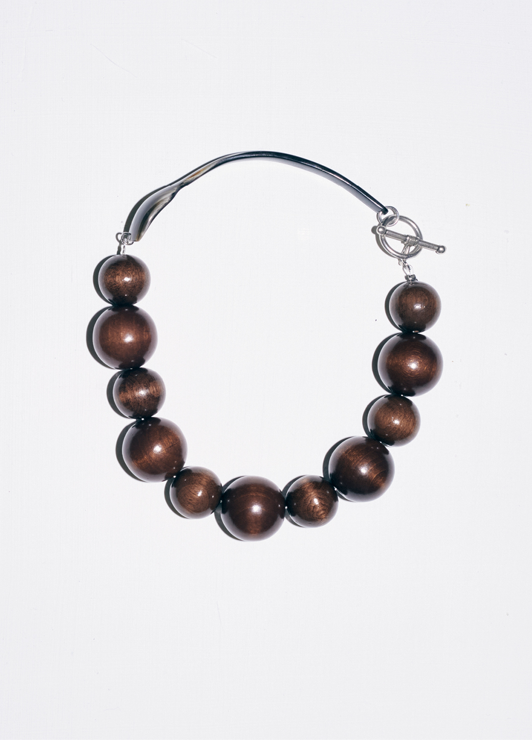 Le collier TURCHI est composé d'une cuillère en corne de zébu, provenant de Madagascar et achetée en seconde main. Elle a été tordue à Paris par un artisan.