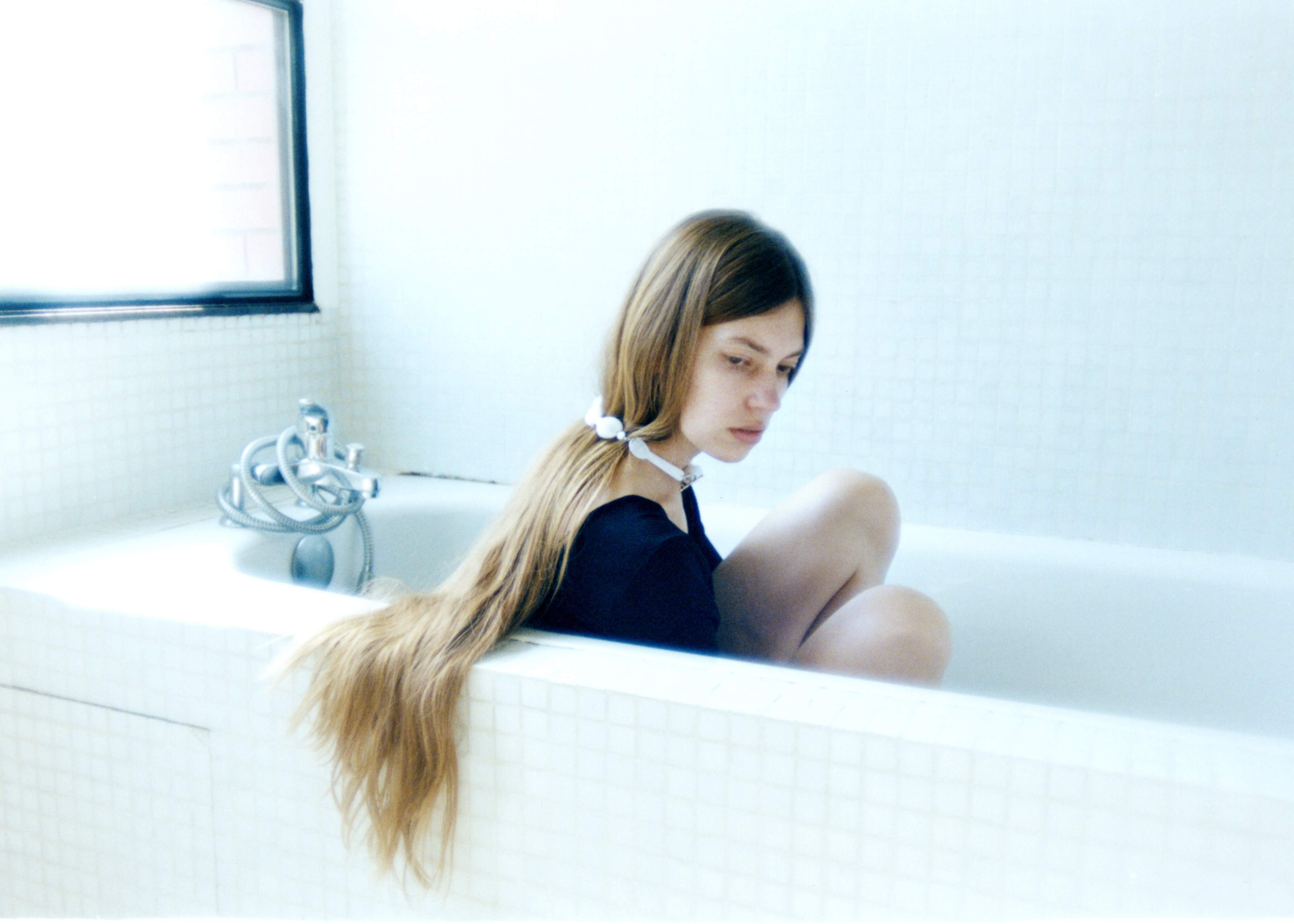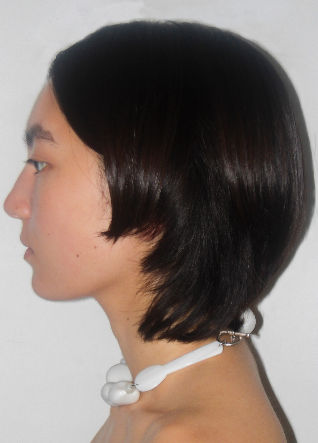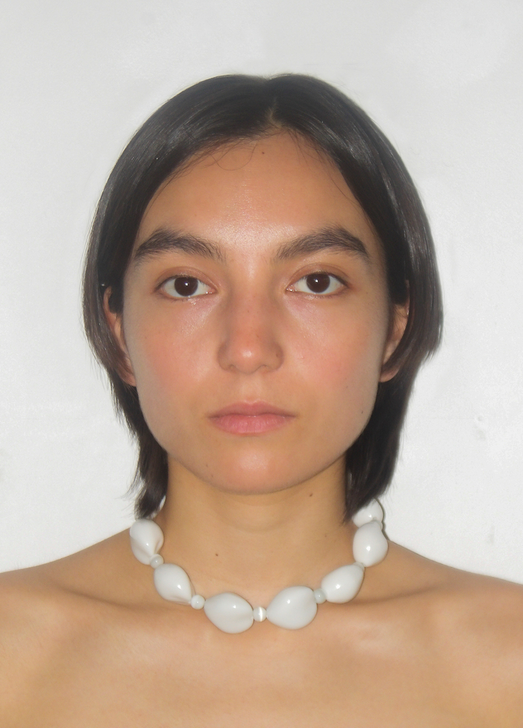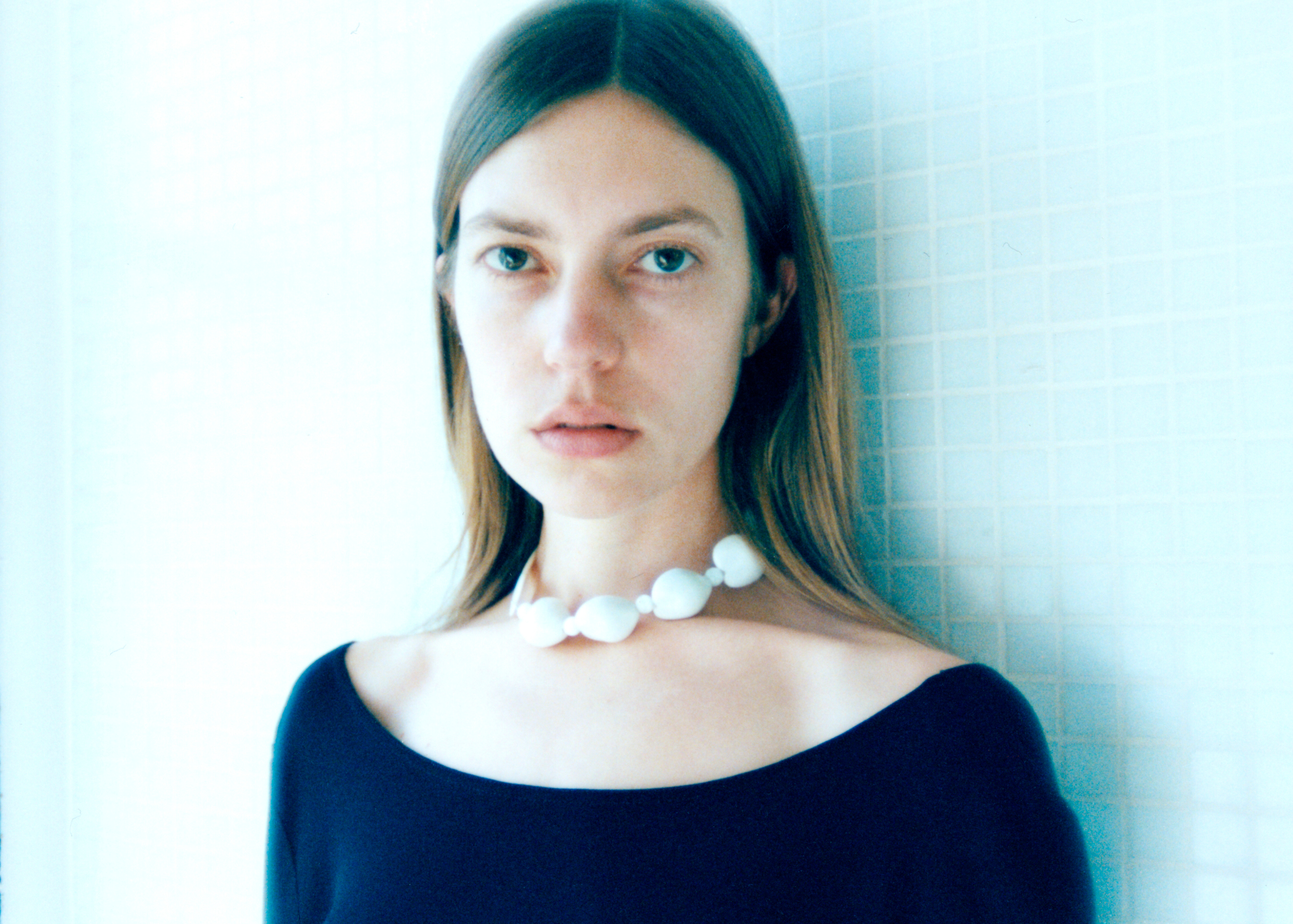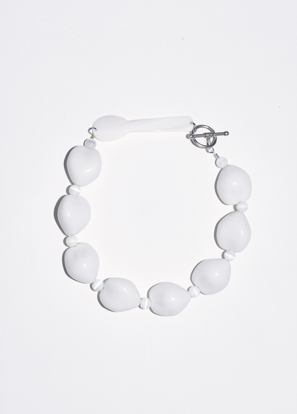 Le collier BIANCA est composé d’une cuillère à caviar en nacre et perles en acétate blanche vintage.
