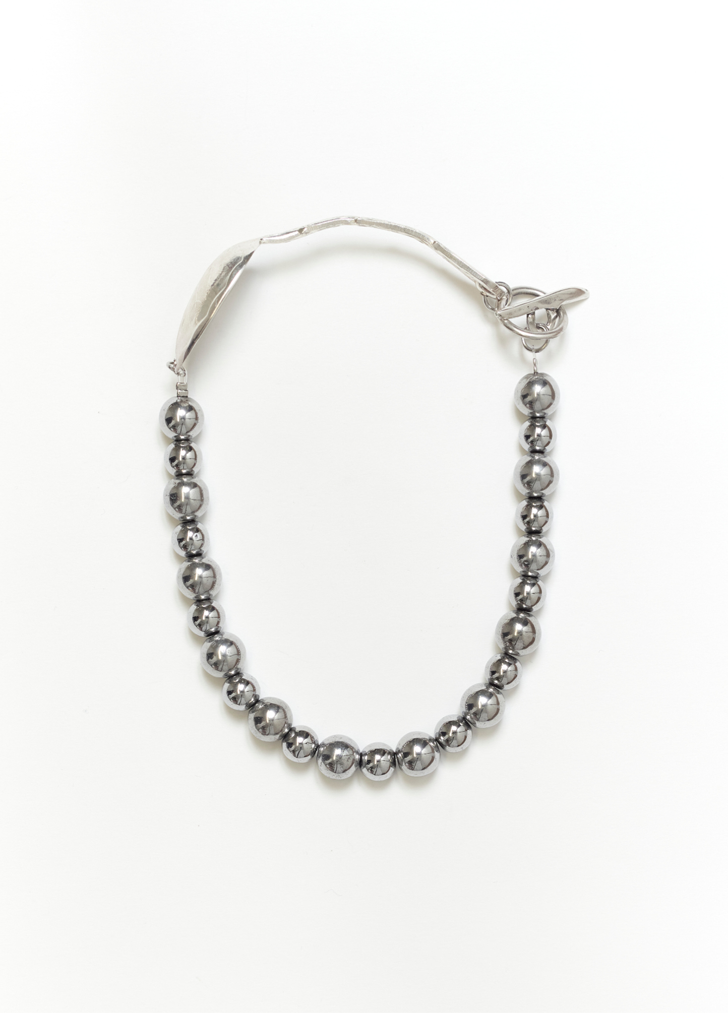 Le collier GROSSETO est composé d'une cuillère en argent et de perles semi-précieuses en hématite couleur argentée.