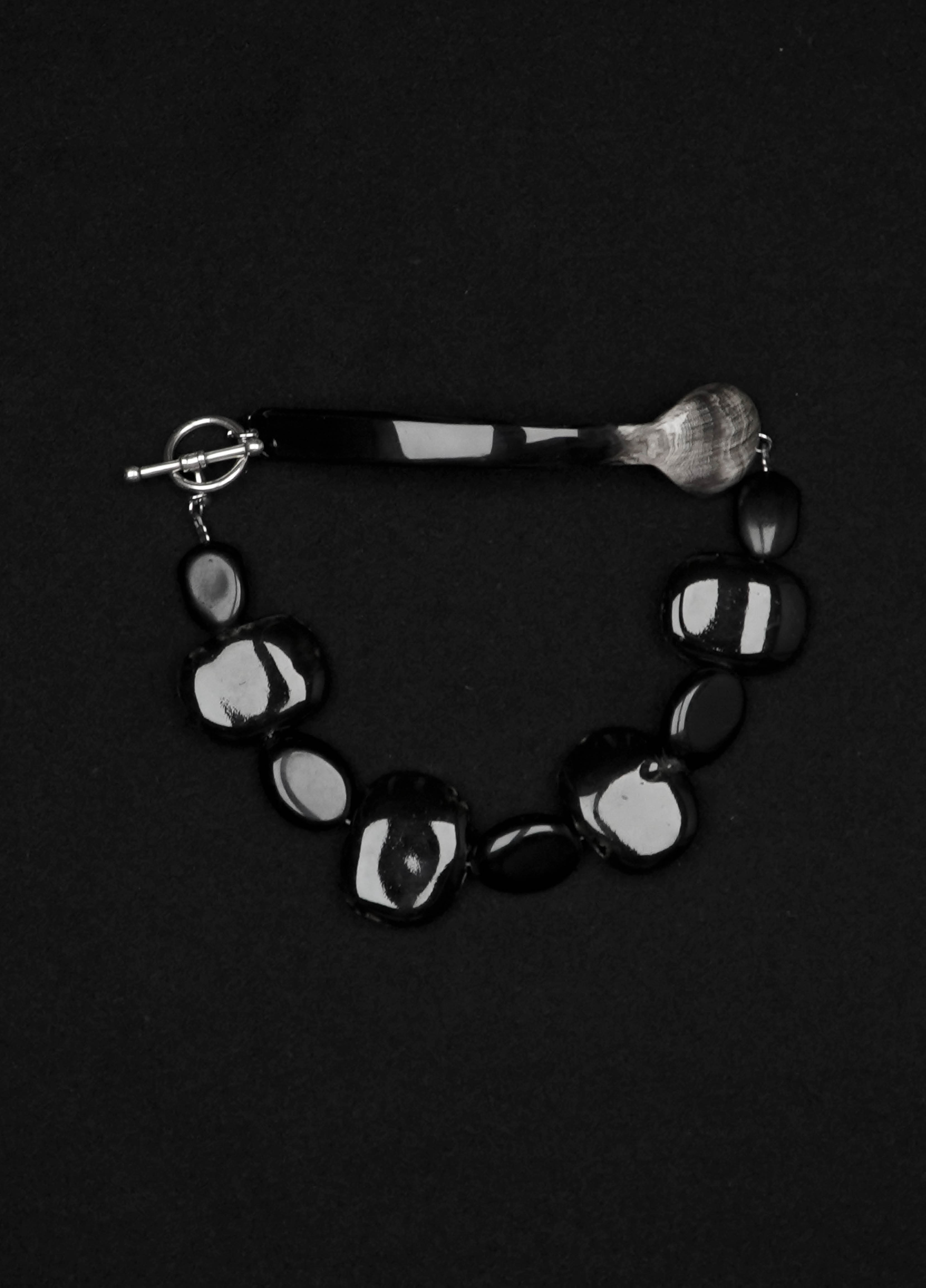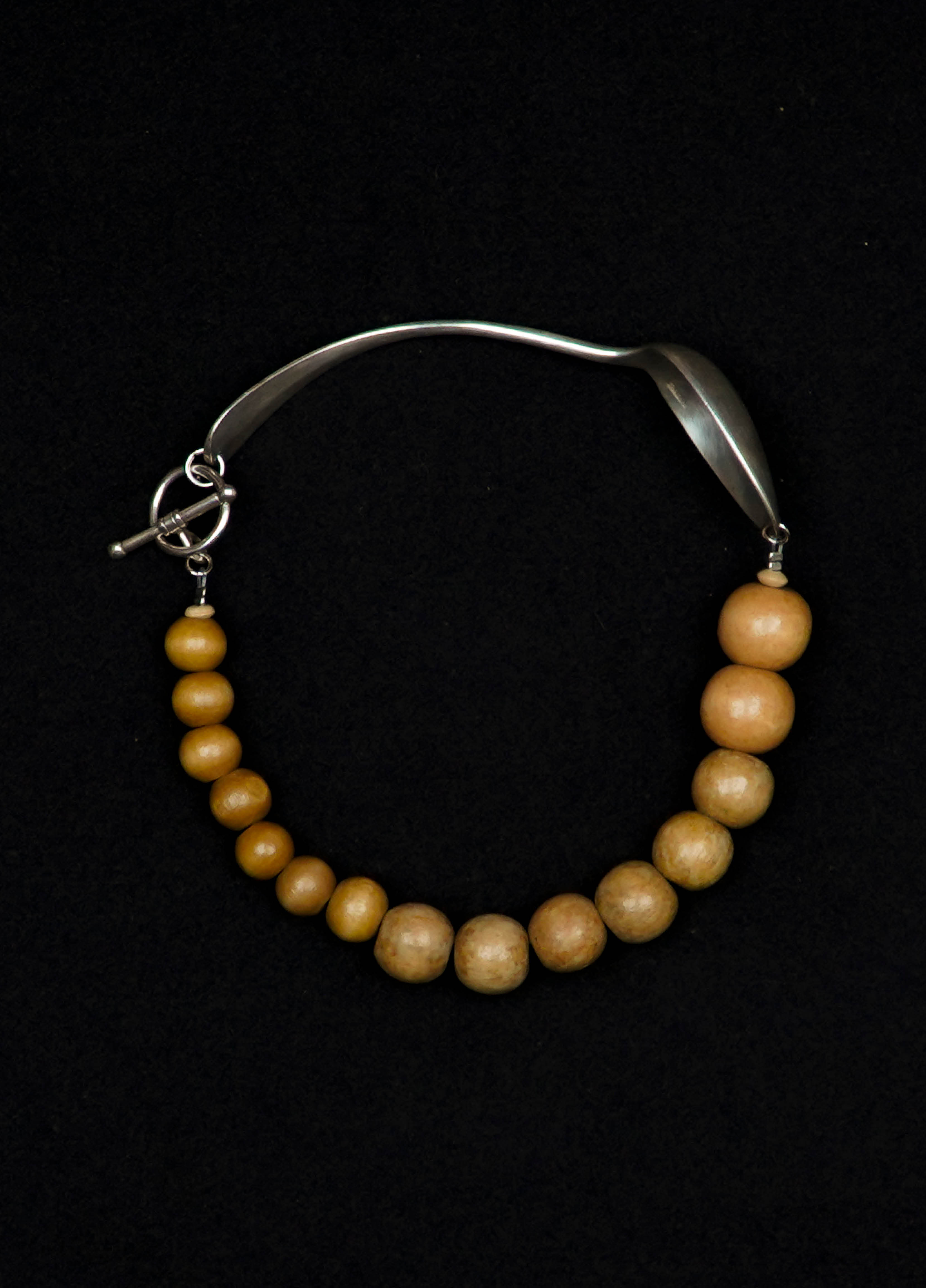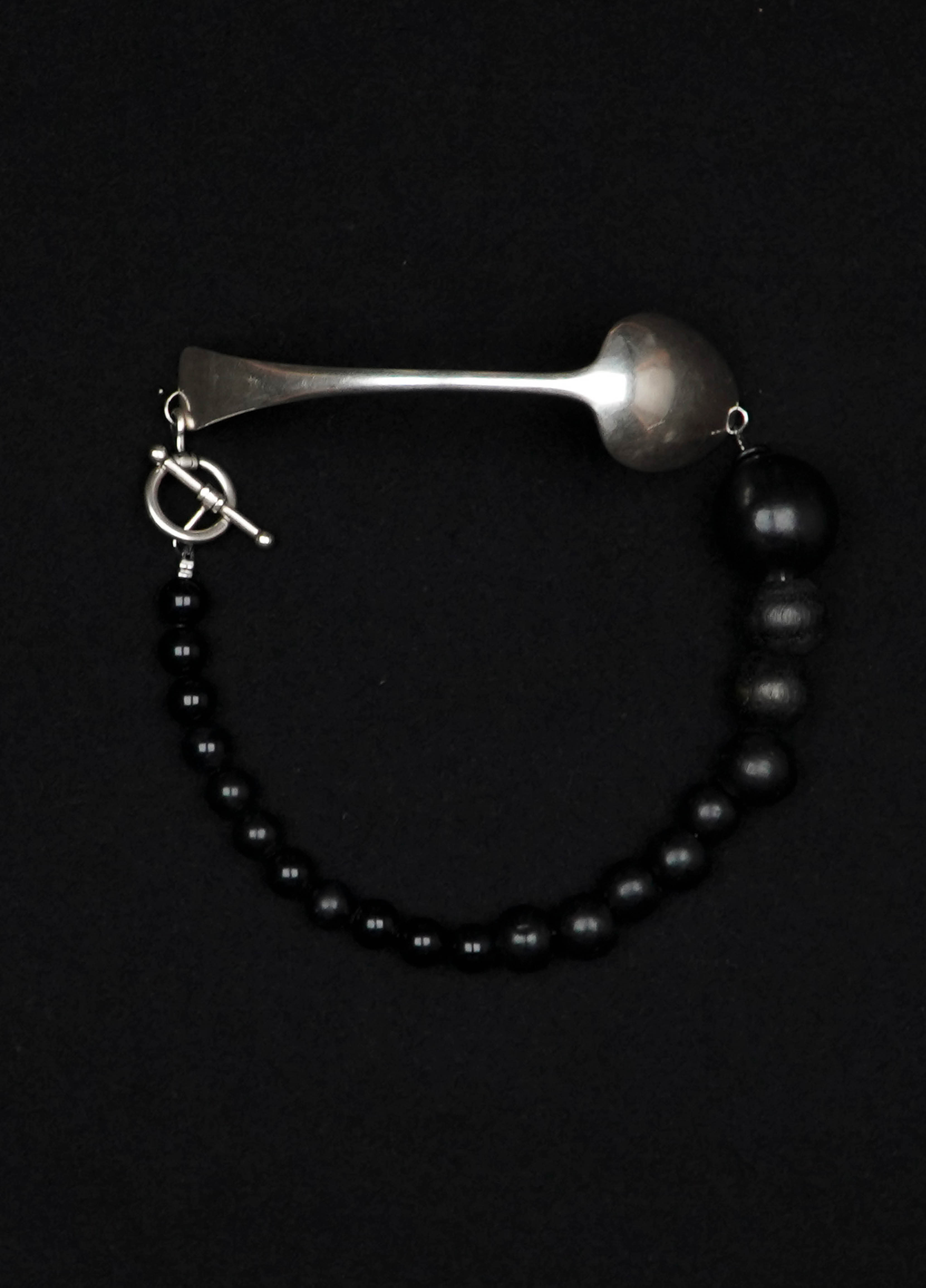 Le collier TRIESTE est composé d'une cuillère ancienne en argent et de perles vintage en bois noir.