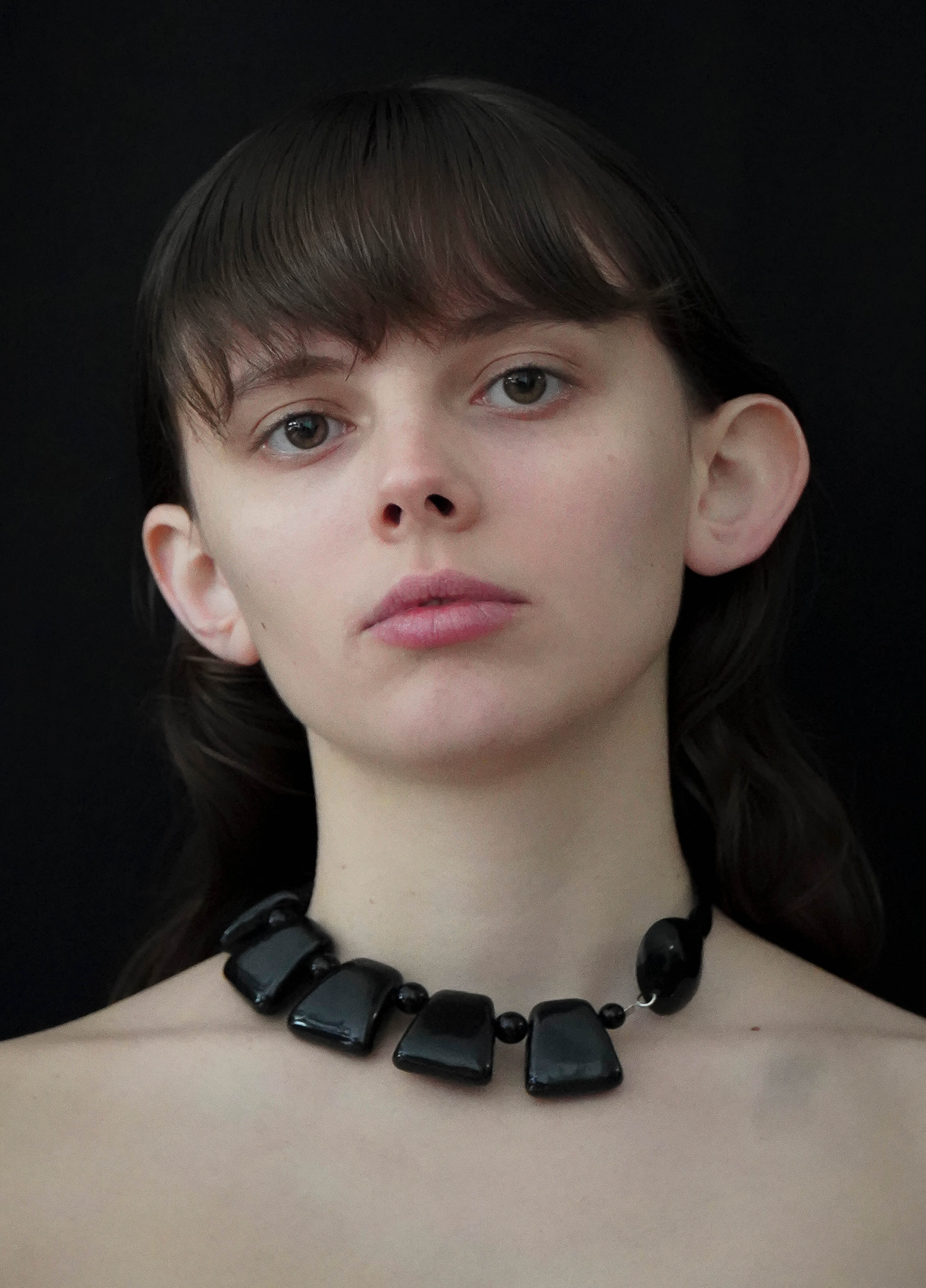 Le collier VÉNÉTIE est composé d'une cuillère à caviar en corne de zébu, tordue à Paris par un artisan. Les perles sont en céramique noire brillante.