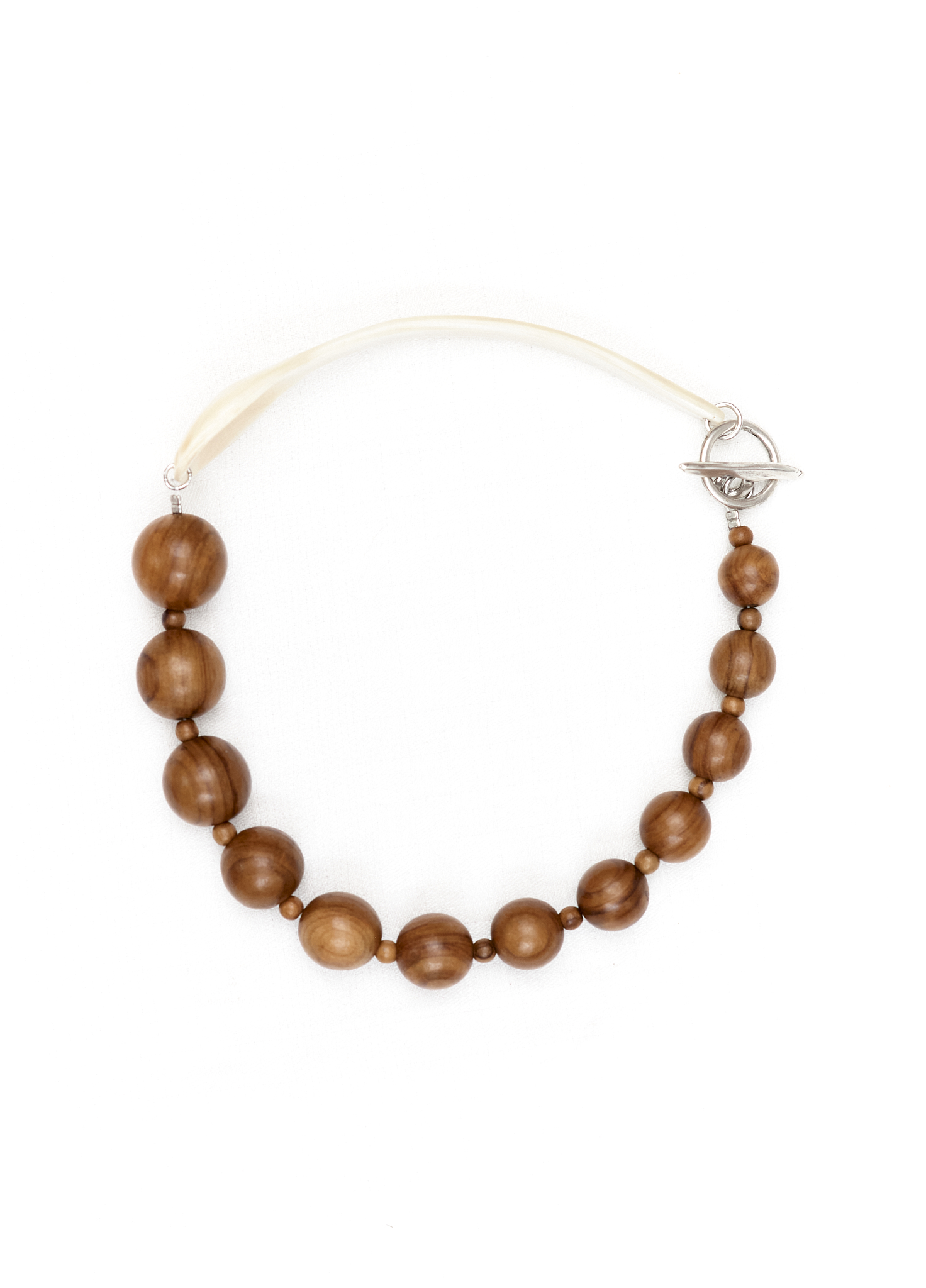 Le collier MONTE ANTELAO est composé d'une cuillère ancienne en corne de zébu provenant de Madagascar tordue à Paris par un artisan.