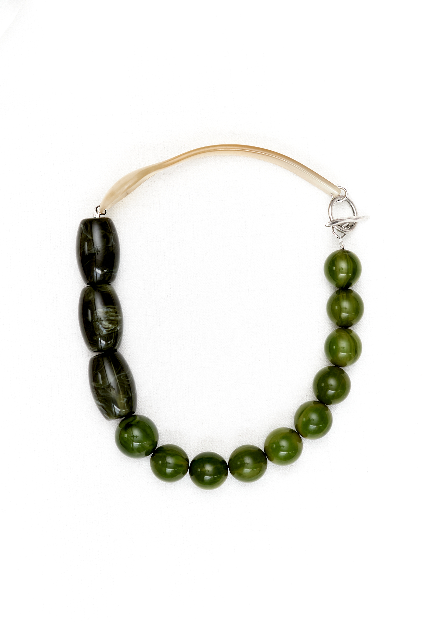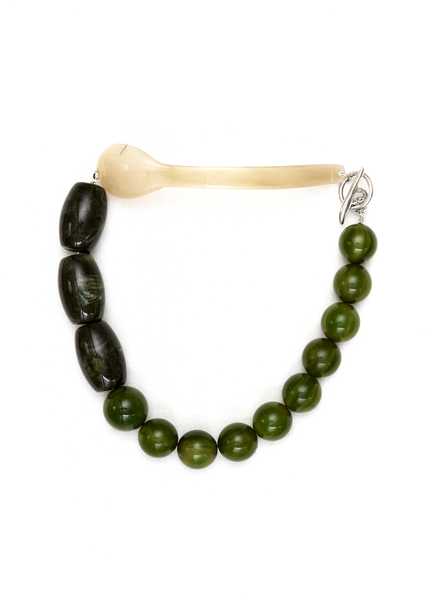 Le collier CIMA BRENTA est composé d’une cuillère en corne de zébu provenant de Madagascar, tordue à Paris par un artisan.