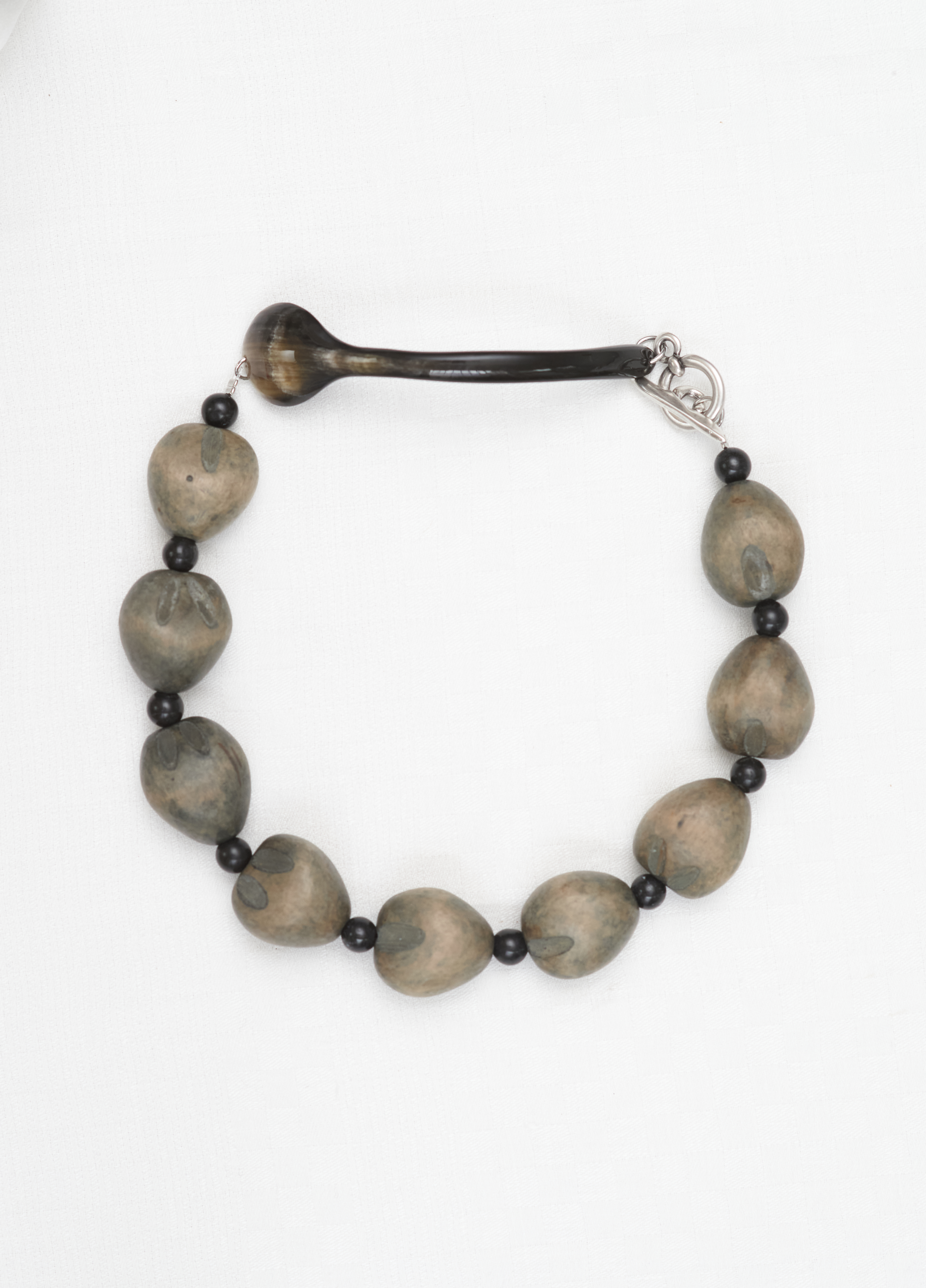 Le collier ERCOLANO VERT est composé d'une cuillère ancienne en corne de zébu provenant de Madagascar, tordue à Paris par un artisan.