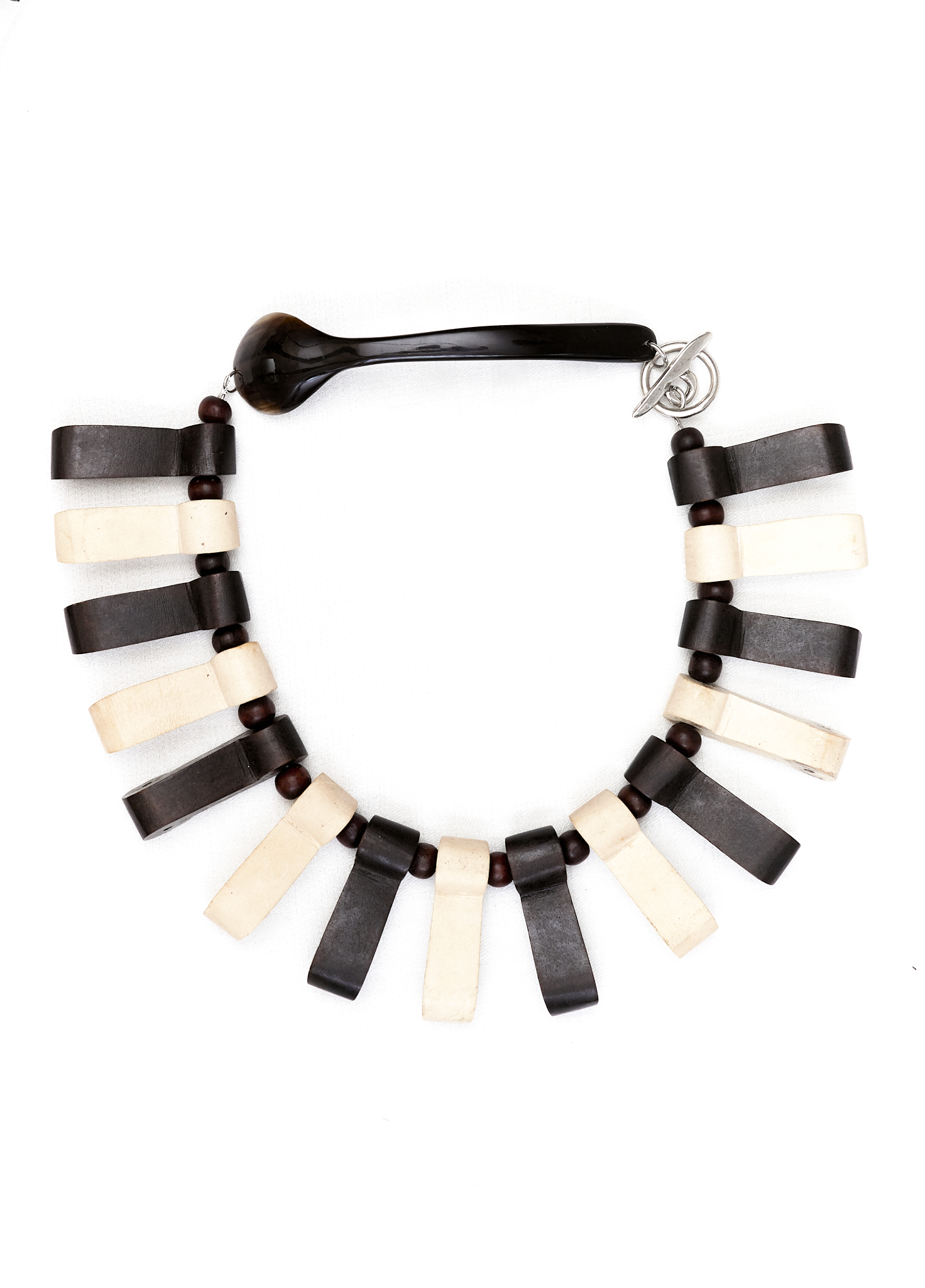 Le collier MONT BO est composé d'une cuillère ancienne en corne de zébu provenant de Madagascar, tordue à Paris par un artisan.