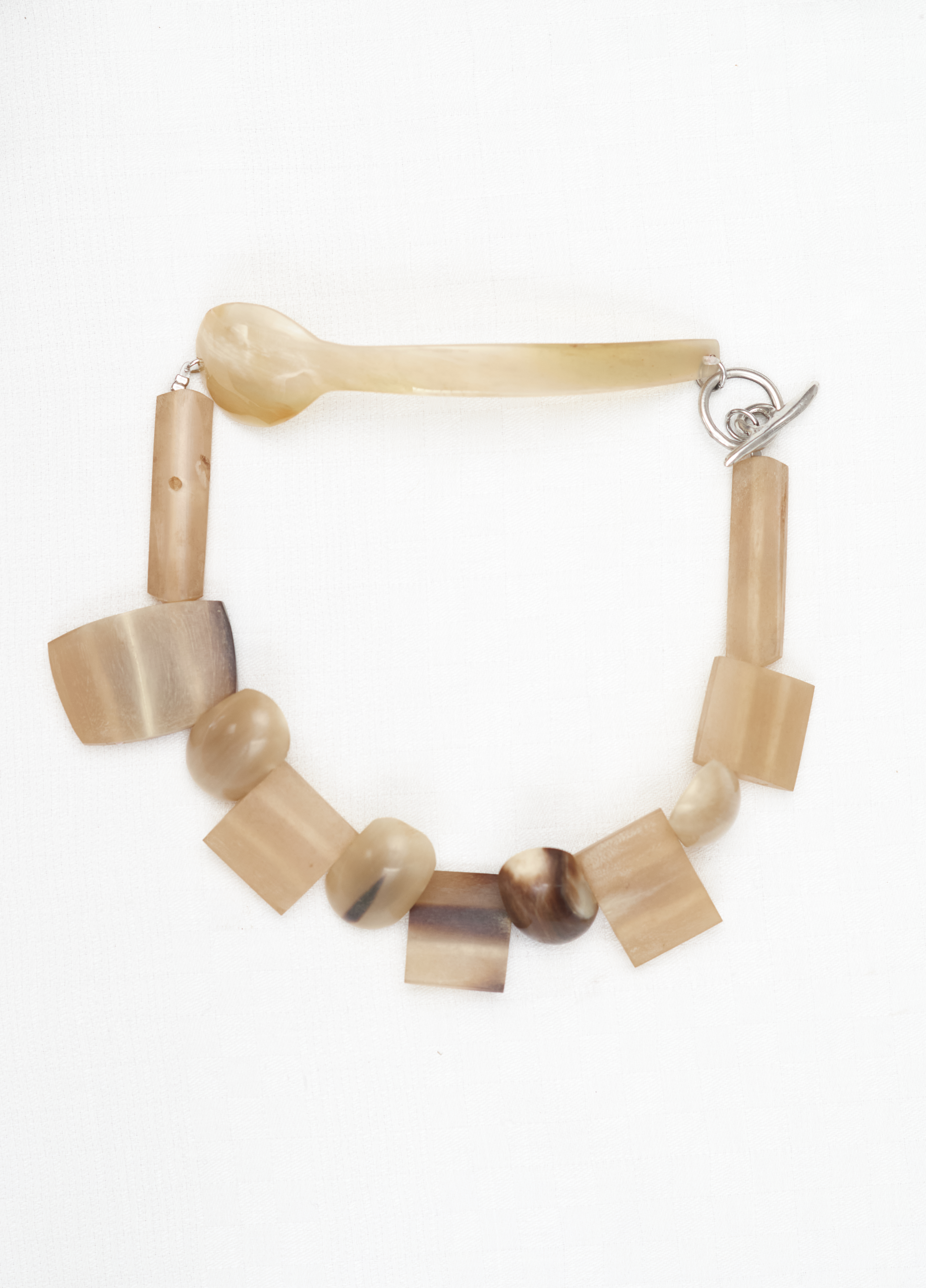 Le collier MONTE AVIC est composé d'une cuillère ancienne en corne de zébu provenant de Madagascar, tordue à Paris par un artisan.