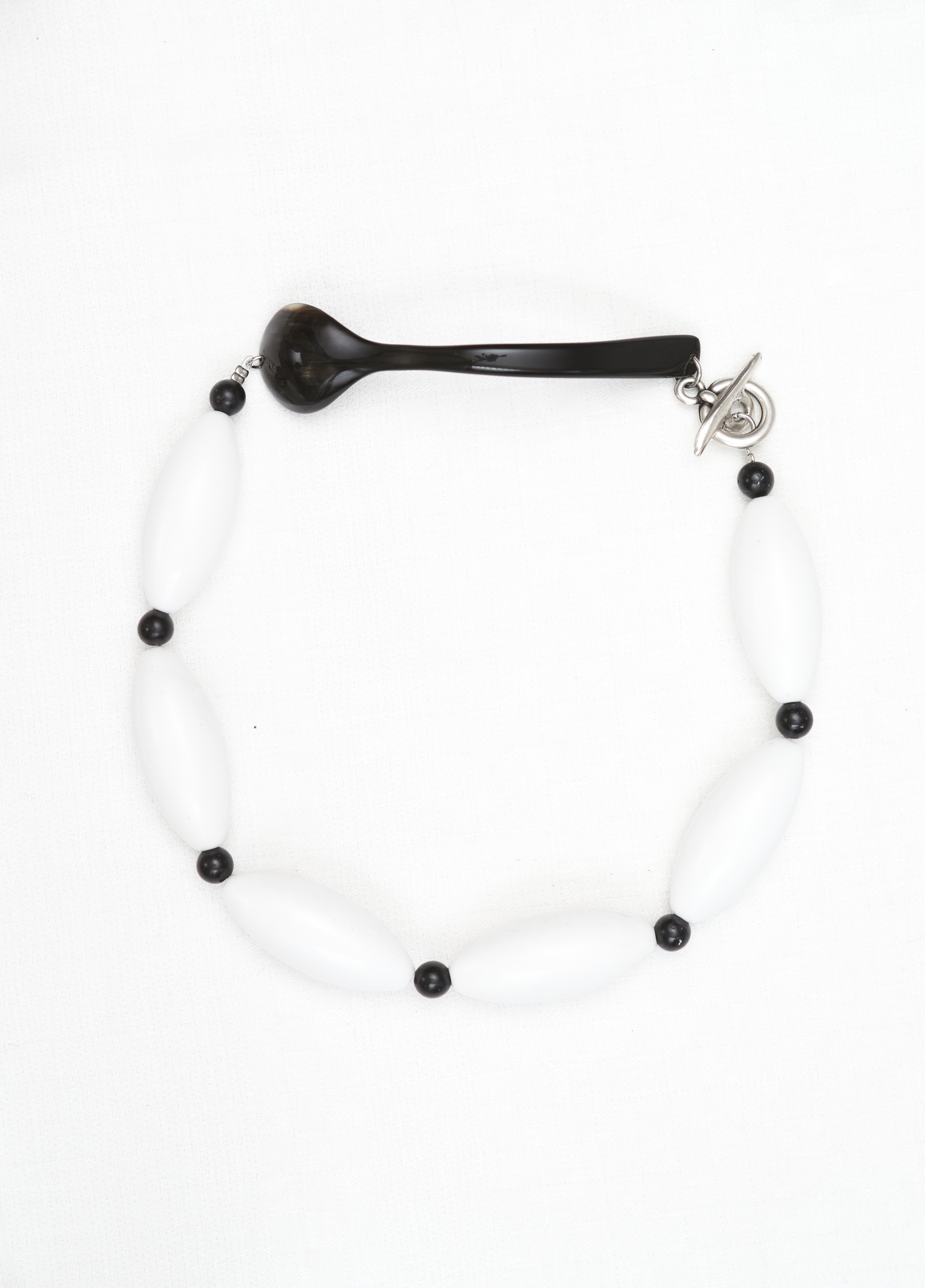 Le collier PONTE BLANC est composé d'une cuillère ancienne en corne de zébu provenant de Madagascar, tordue à Paris par un artisan.