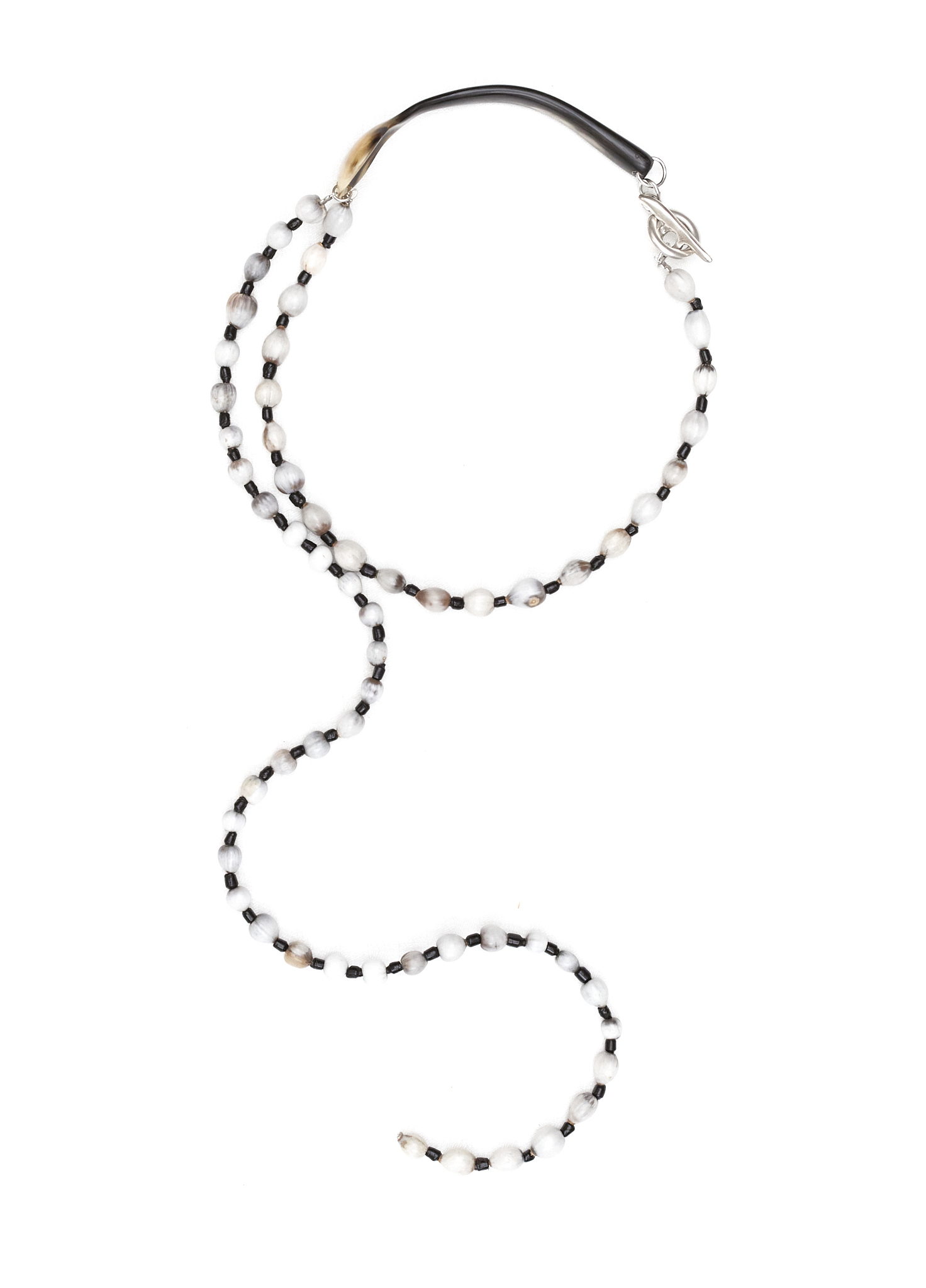 Le collier SILENZIO GRAINES GRIS est composé d'une cuillère ancienne en corne de zébu provenant de Madagascar, tordue à Paris par un artisan.