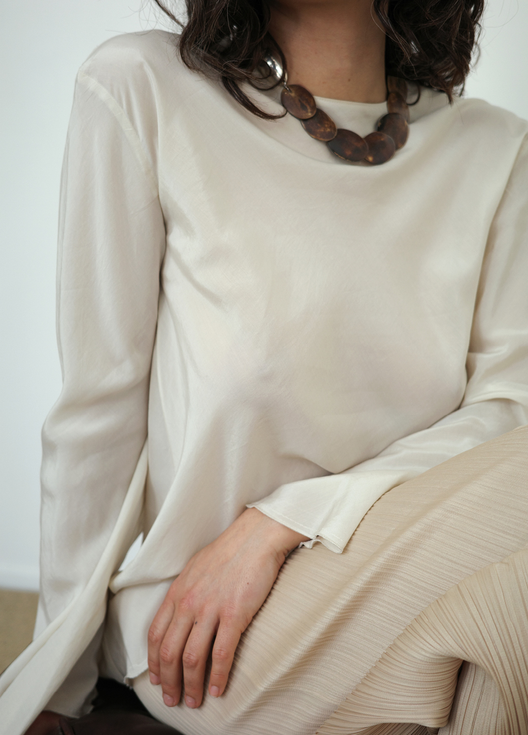 Le collier Metaponto est composé d’une cuillère ancienne en argent. Les perles vintage sont en corne.