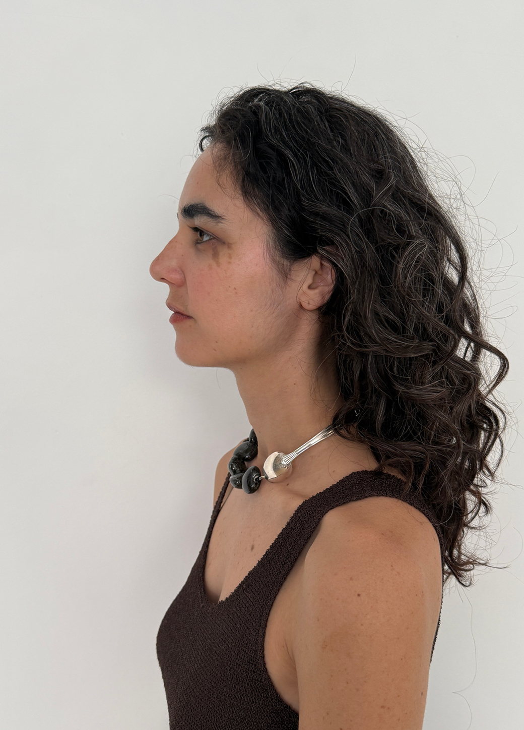 Le collier Pipara est composé d’une cuillère ancienne en argent. Les perles vintage sont en céramique, et les perles rondes noires sont en onyx.