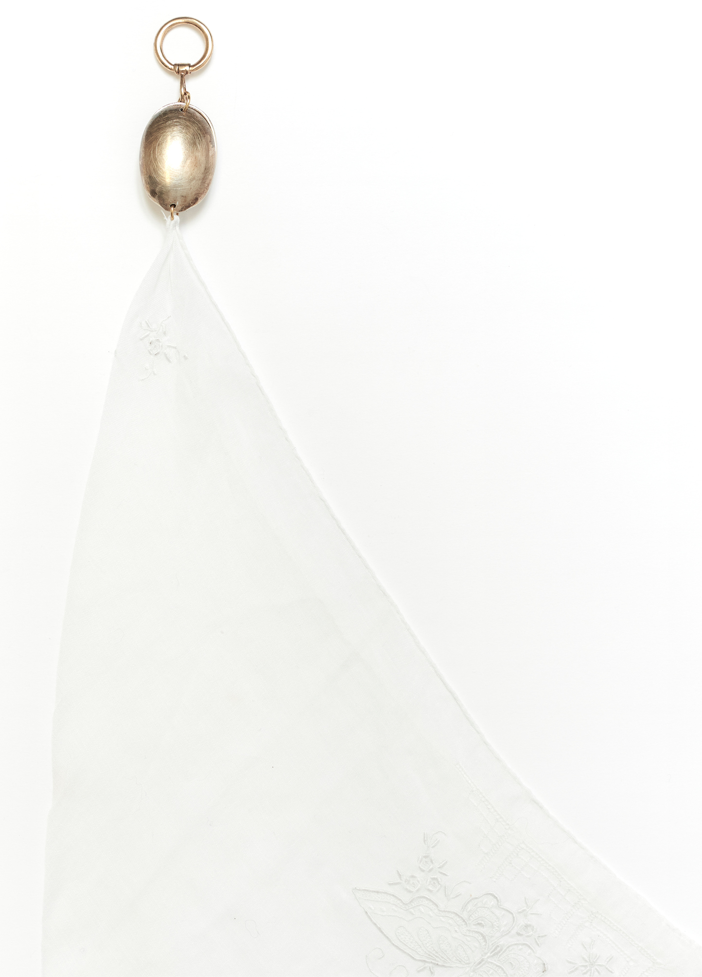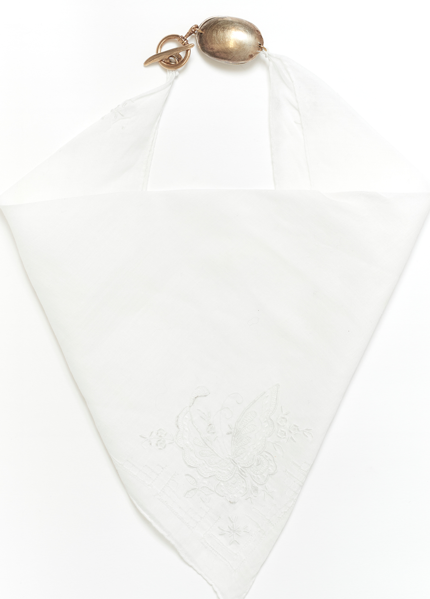 Le collier Riccione est composé d’une tête de cuillère vintage, plaquée or et d’un petit mouchoir ancien en coton brodé.