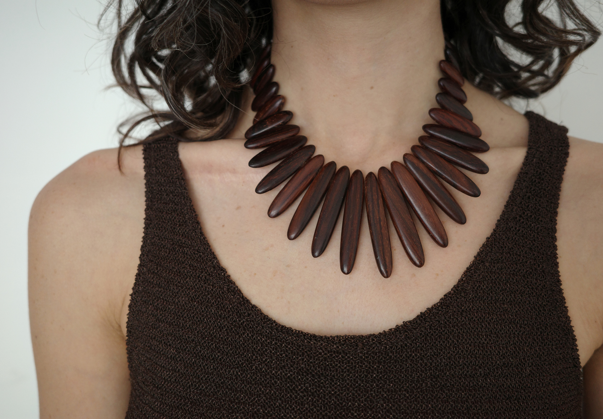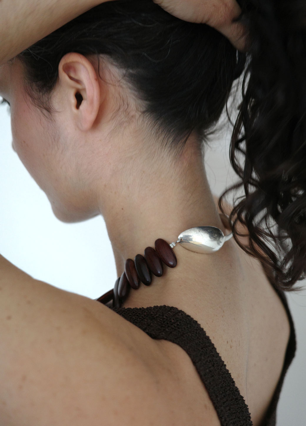 Le collier Solette est composé d'une cuillère ancienne en argent. Les perles vintage sont en bois.