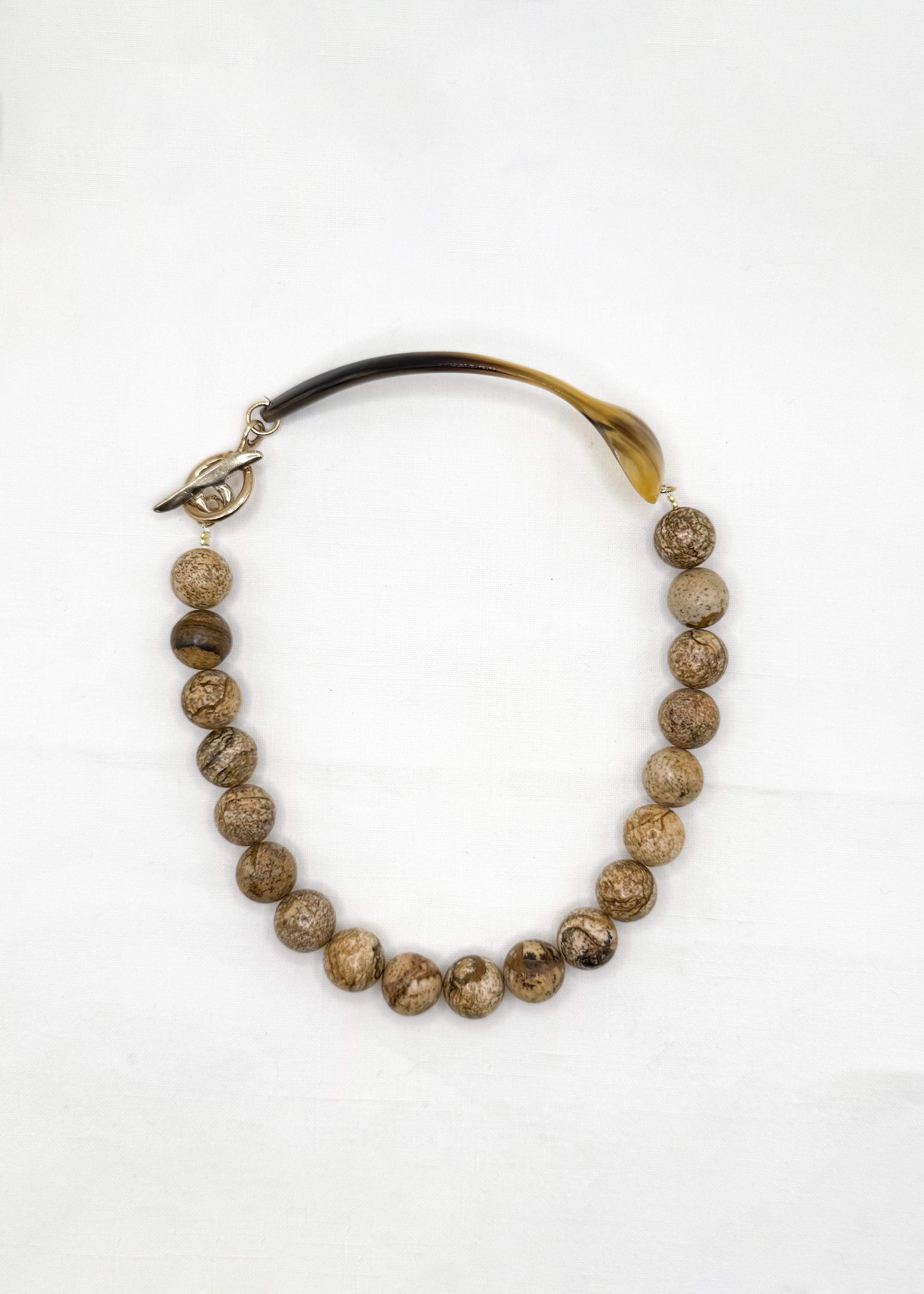 Le collier CATINACCIO est composé d’une cuillère à caviar en corne de zébu et de perles en pierres naturelles.