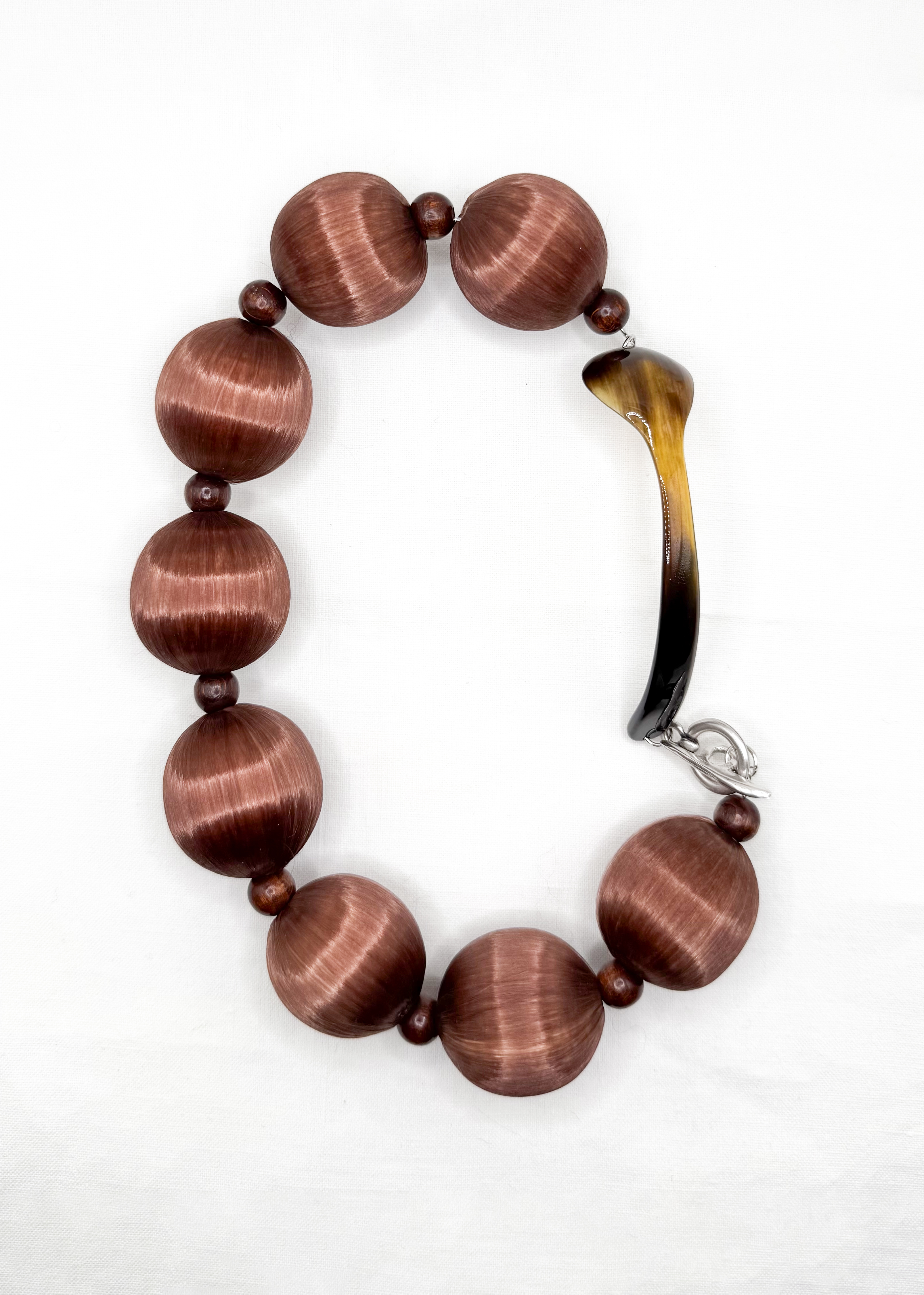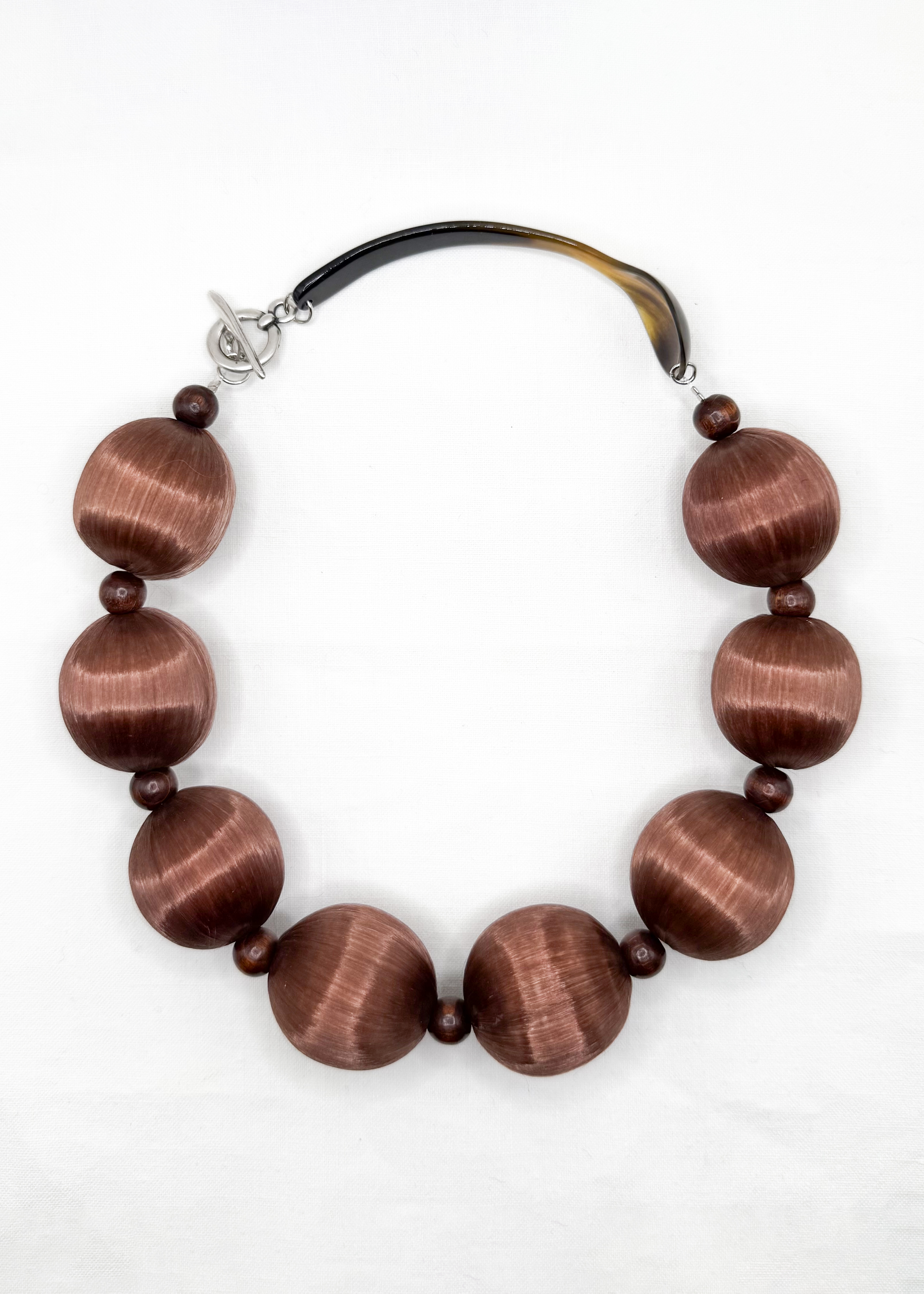 Le collier GRAND COMBIN est composé d’une tête de cuillère en argent et de perles rondes enrobées de fils de soie marron, séparées les unes des autres par de petites perles en bois.