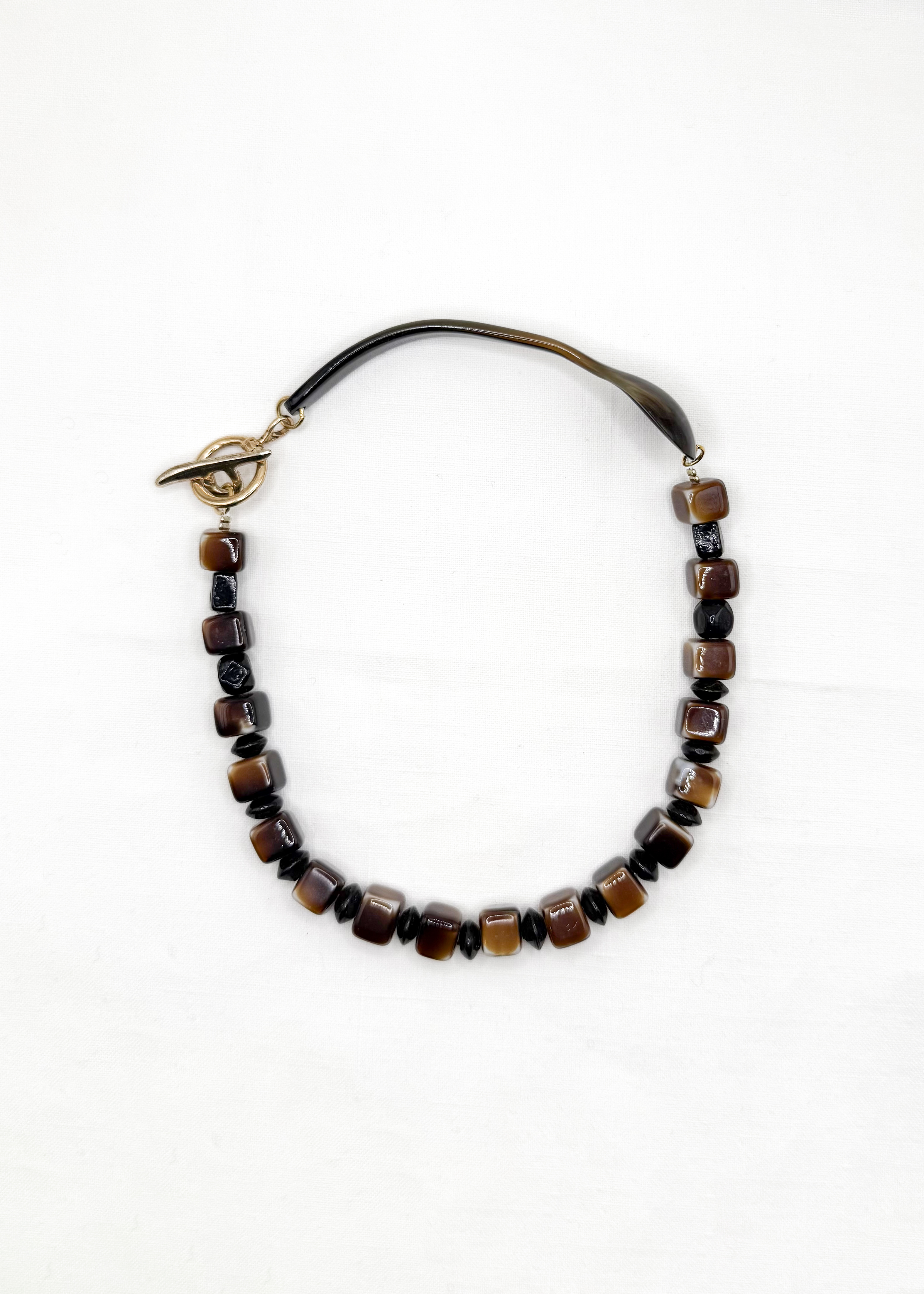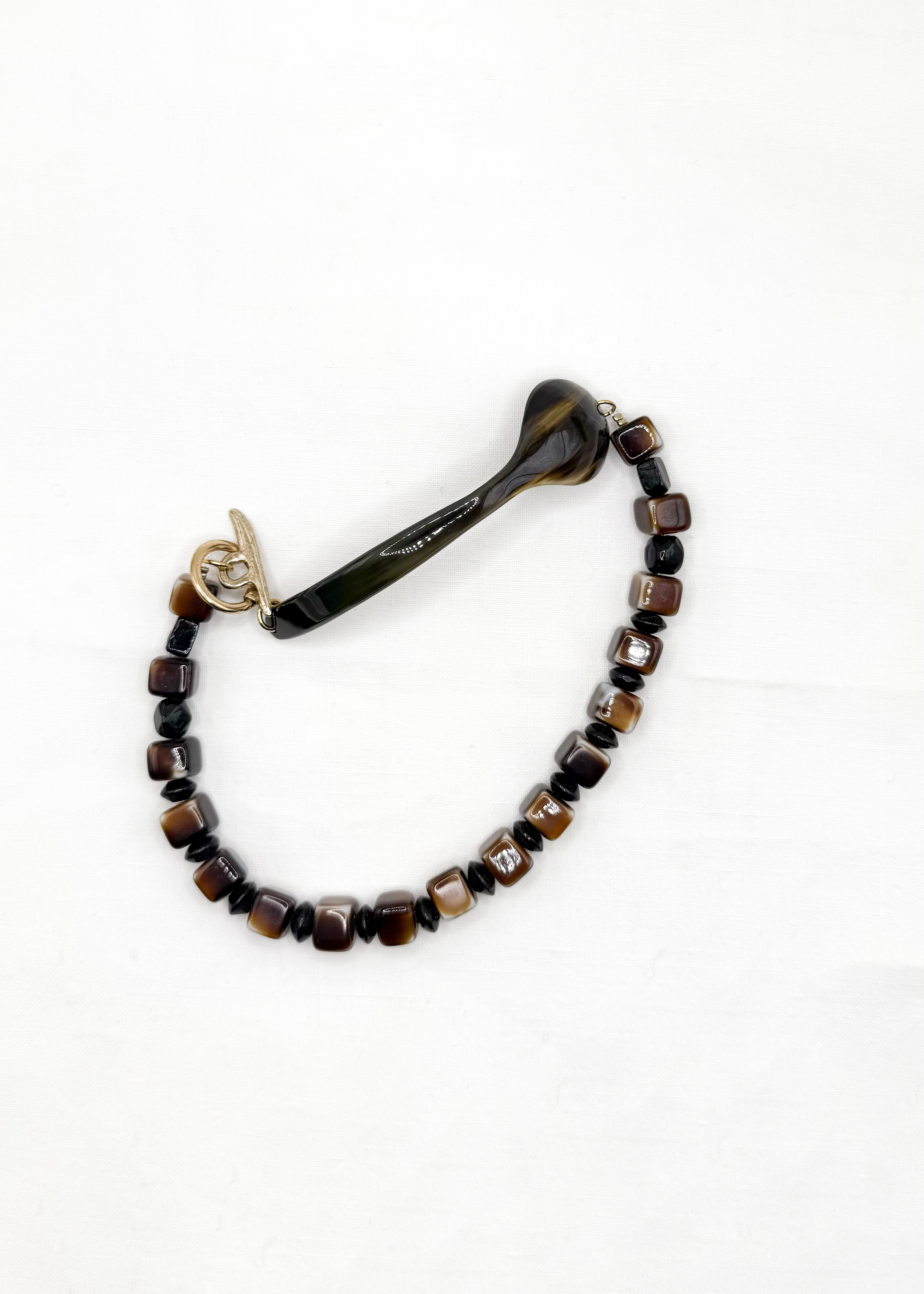 Le collier MARMOLADA est composé d’une cuillère à caviar en corne de zébu et de perles en céramique.