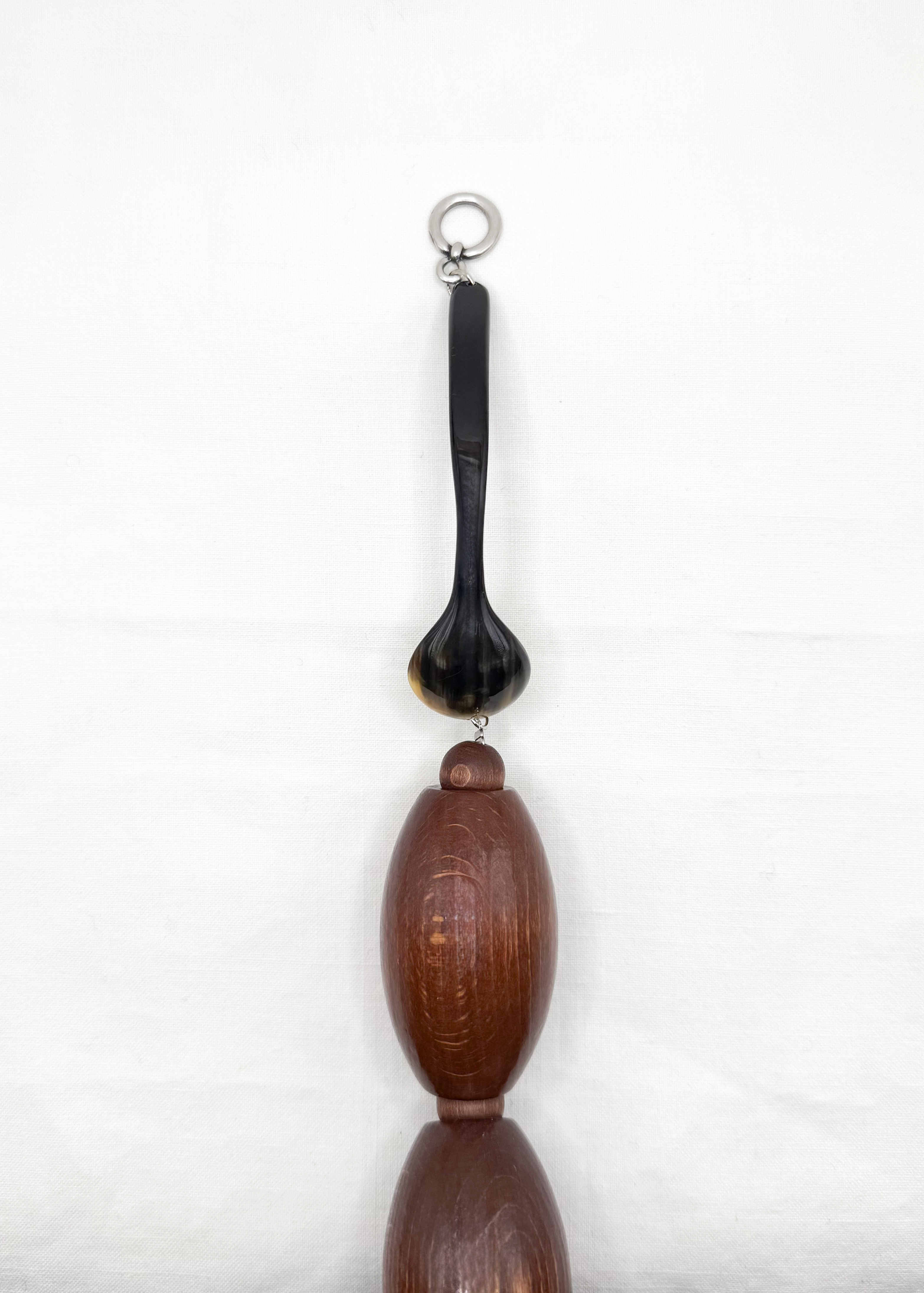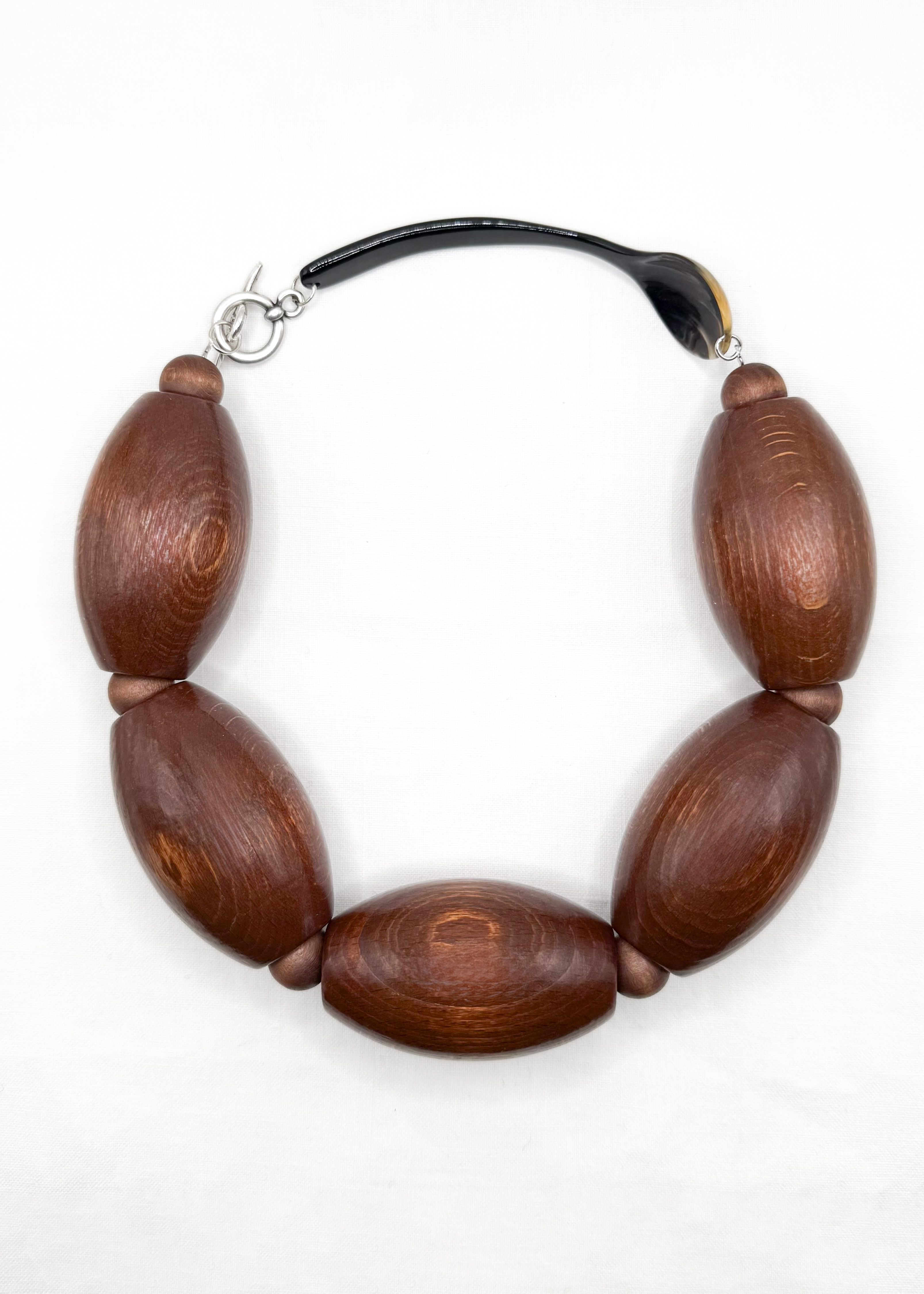 Le collier PUNTA GASTALDI est composé d’une cuillère à caviar en corne de zébu et de grosses perles anciennes en bois.