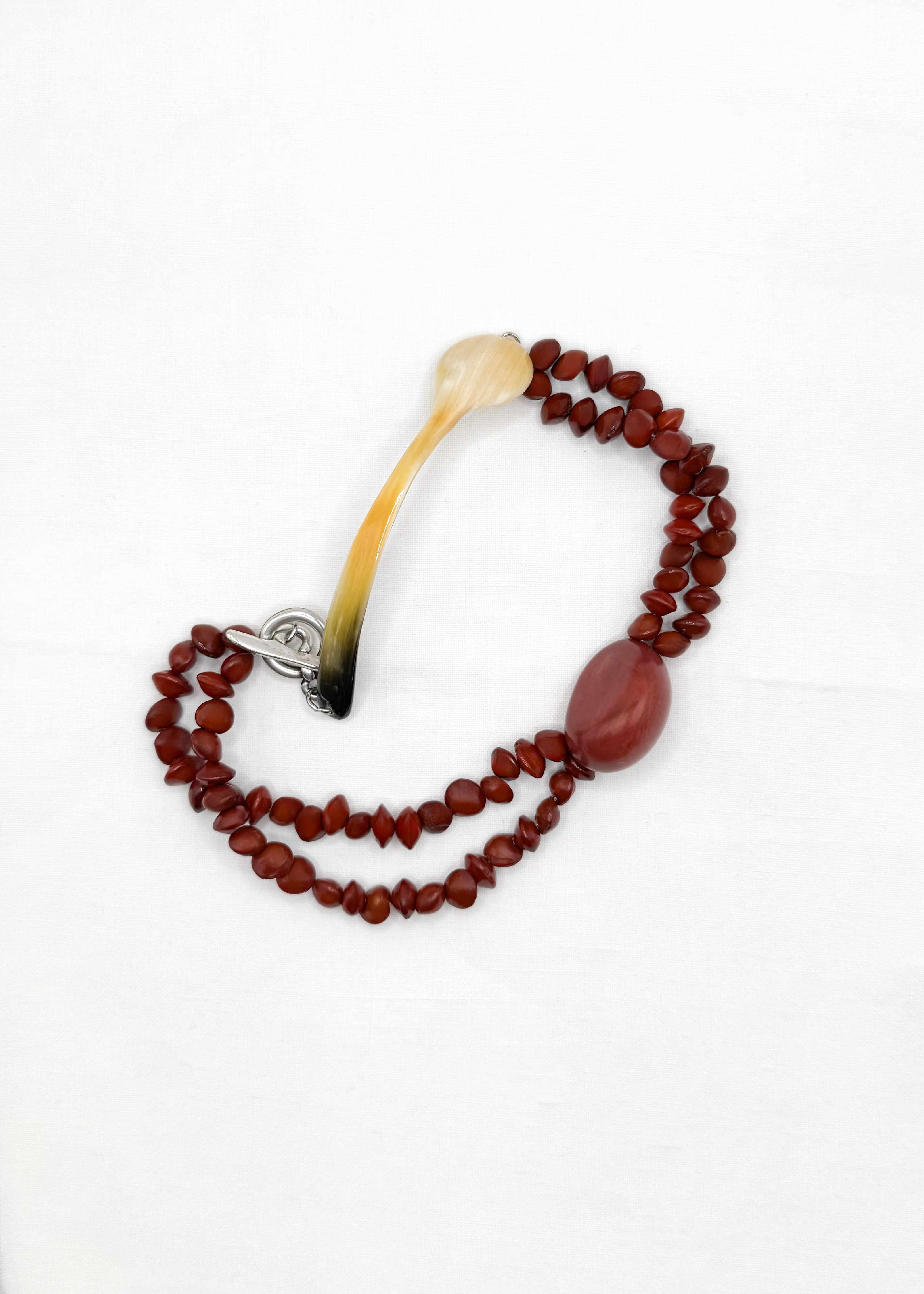 Le collier PUNTA TERRAROSSA est composé d’une cuillère à caviar en corne de zébu et de perles graines rouges.