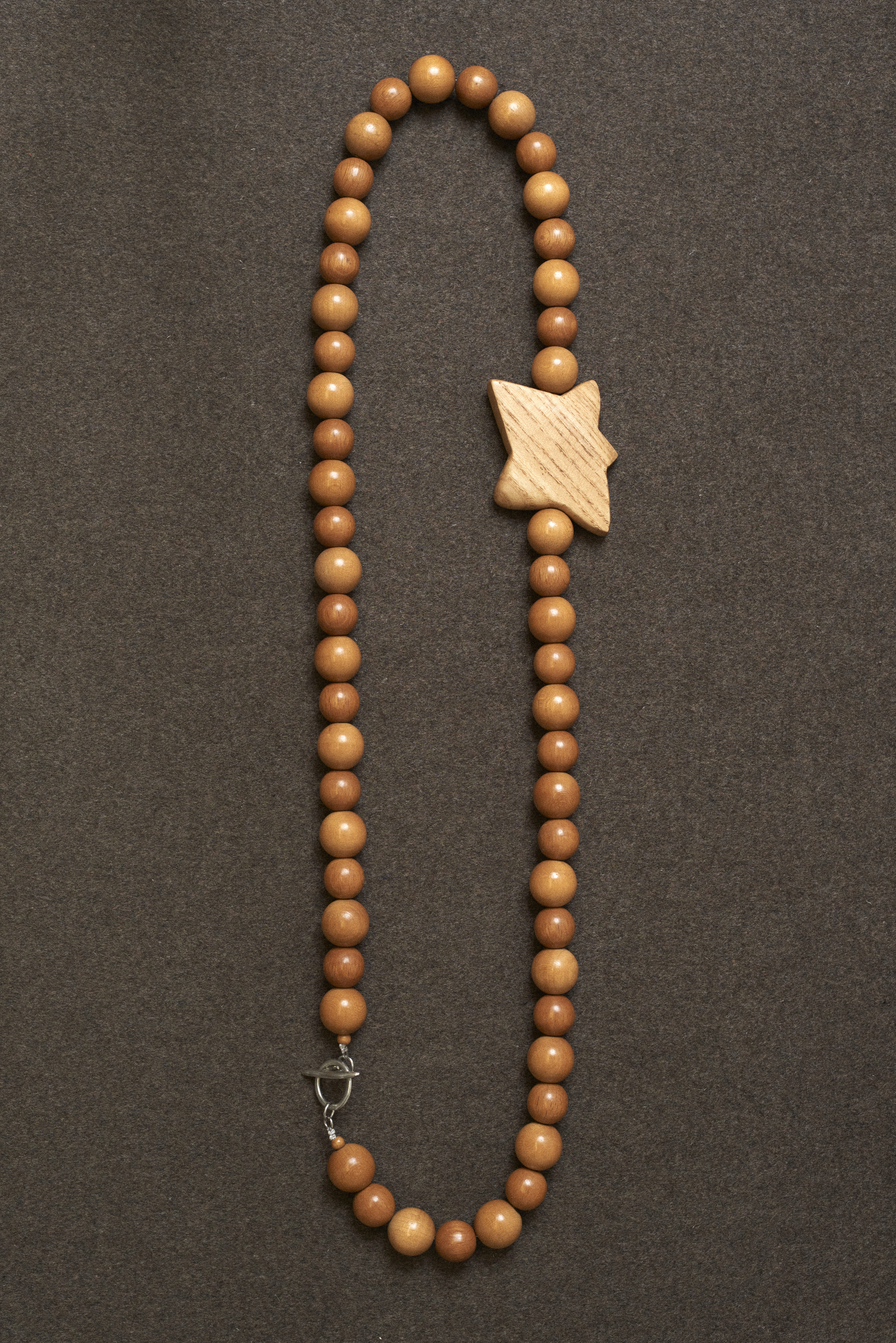 La ceinture Carthagène unique est composée de perles en bois vintage soigneusement sélectionnées, sublimées par une étoile en bois sculptée à la main par l'artiste Margot Lacombe . L'étoile en bois prend la place de la cuillère dans cette collaboration.