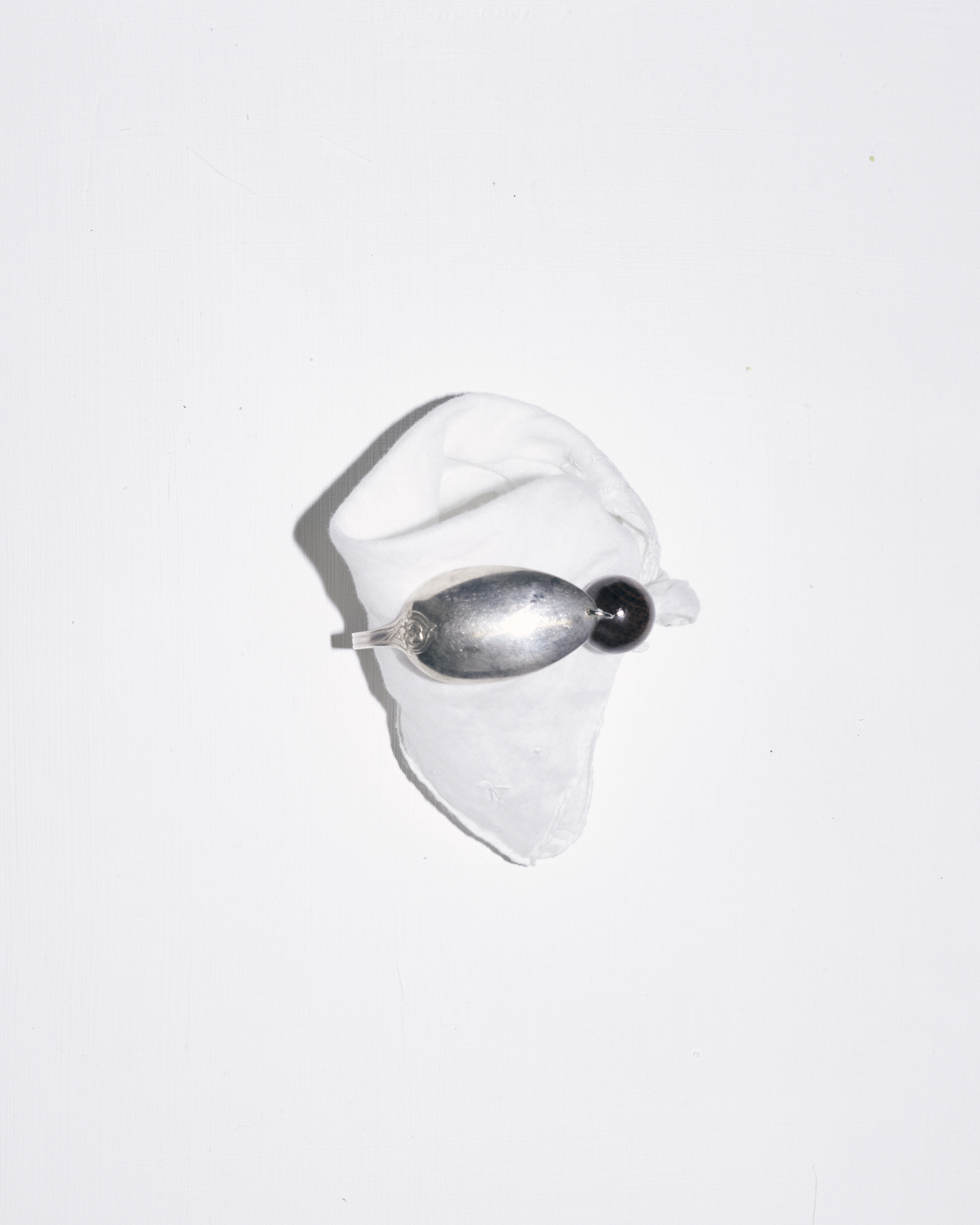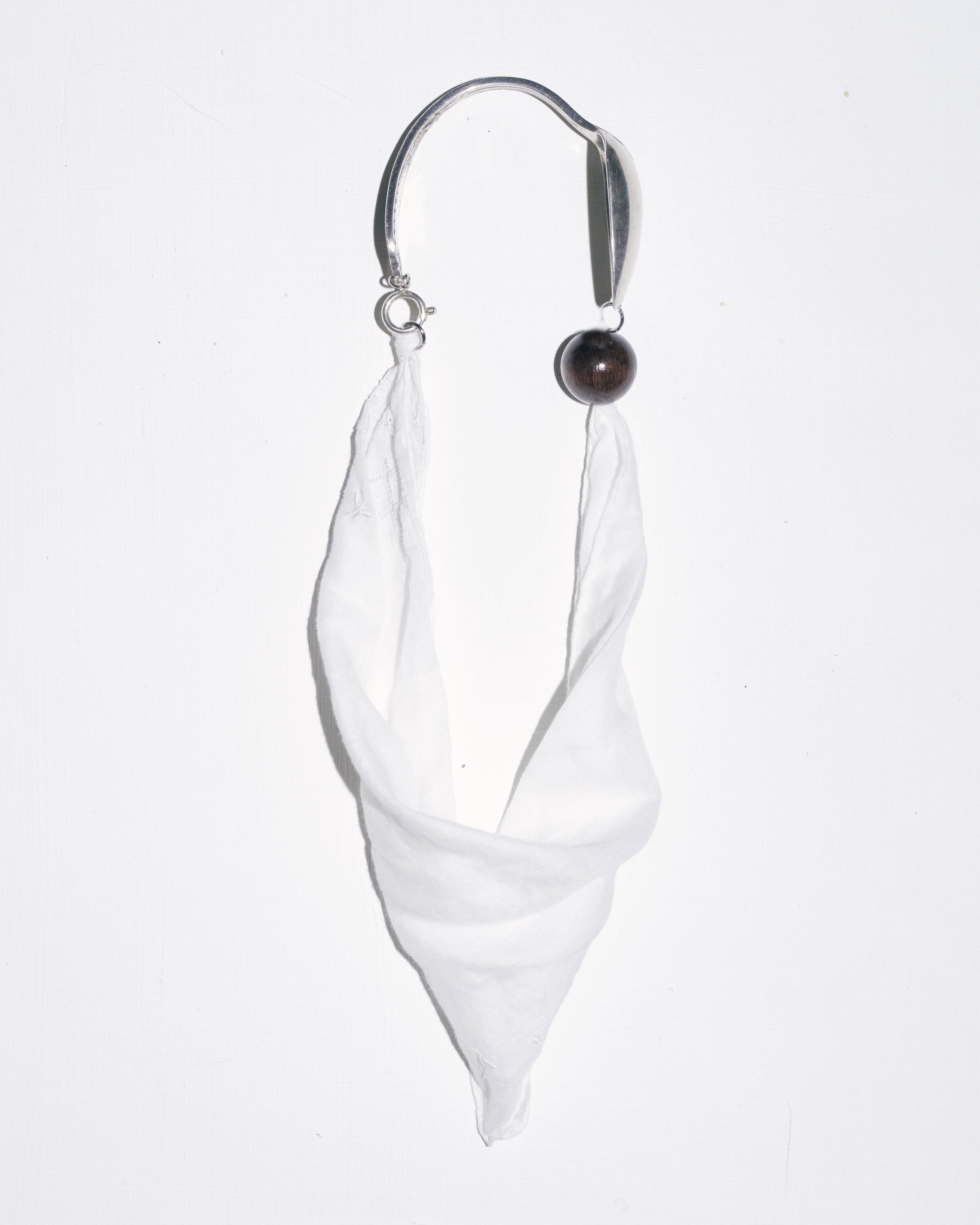 Le bracelet ZAGARE BLANC est composé d'une cuillère en argent, d'un petit mouchoir ancien en coton et d'une perle en bois vintage.