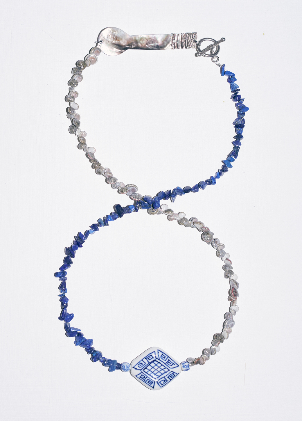 Les perles sont des coquillages gris, des perles bleues en lapis-lazuli vintage et une perle en céramique ancienne.