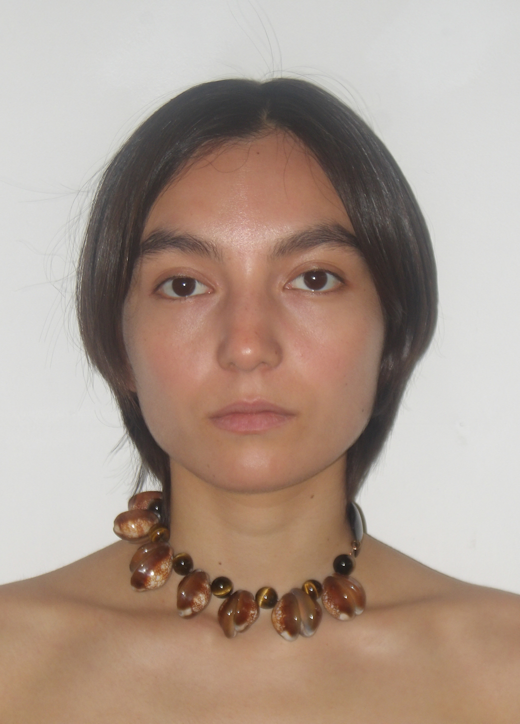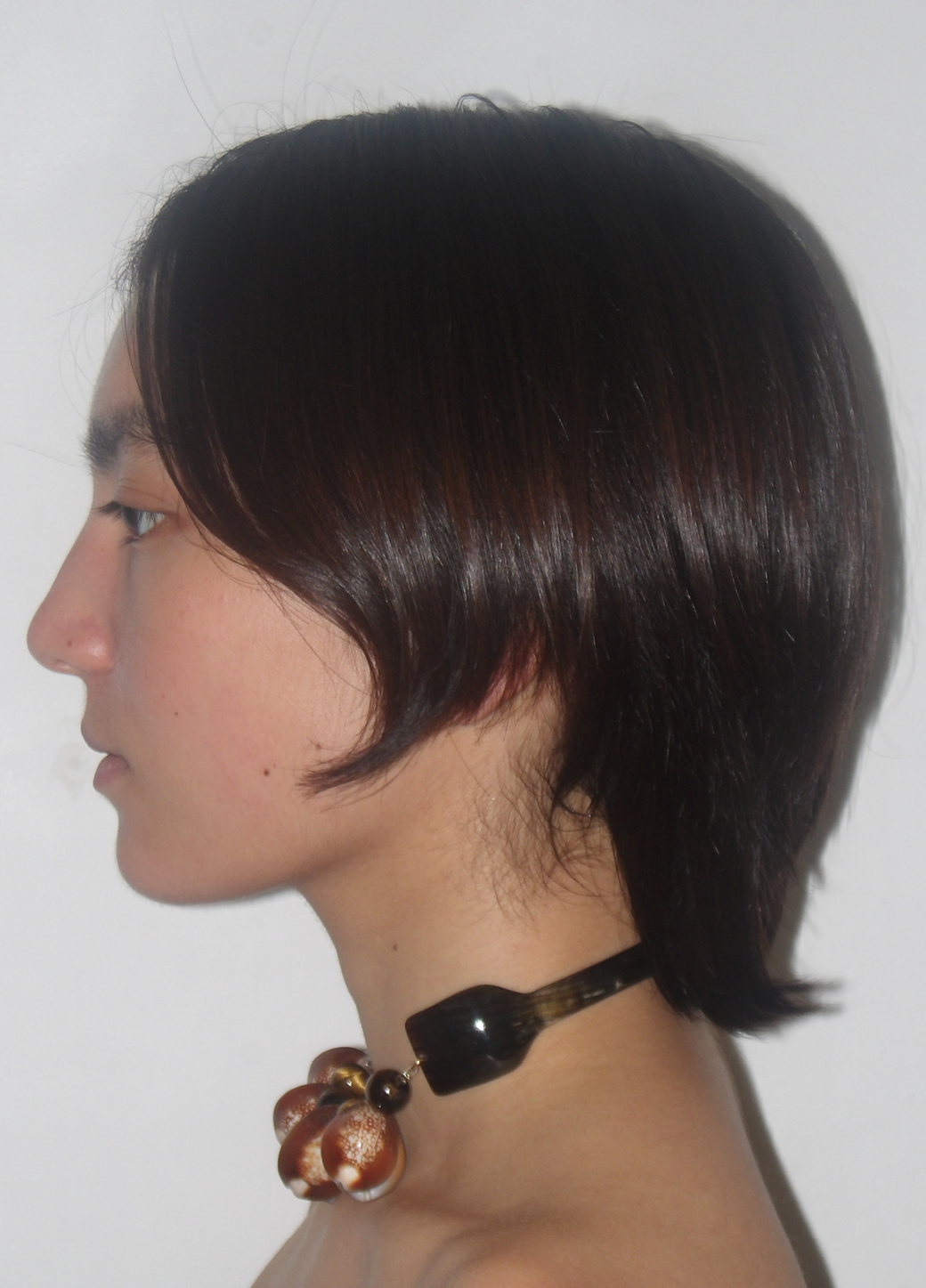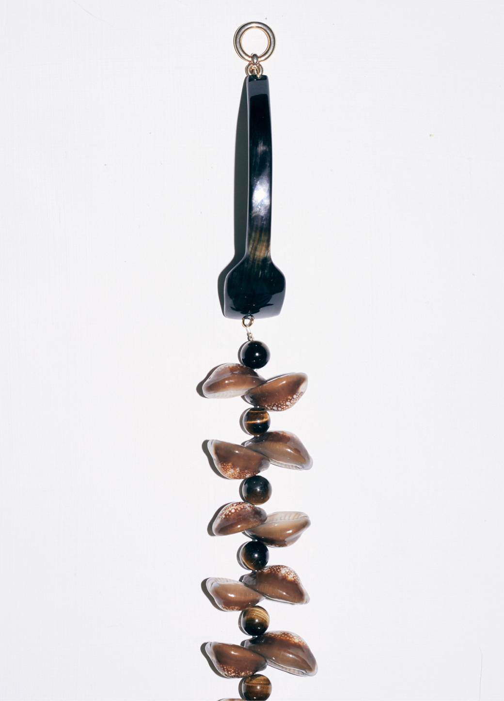 Le collier LO CAPO est composé d'une cuillère en corne de zébu au bout carré, provenant de Madagascar, acheté en seconde main. Elle a été tordue à Paris par un artisan.