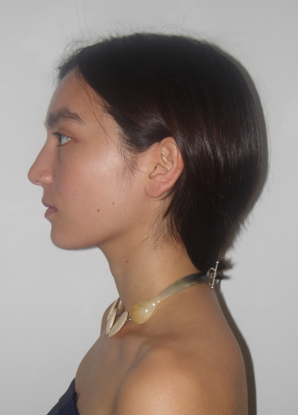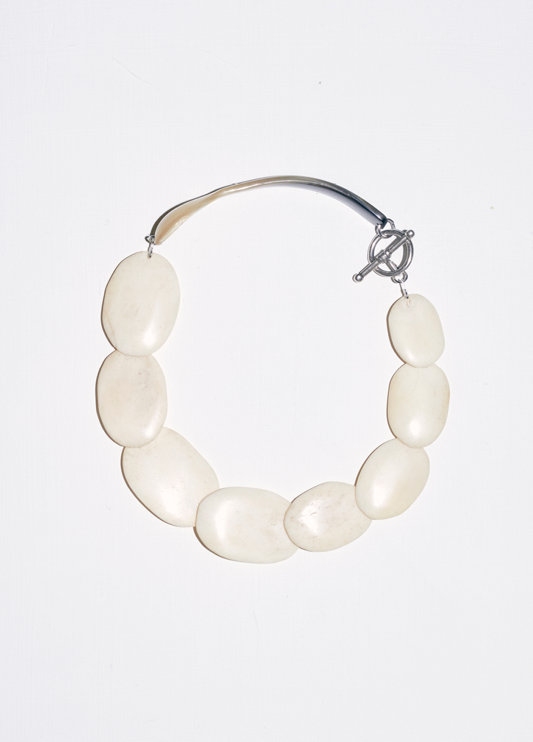 Le collier MONDELLO est composé d'une cuillère ancienne en corne de zébu. Elle a été tordue à Paris par un artisan.