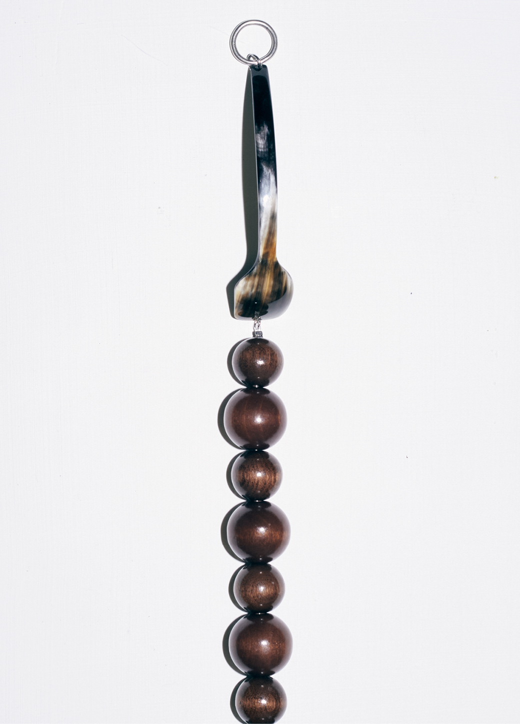 Le collier TURCHI est composé d'une cuillère en corne de zébu, provenant de Madagascar et achetée en seconde main. Elle a été tordue à Paris par un artisan.