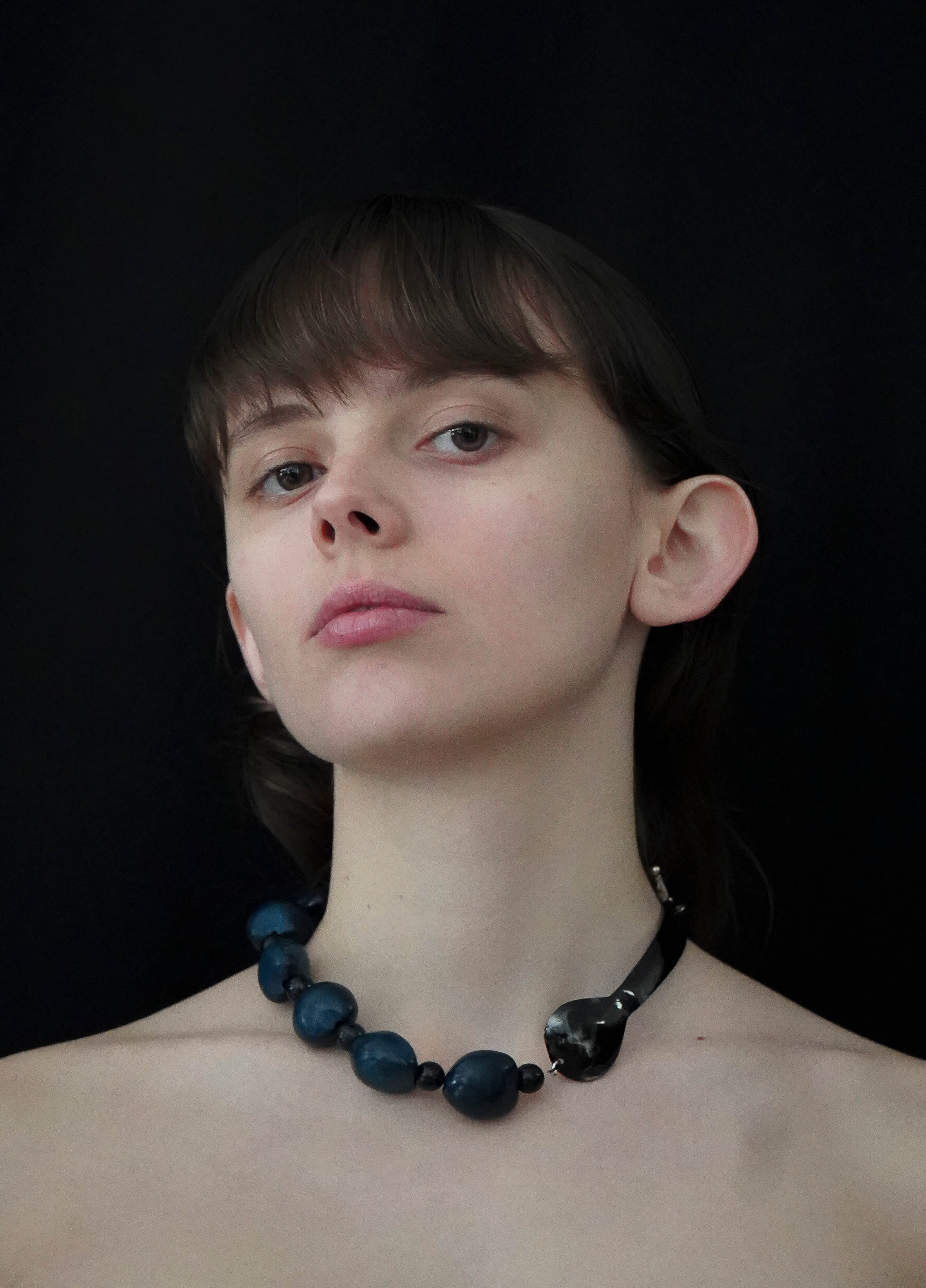 Le collier ERCOLANO BLEU est composé d'une cuillère à caviar en corne de zébu, tordue à Paris par un artisan. Les perles sont en acétate bleu vintage.