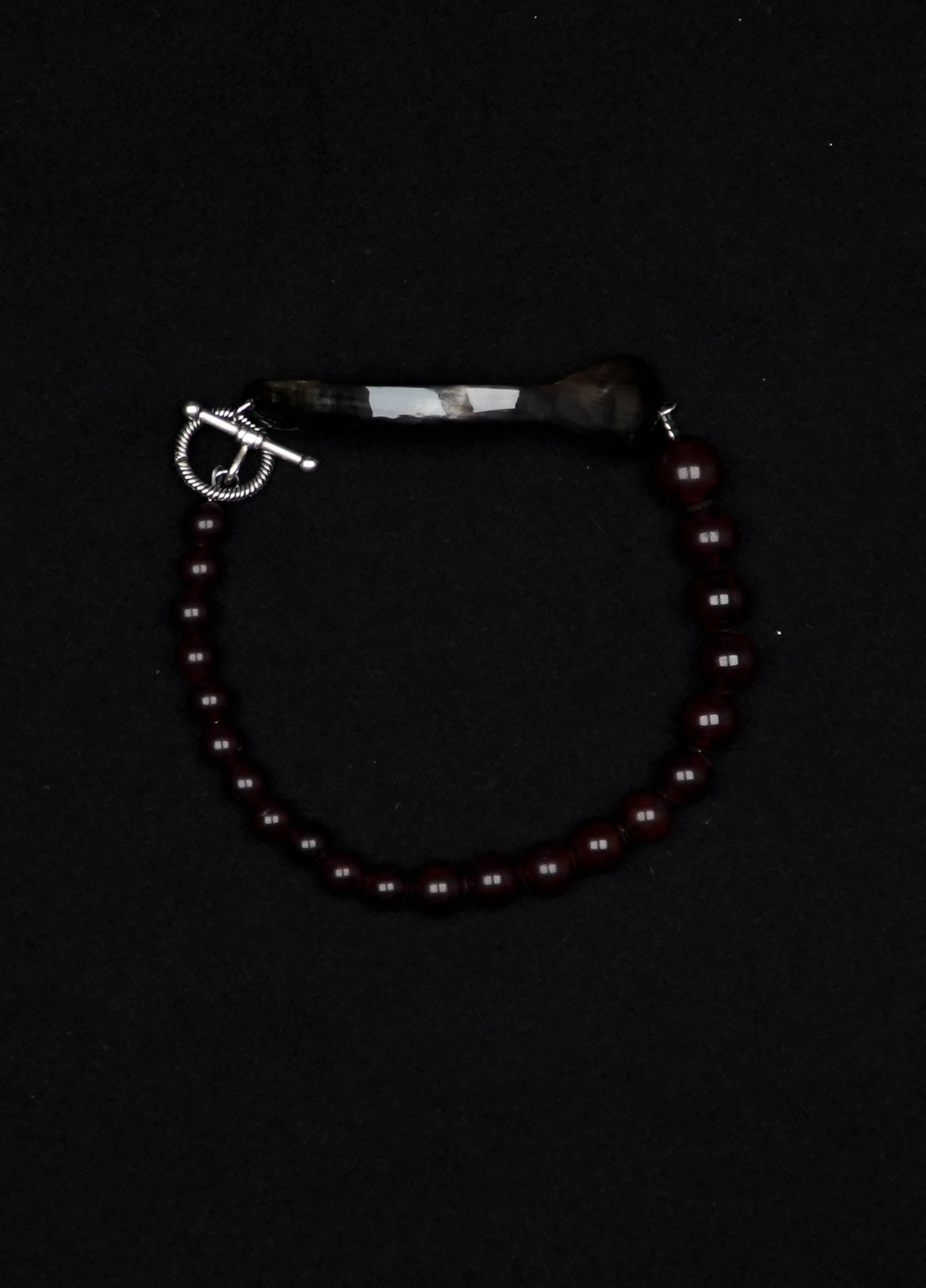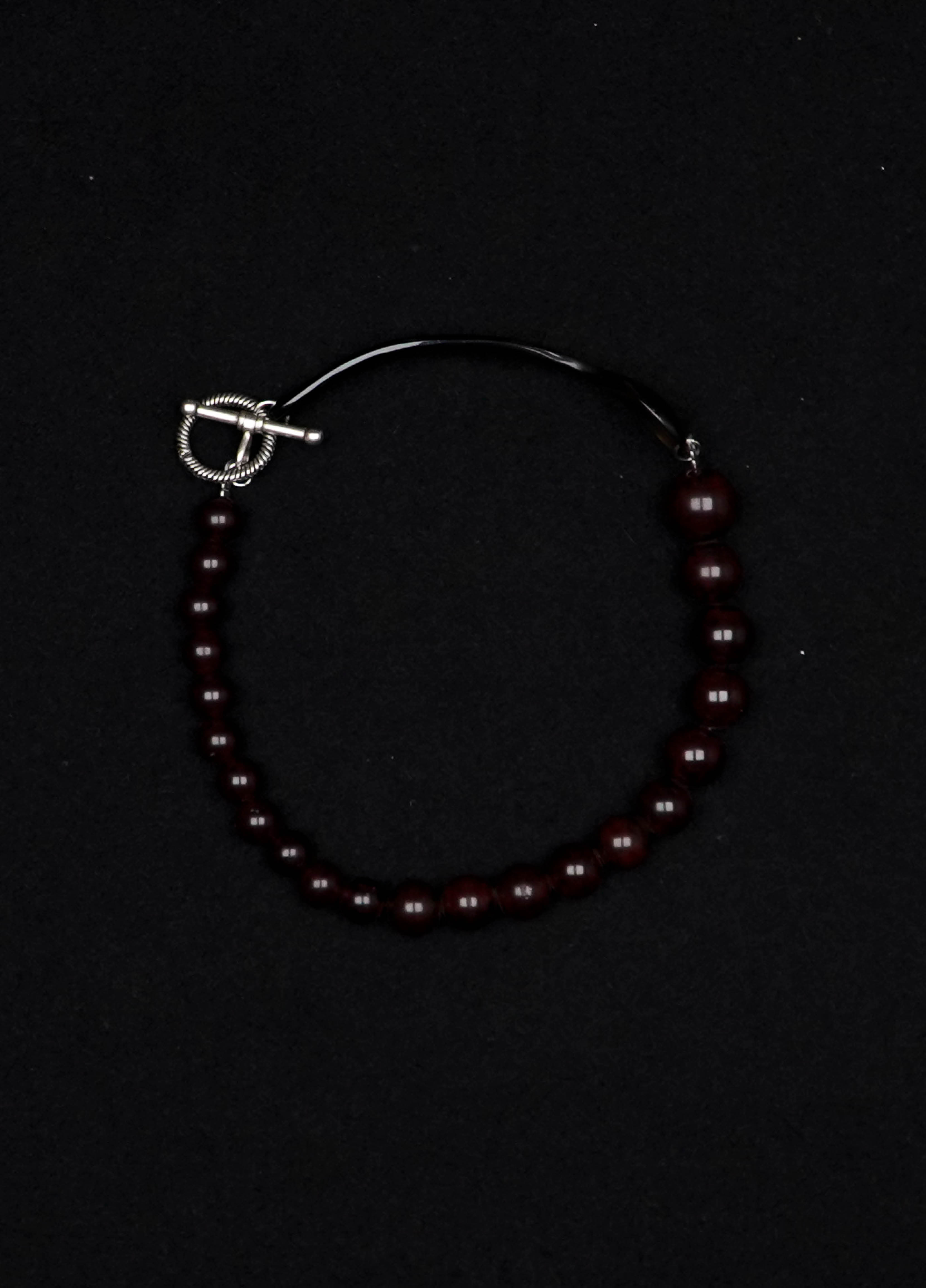 Le collier IMPERIA est composé d’une cuillère à caviar en corne de zébu, tordue à Paris par un artisan. Les perles sont en acétate vintage.