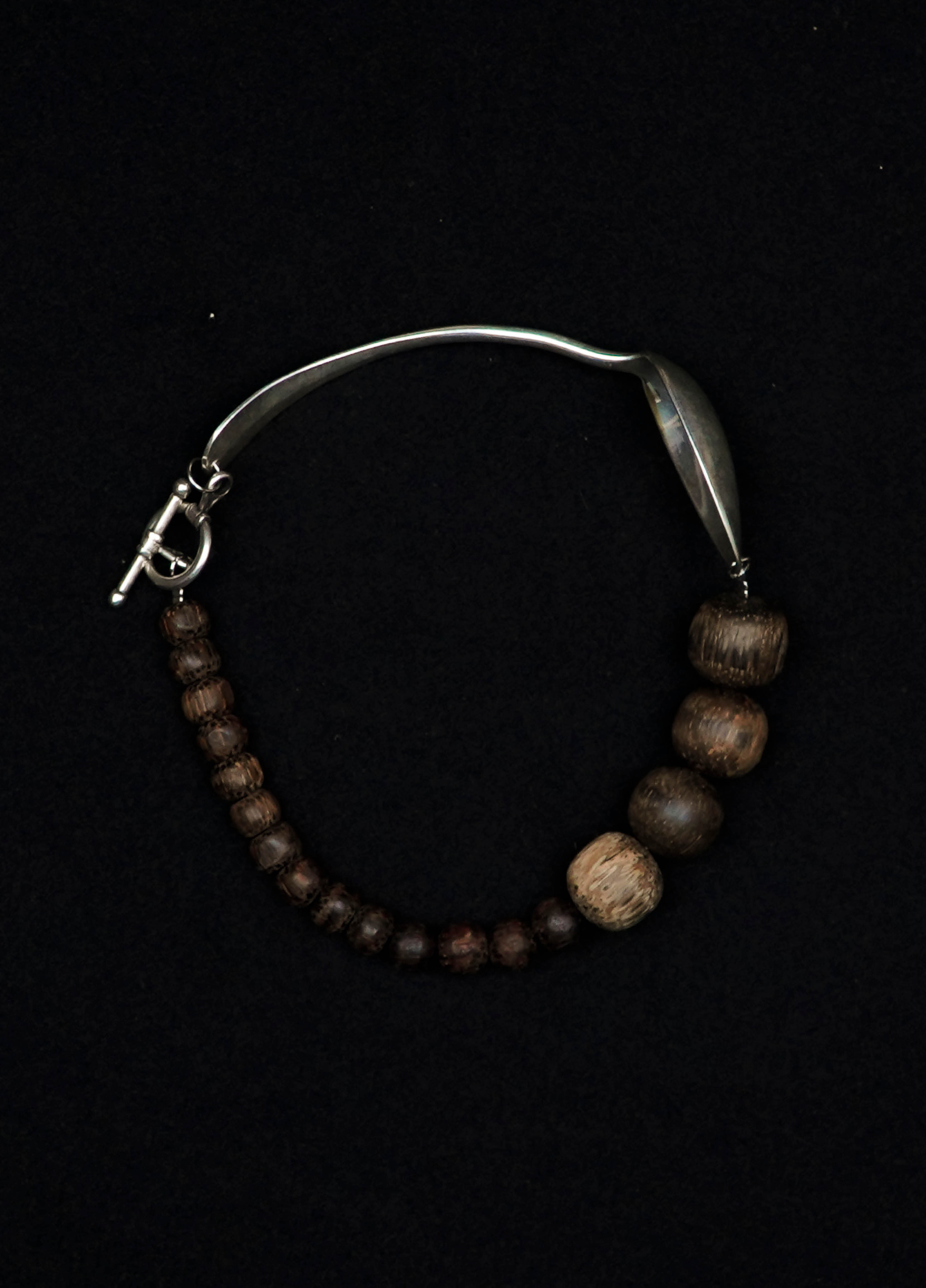 Le collier MATERA est composé d'une cuillère ancienne en argent et de perles vintage en bois.