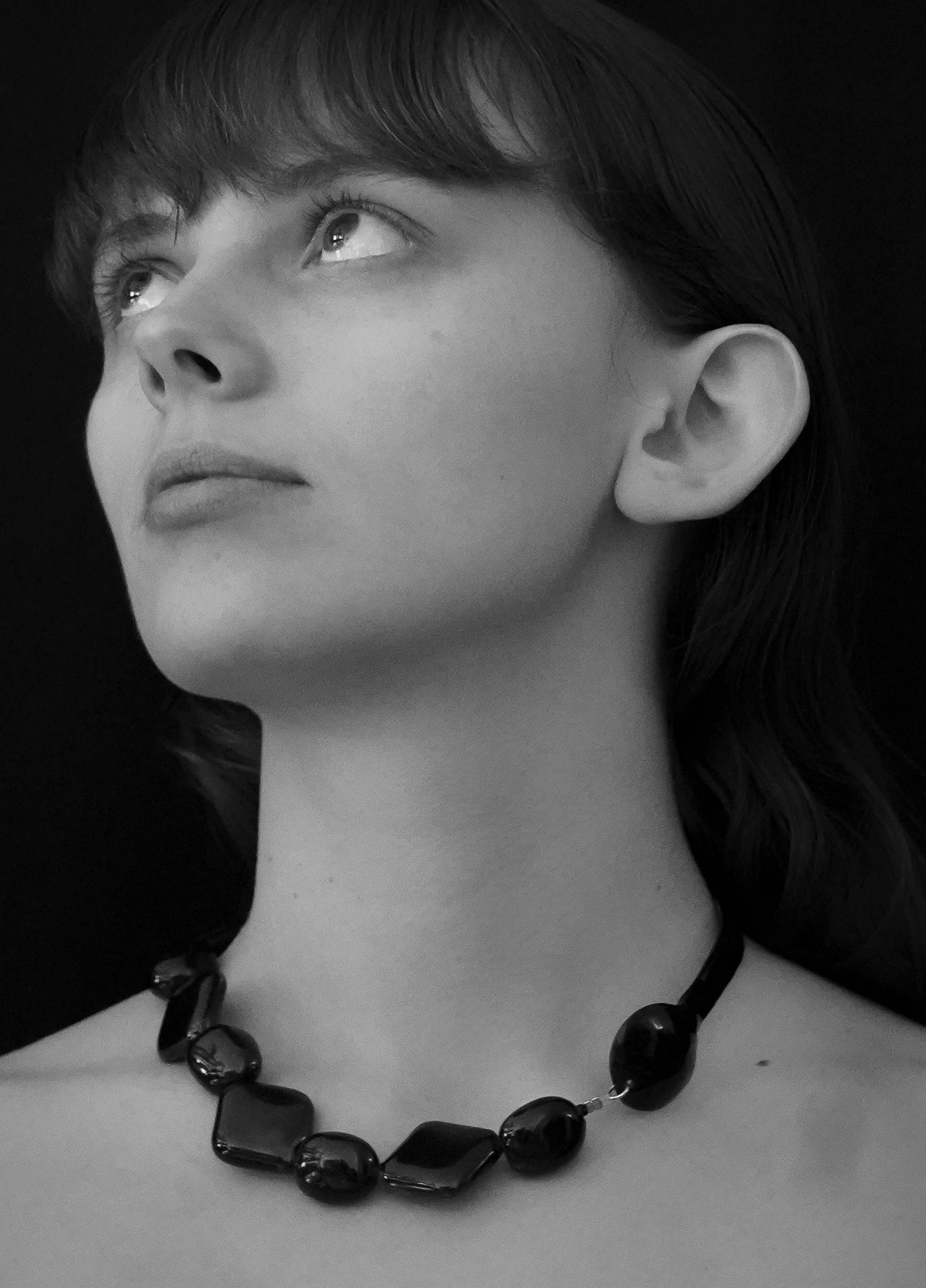 Le collier PADOUE est composé d'une cuillère à caviar en corne de zébu, tordue à Paris par un artisan. Les perles sont en céramique noire brillante.