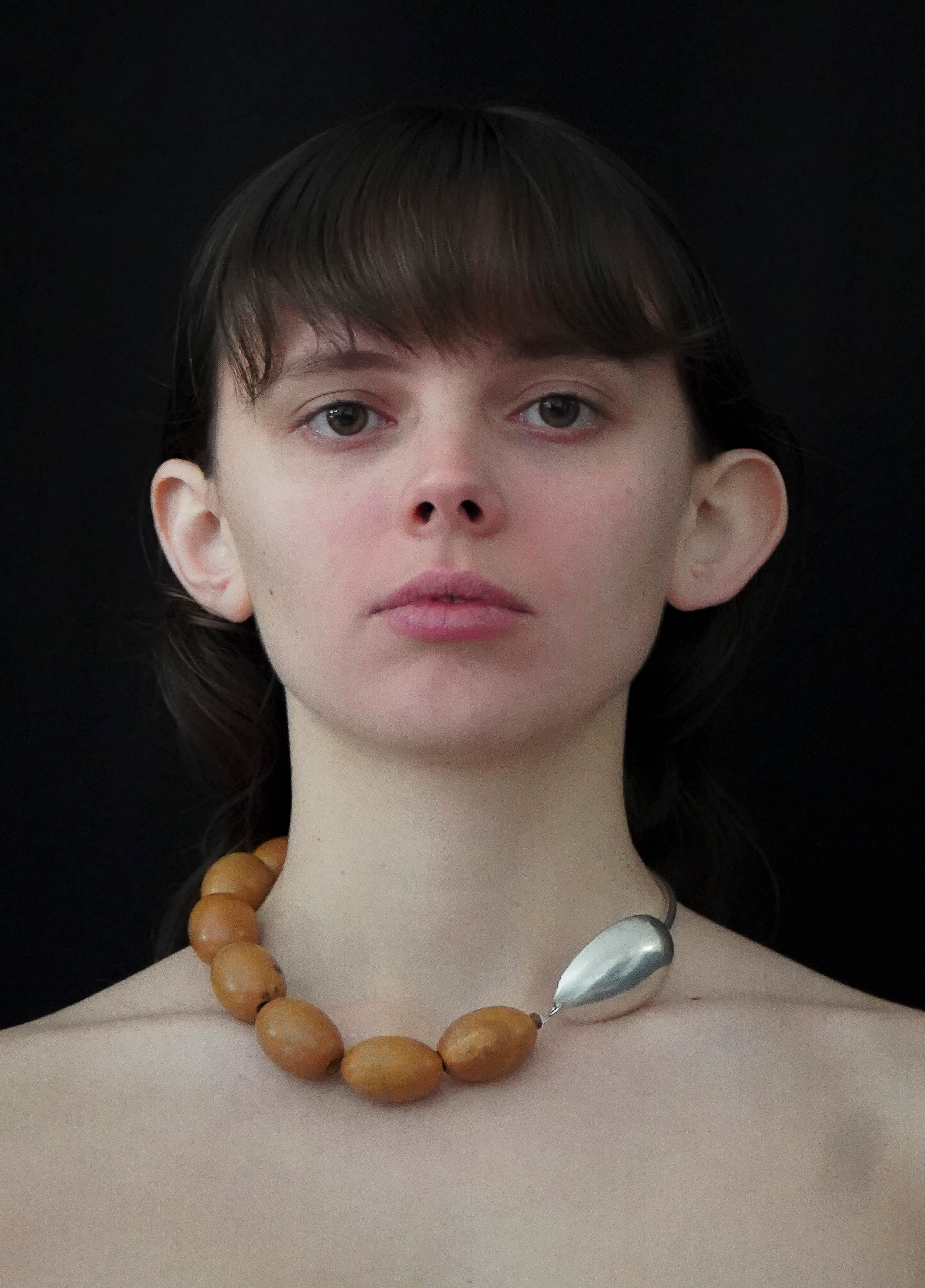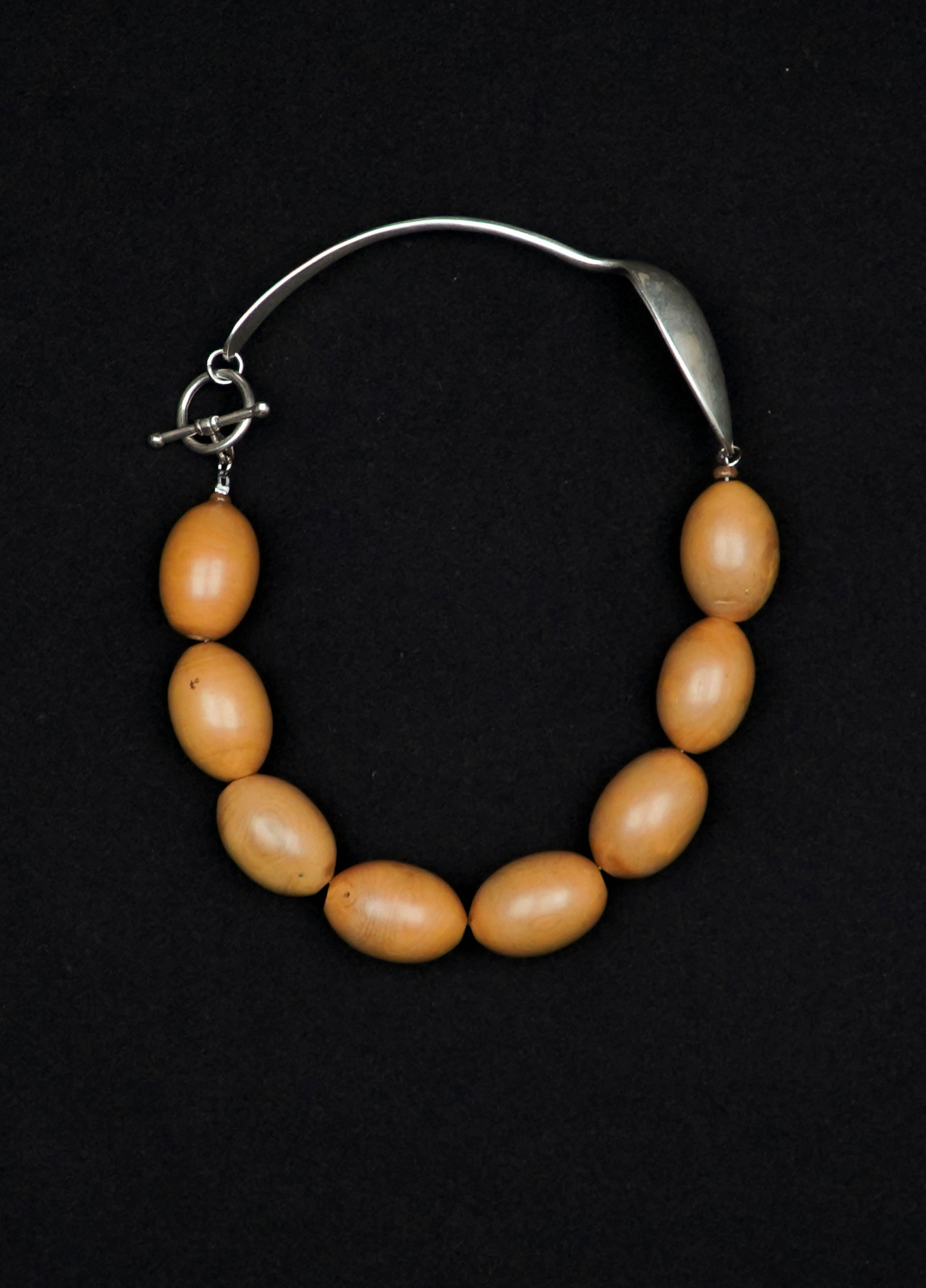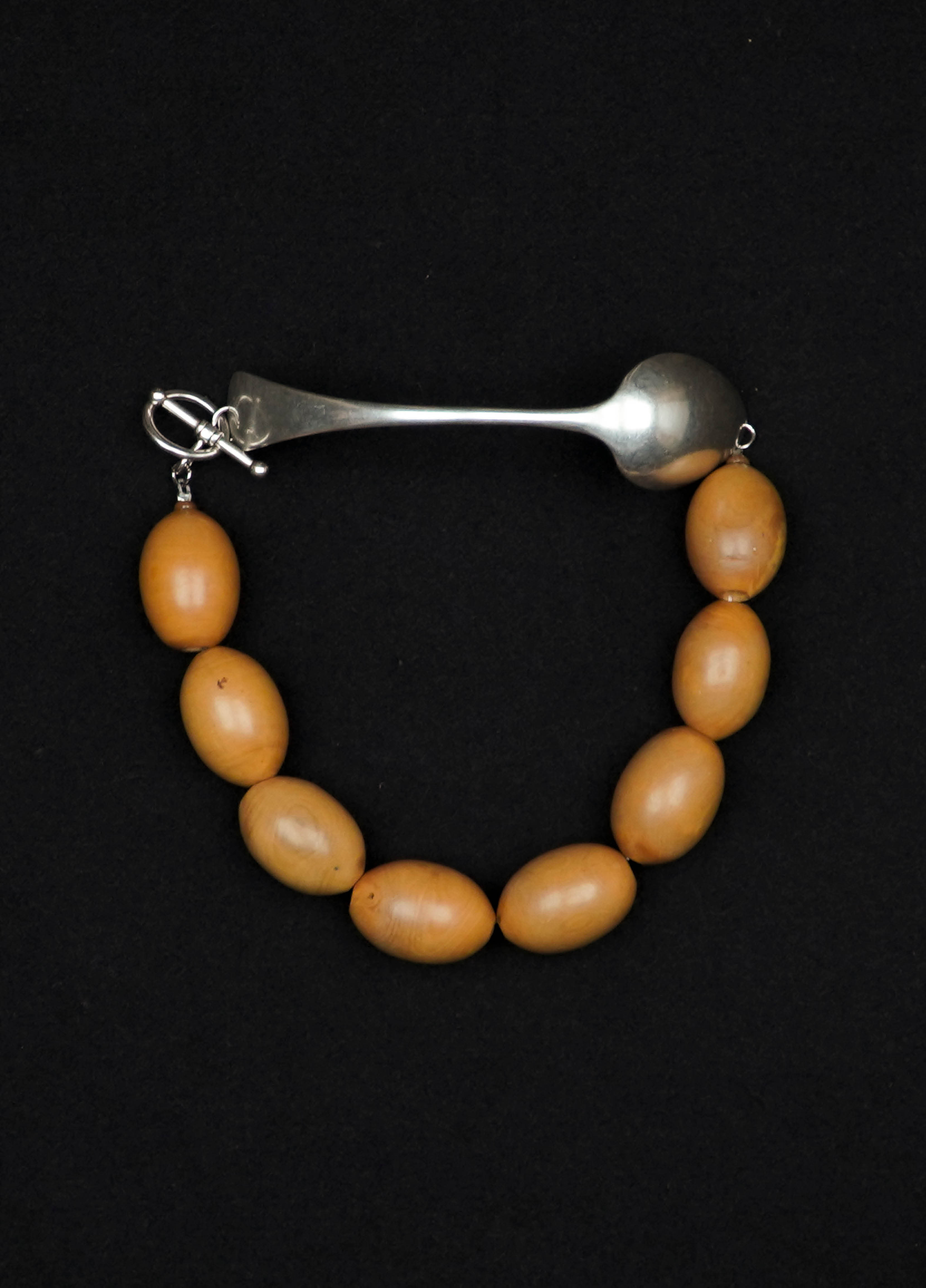Le collier PÉROUSE est composé d'une cuillère ancienne en argent. Les perles sont en bois ancien.