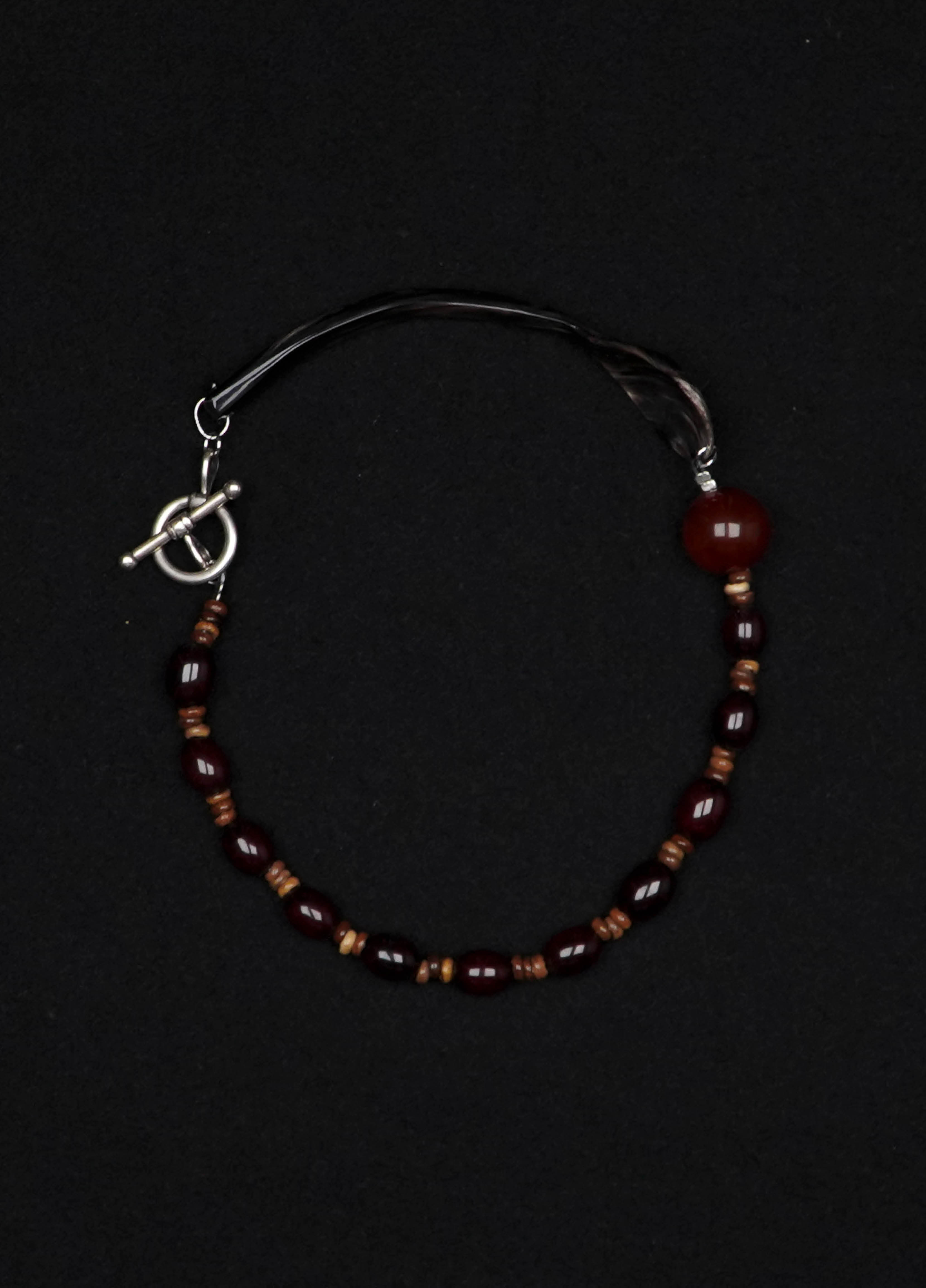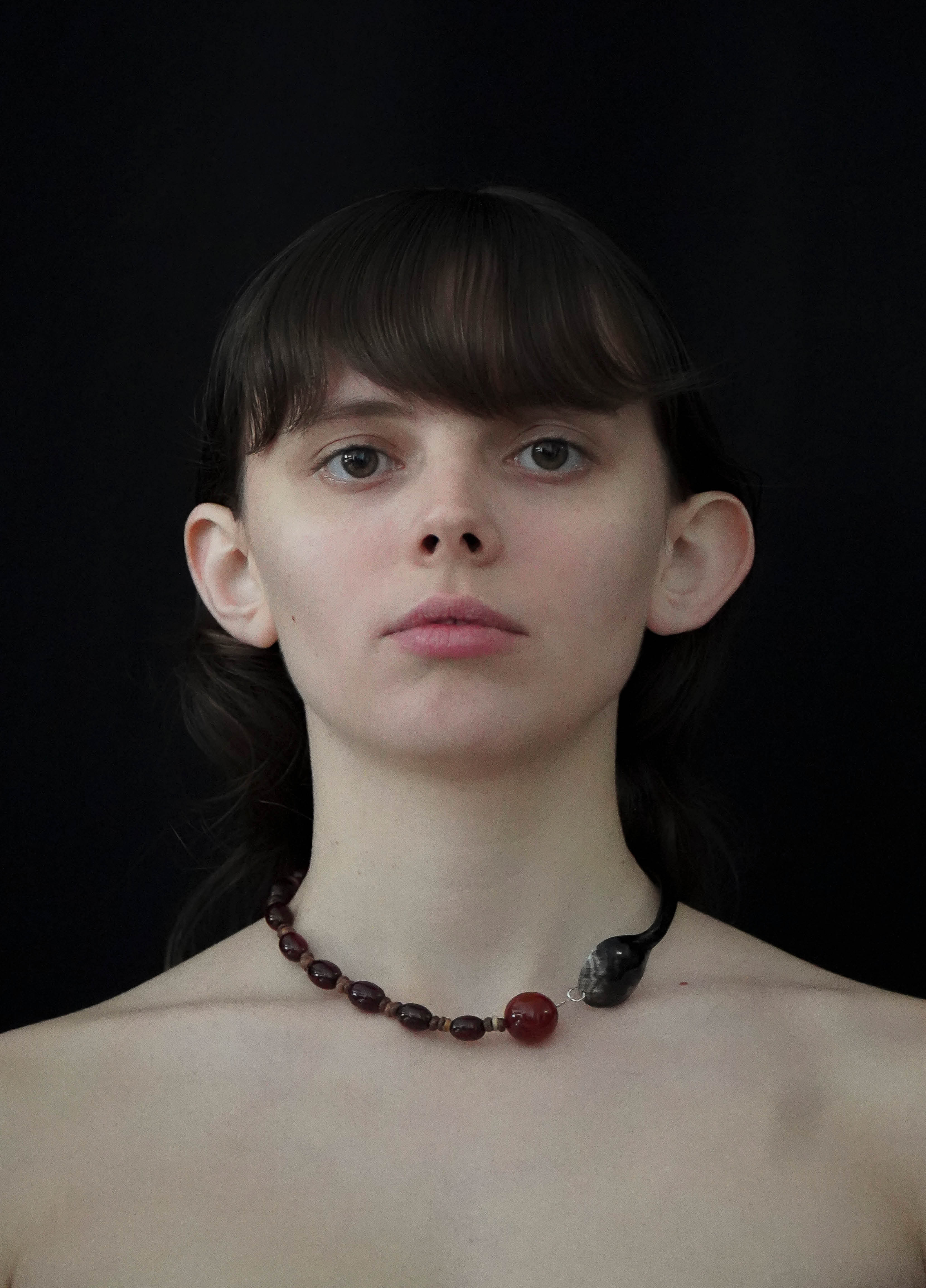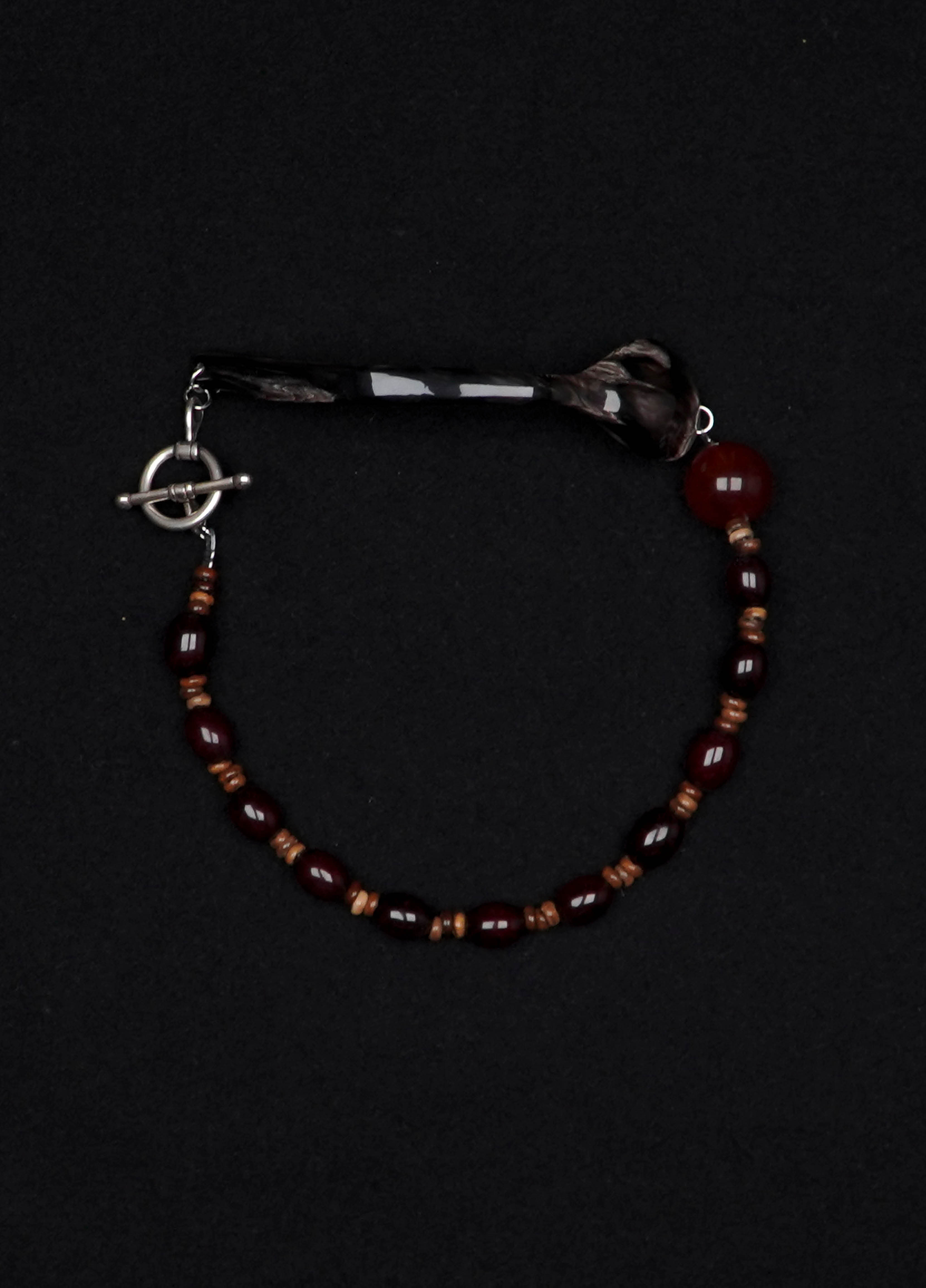 Le collier POTENZA est composé d'une cuillère à caviar en corne de zébu, tordue à Paris par un artisan. Les perles sont en acétate vintage.