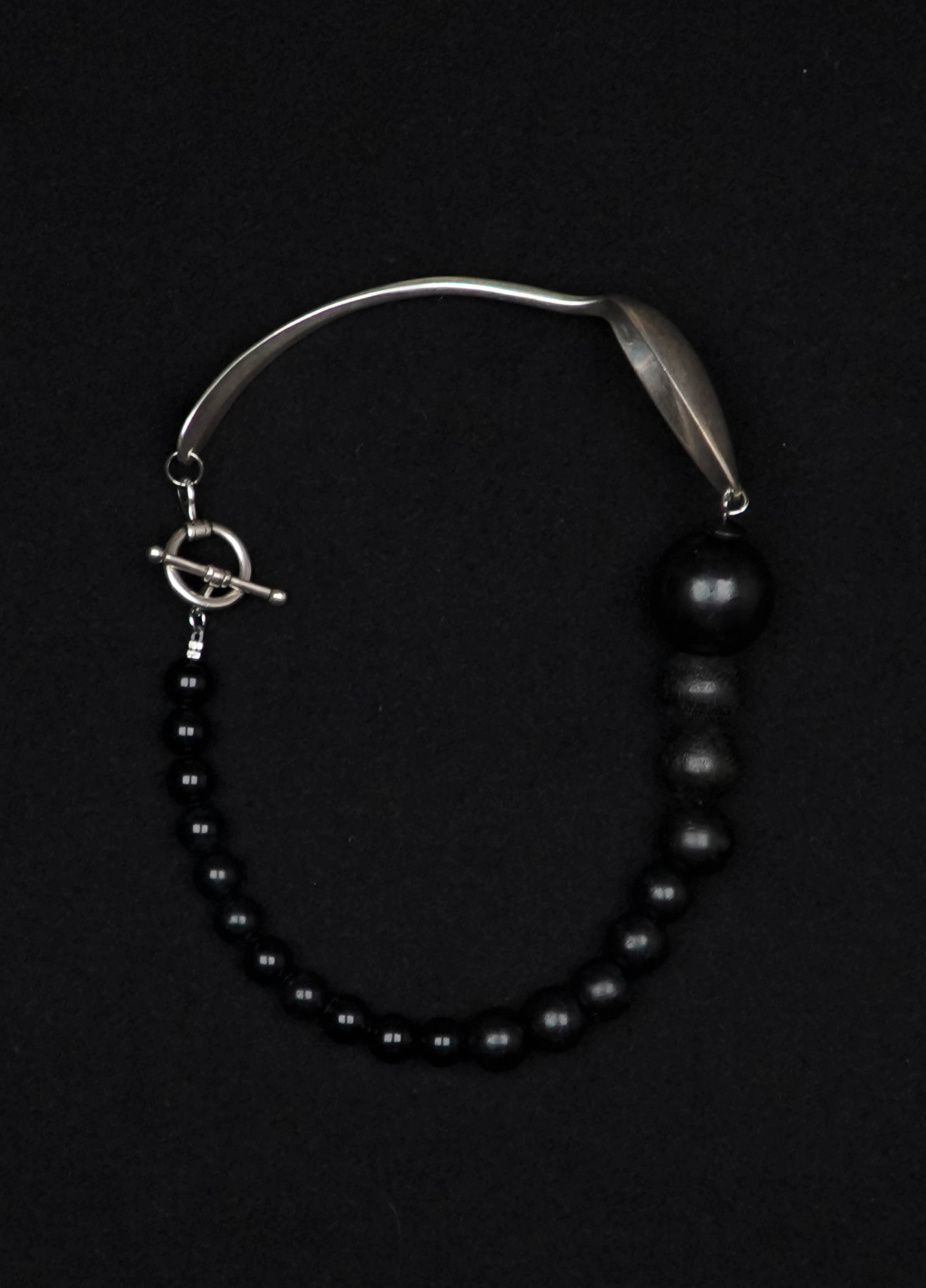 Le collier TRIESTE est composé d'une cuillère ancienne en argent et de perles vintage en bois noir.