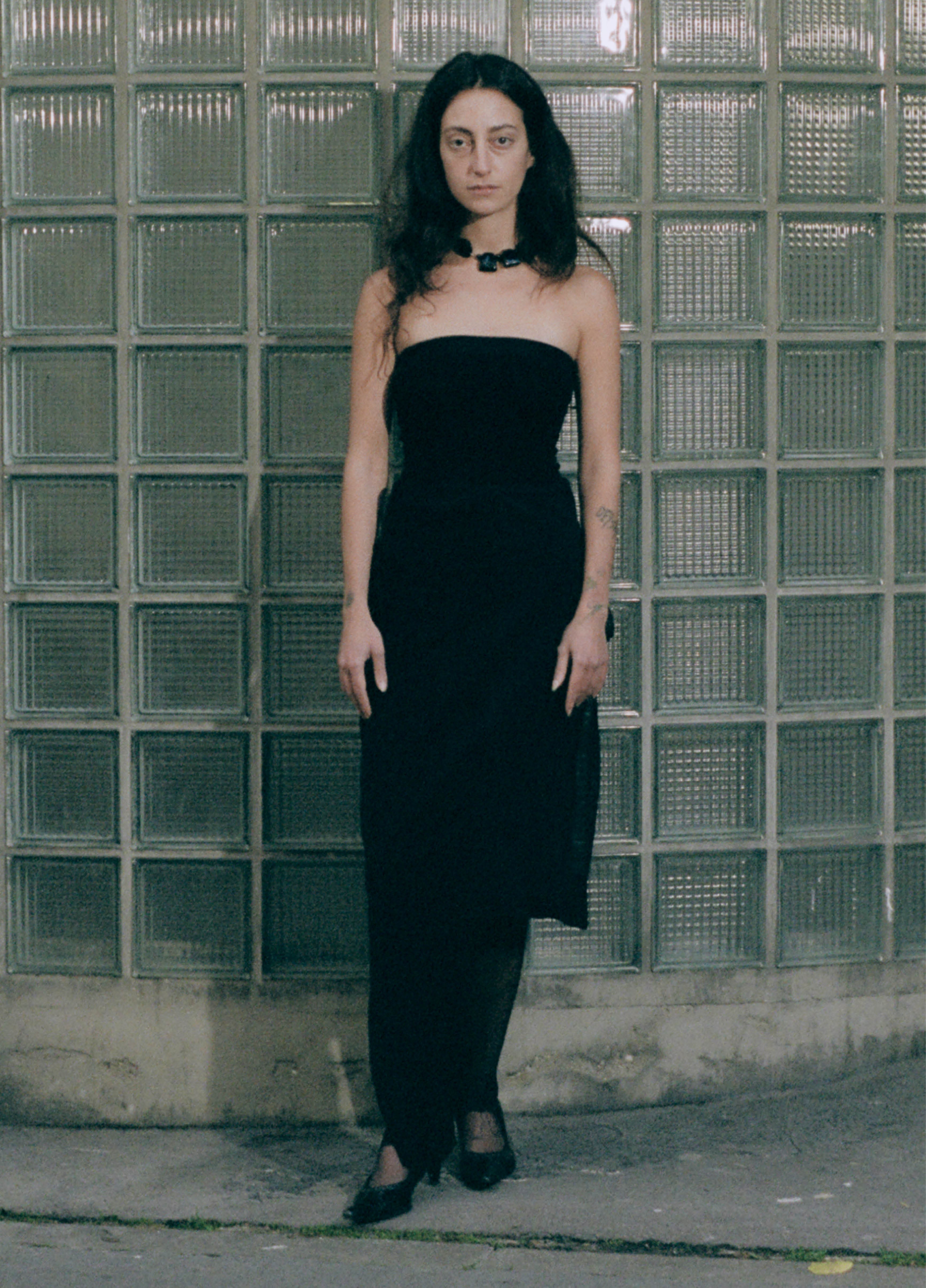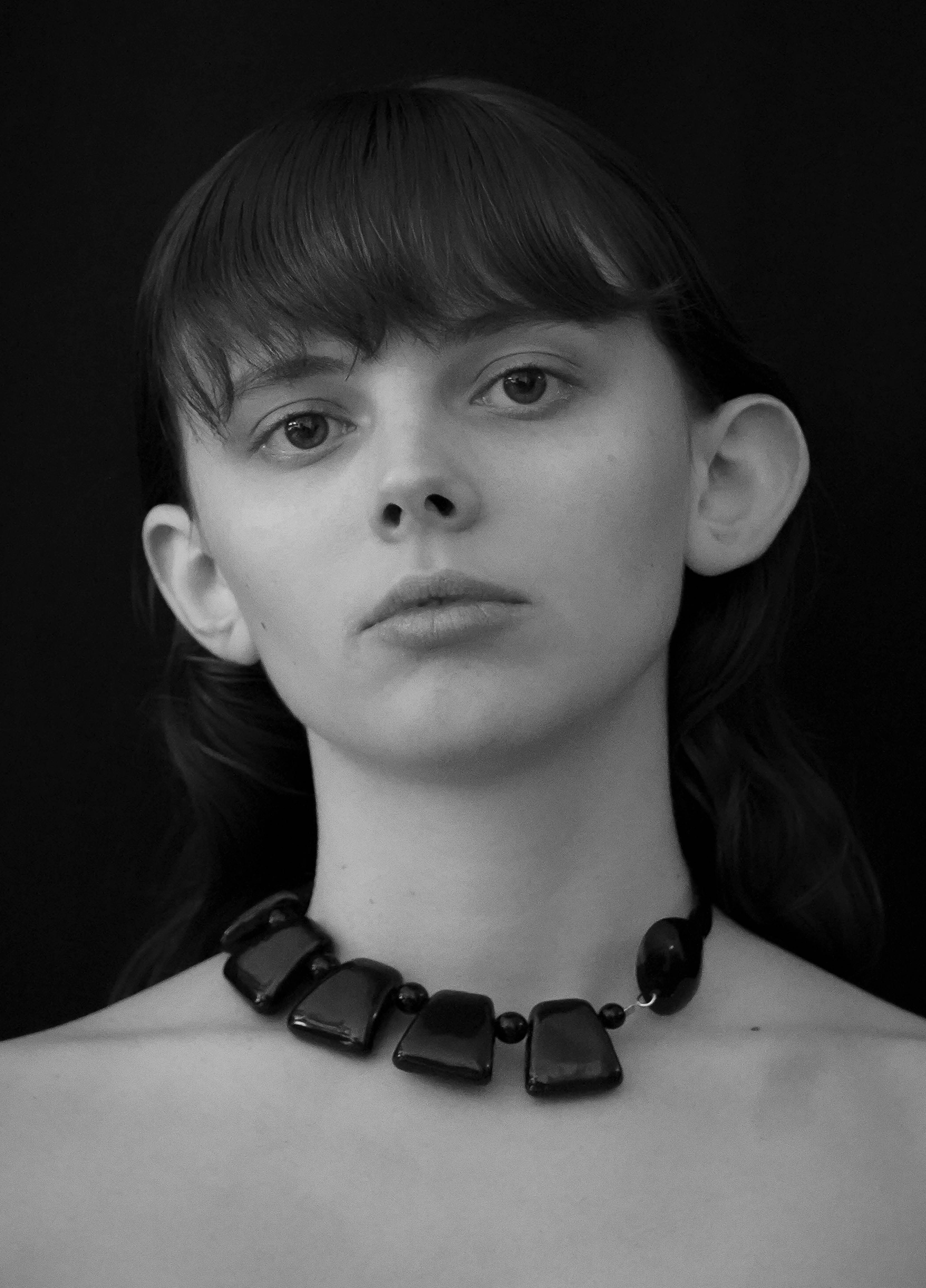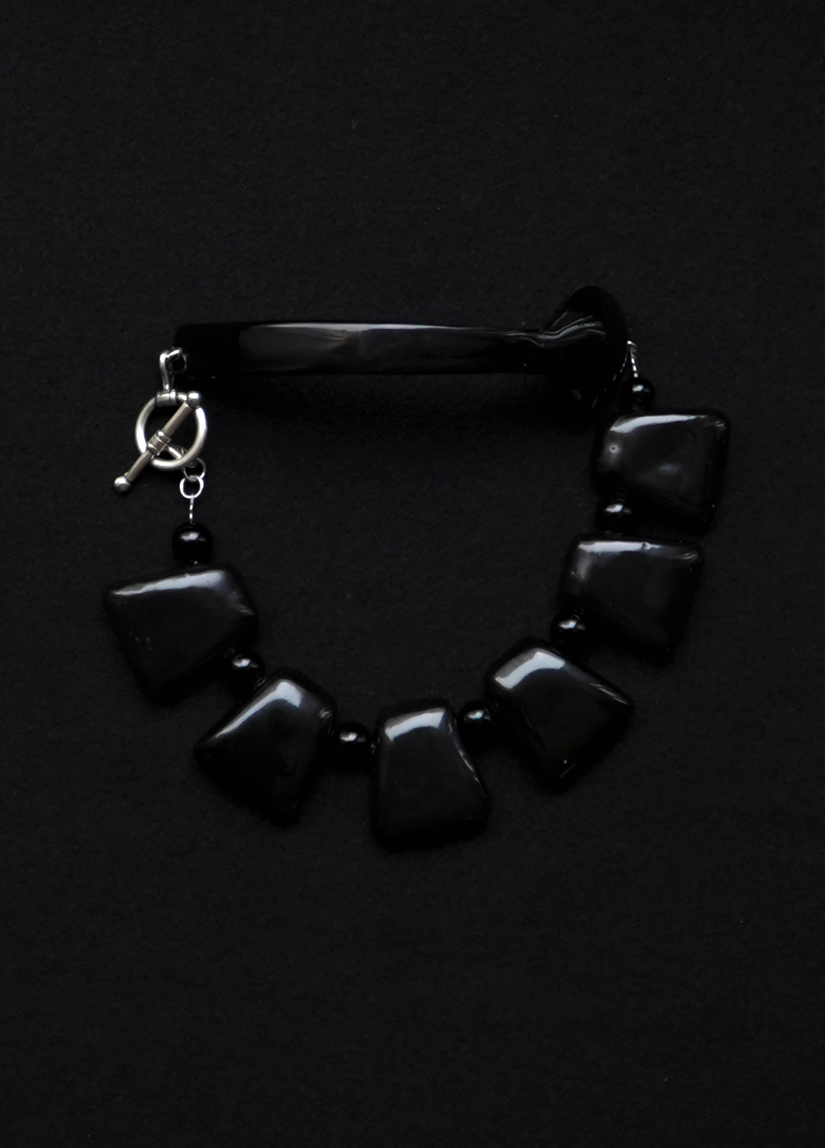Le collier VÉNÉTIE est composé d'une cuillère à caviar en corne de zébu, tordue à Paris par un artisan. Les perles sont en céramique noire brillante.