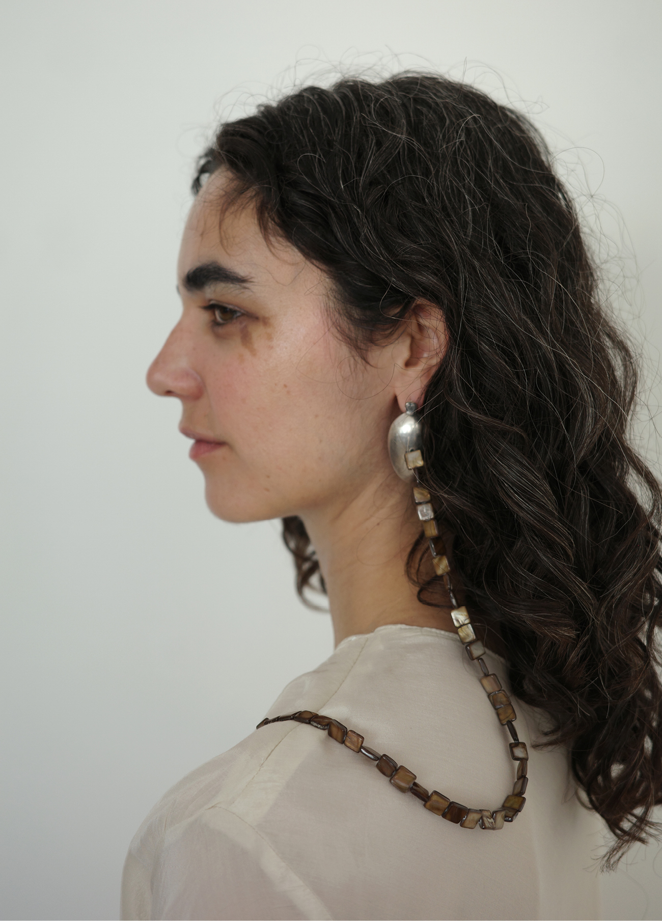 La boucle d’oreille Sperlonga est composée d’une tête de cuillère ancienne en argent. Les perles vintages sont en nacre.