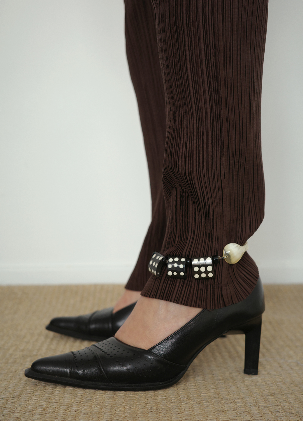 Le bracelet de cheville Uzzo est composé d’une cuillère ancienne en corne de zébu, provenant de Madagascar et tordue à Paris par un artisan. Les perles vintage sont en corne.