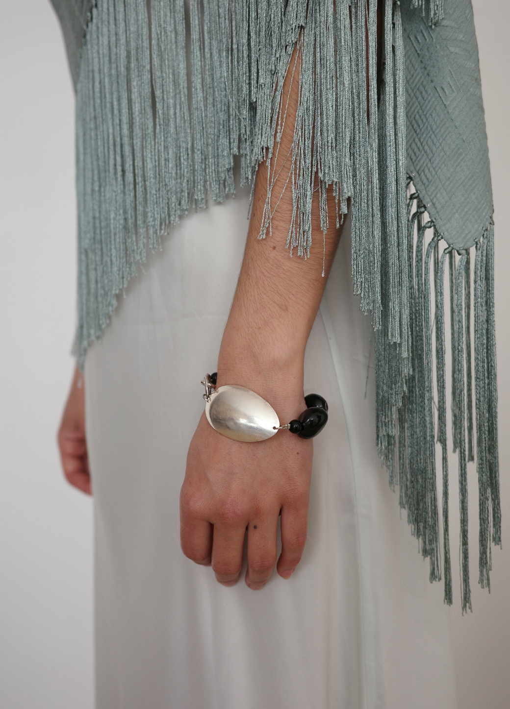 Le bracelet Gaeta noir est composé d’une tête de cuillère ancienne en argent. Les perles sont vintage, en acétate