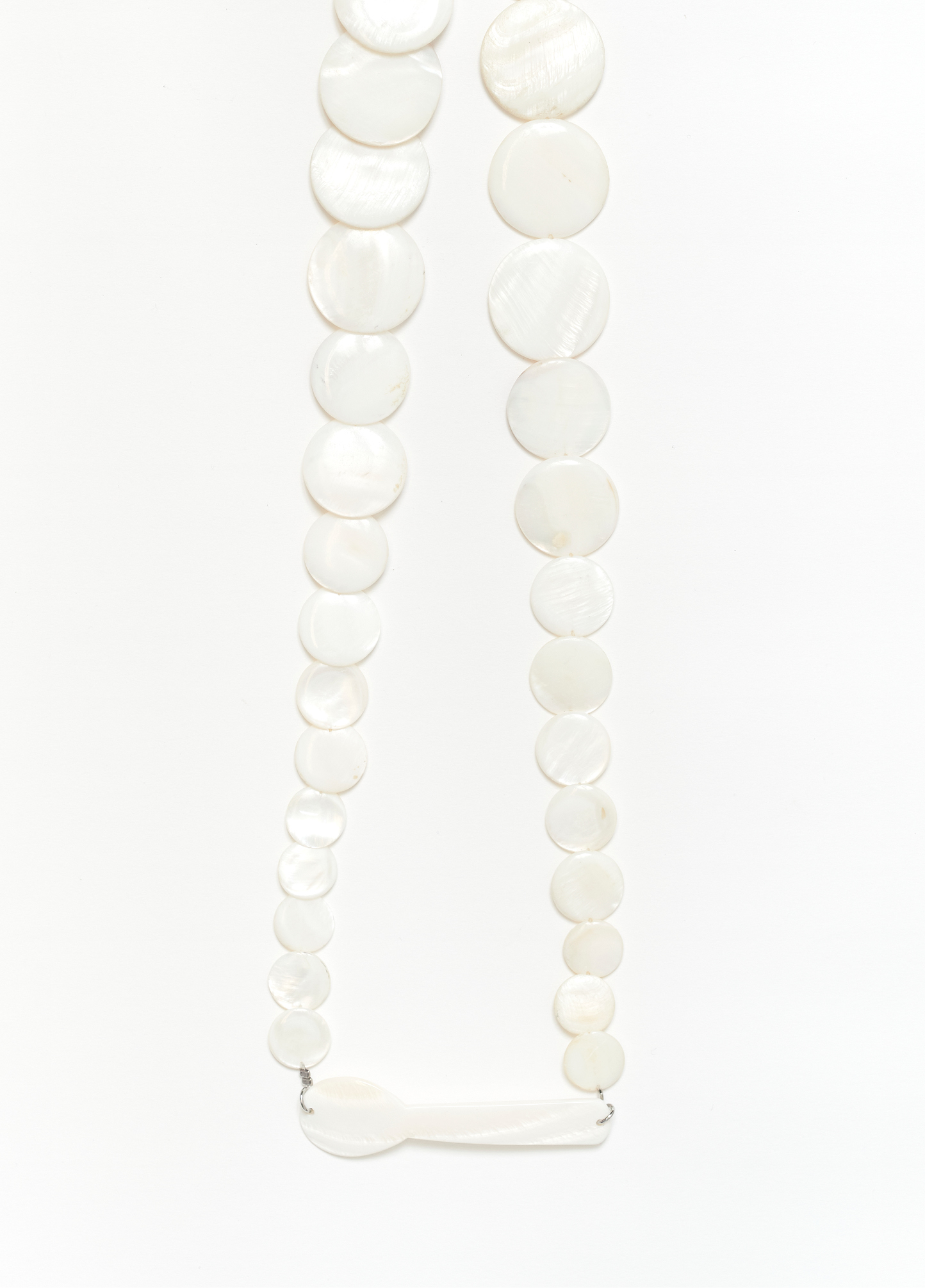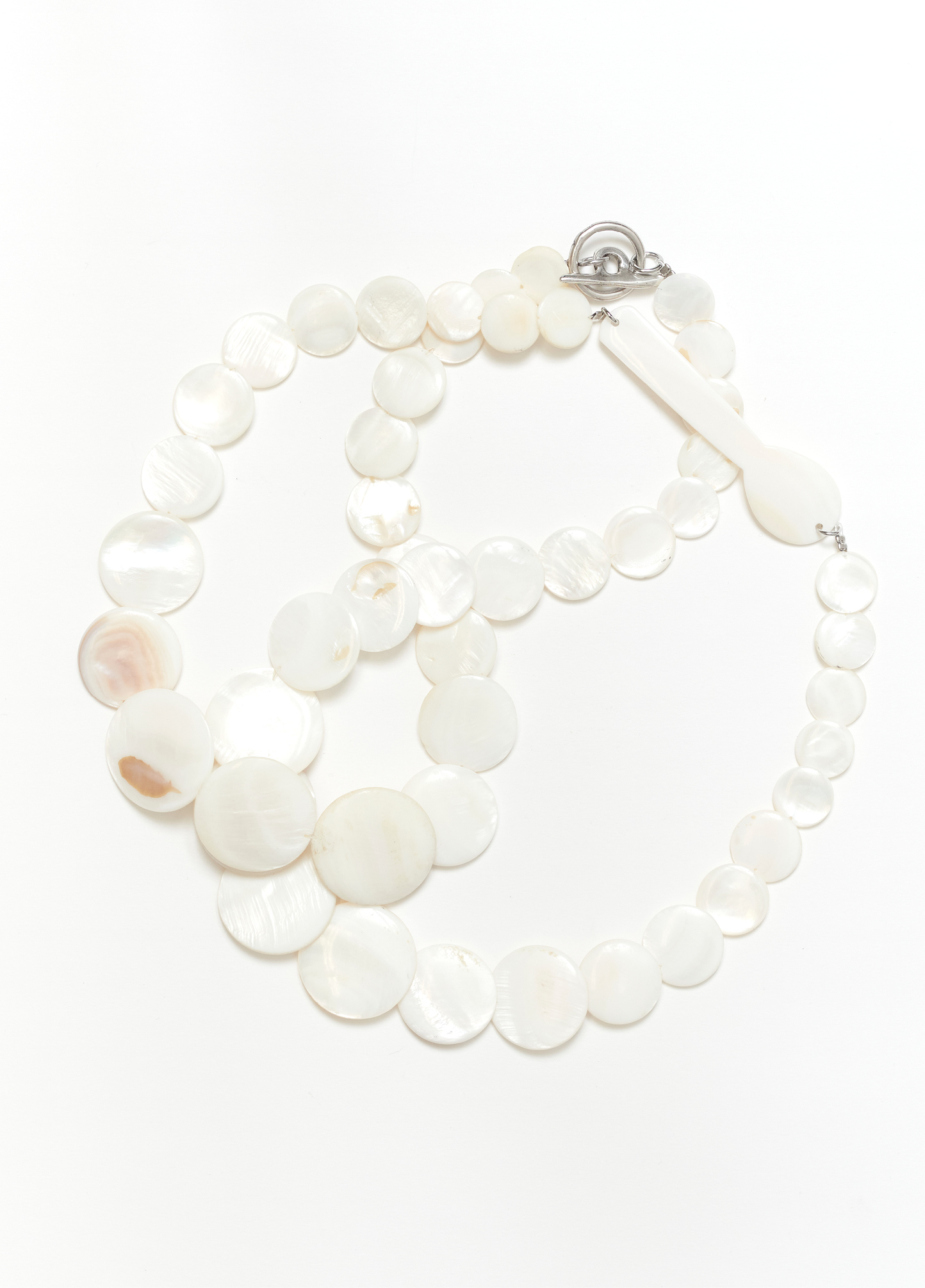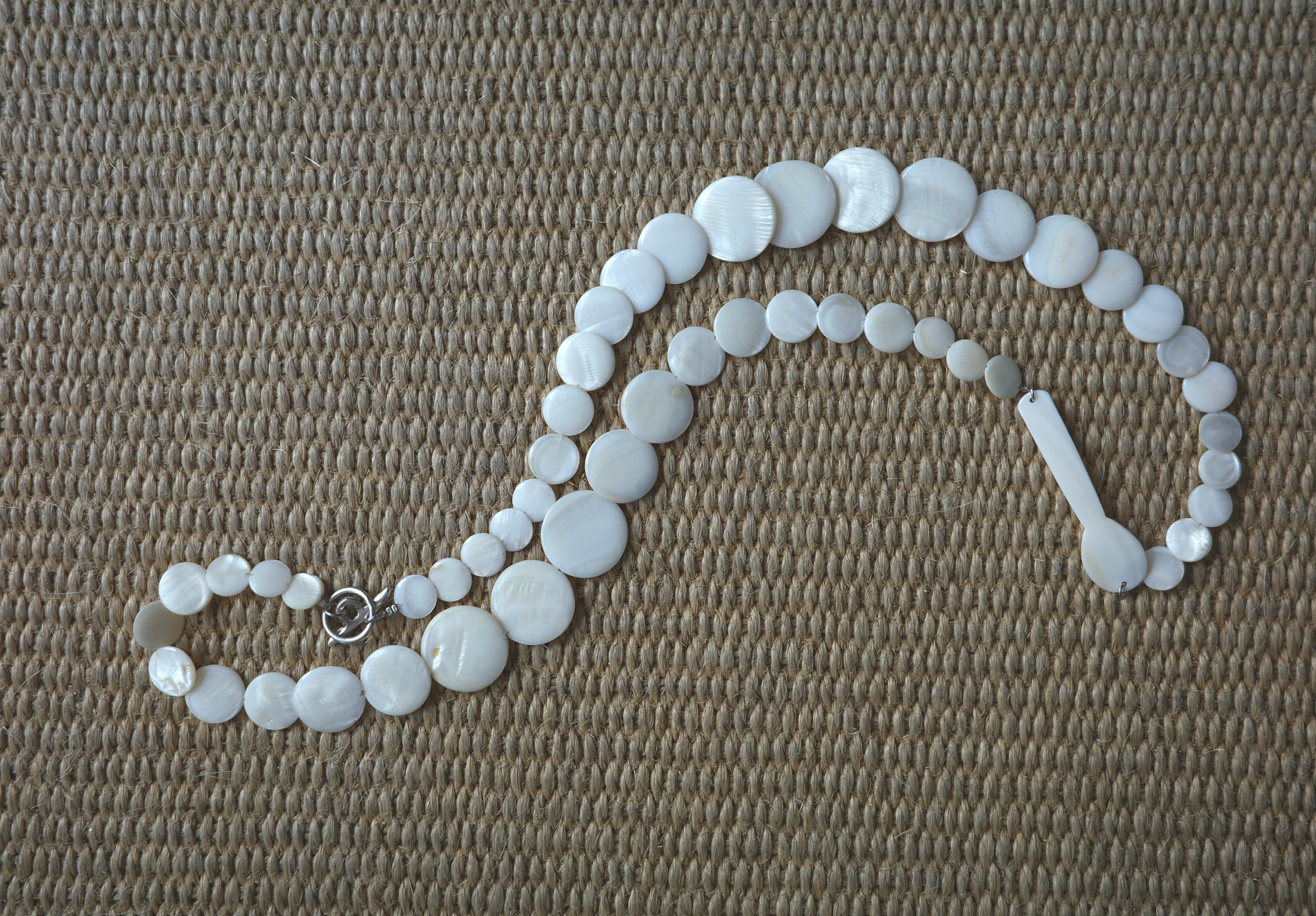 Le collier de ventre Poltu Casu est composé d’une cuillère ancienne en nacre. Les perles vintage sont en nacre.