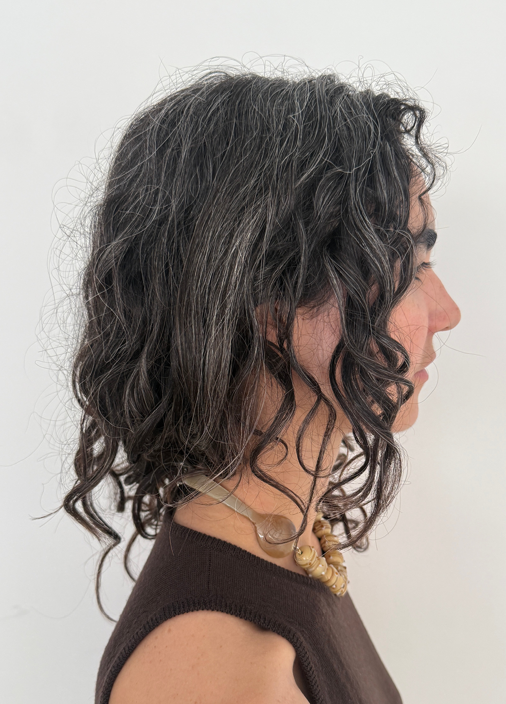 Le collier Alberese est composé d’une cuillère ancienne en corne de zébu, provenant de Madagascar et tordue à Paris par un artisan. Les perles vintage sont en verre de murano.