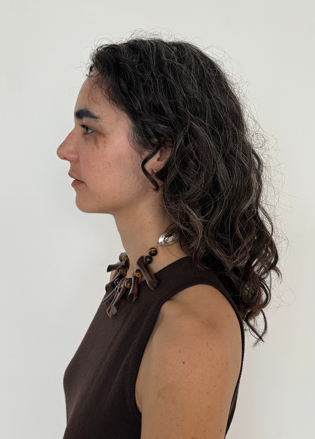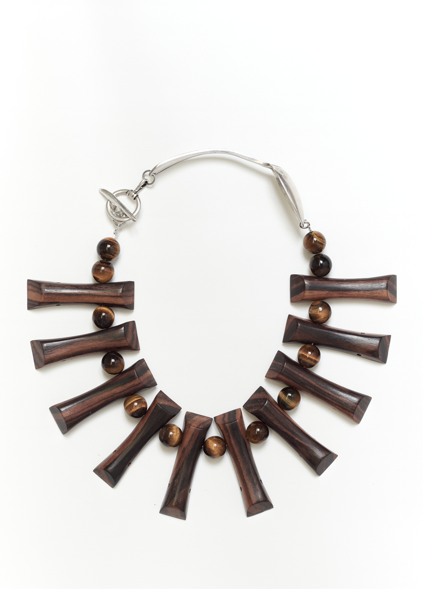 Le collier Baratti est composé d’une cuillère ancienne en argent. Les perles vintage sont en bois et en oeil de tigre.