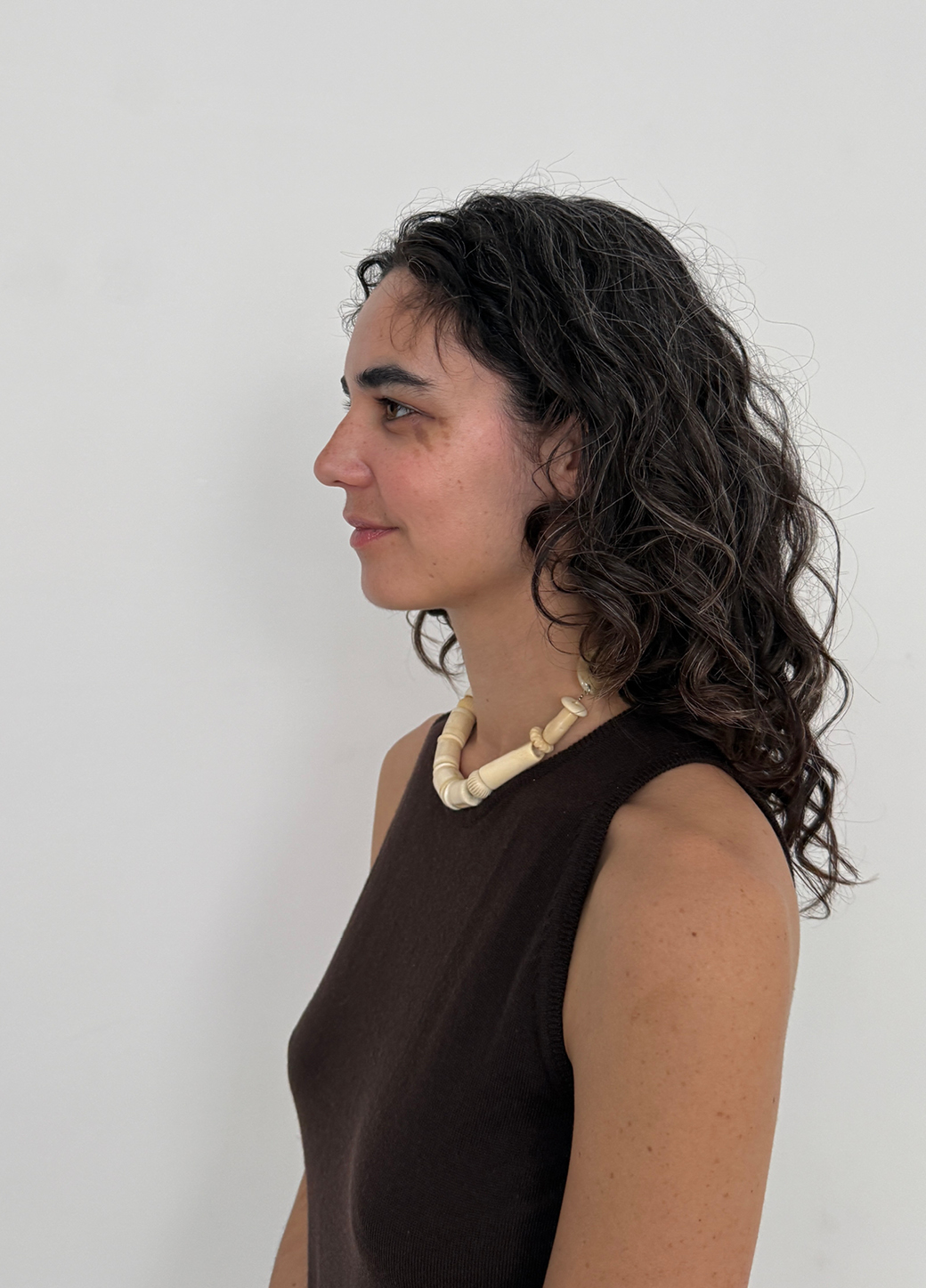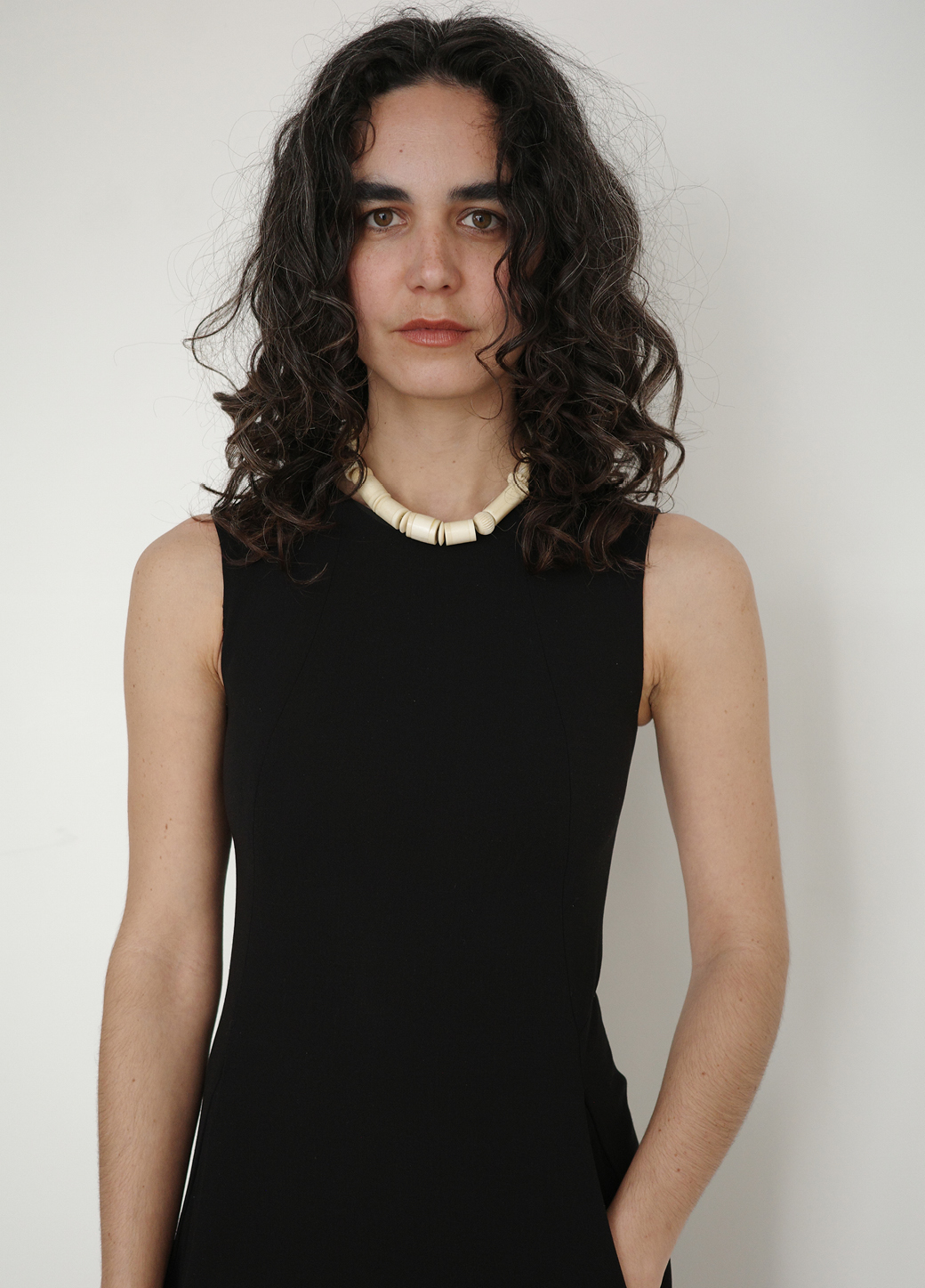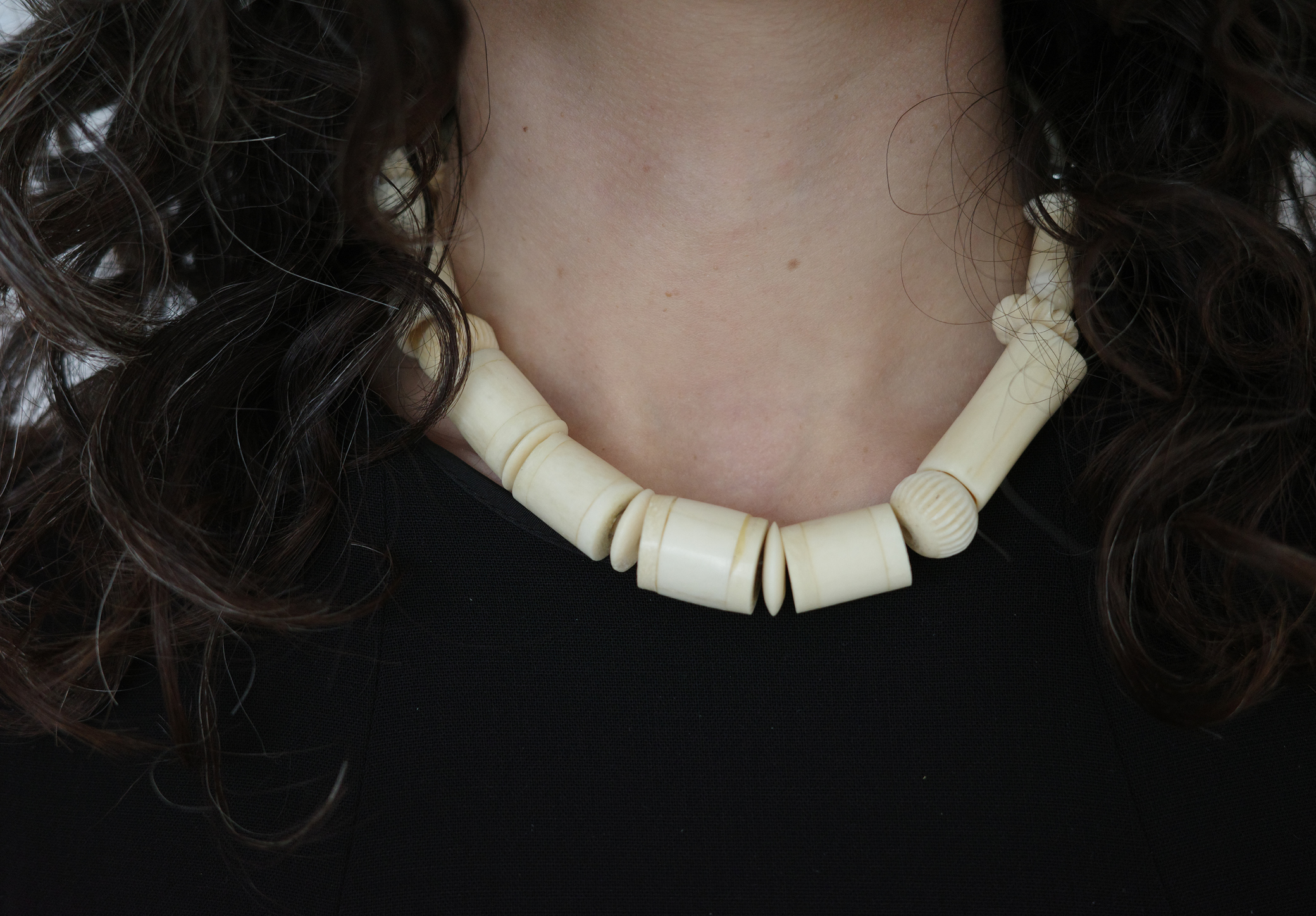 Le collier Bobbio est composé d’une cuillère ancienne en corne de zébu, provenant de Madagascar et tordue à Paris par un artisan. Les perles vintage sont en corne.