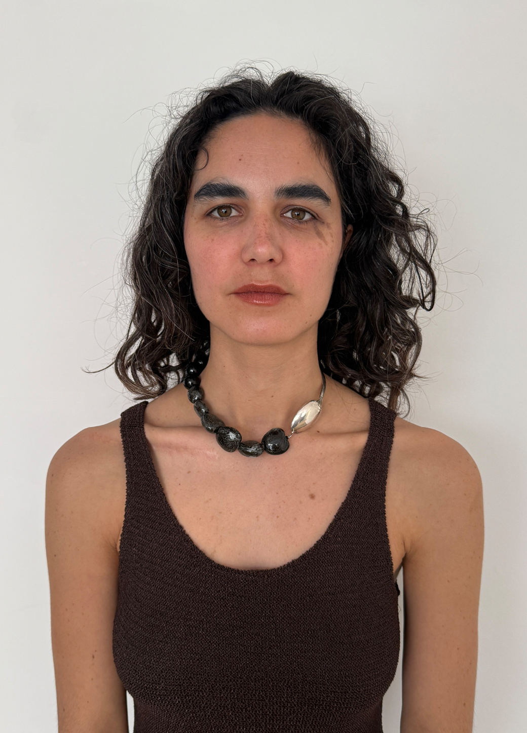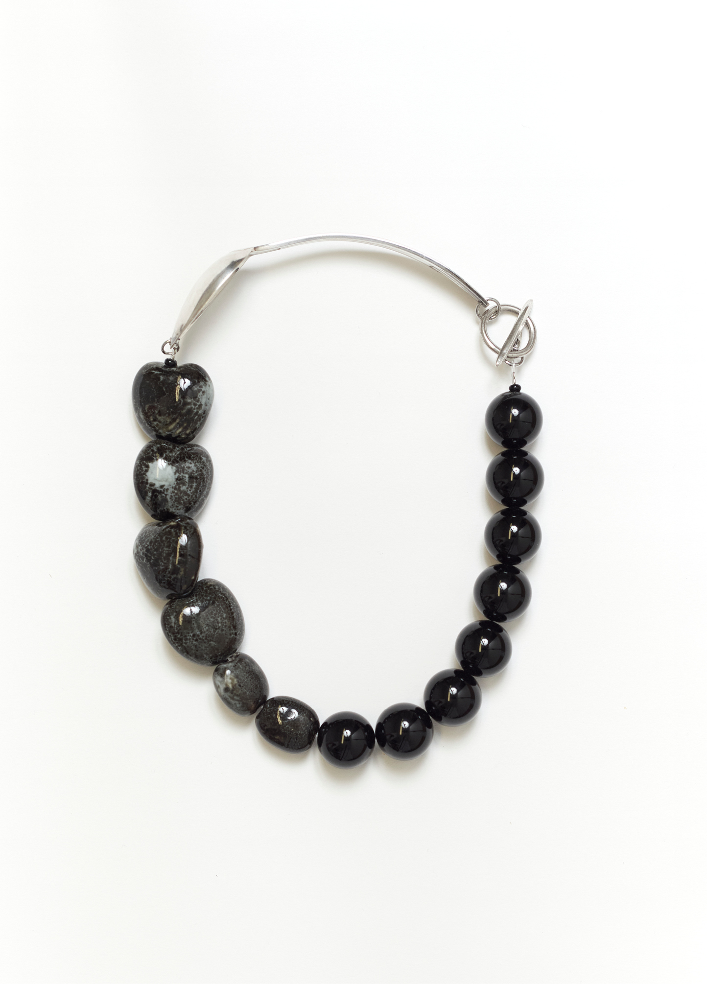 Le collier Pipara est composé d’une cuillère ancienne en argent. Les perles vintage sont en céramique, et les perles rondes noires sont en onyx.