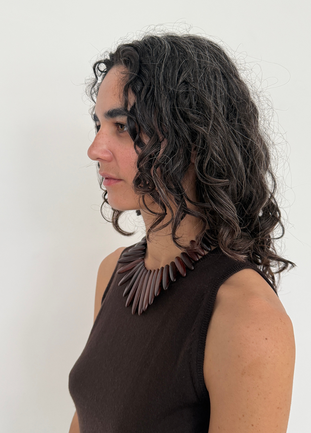 Le collier Solette est composé d'une cuillère ancienne en argent. Les perles vintage sont en bois.
