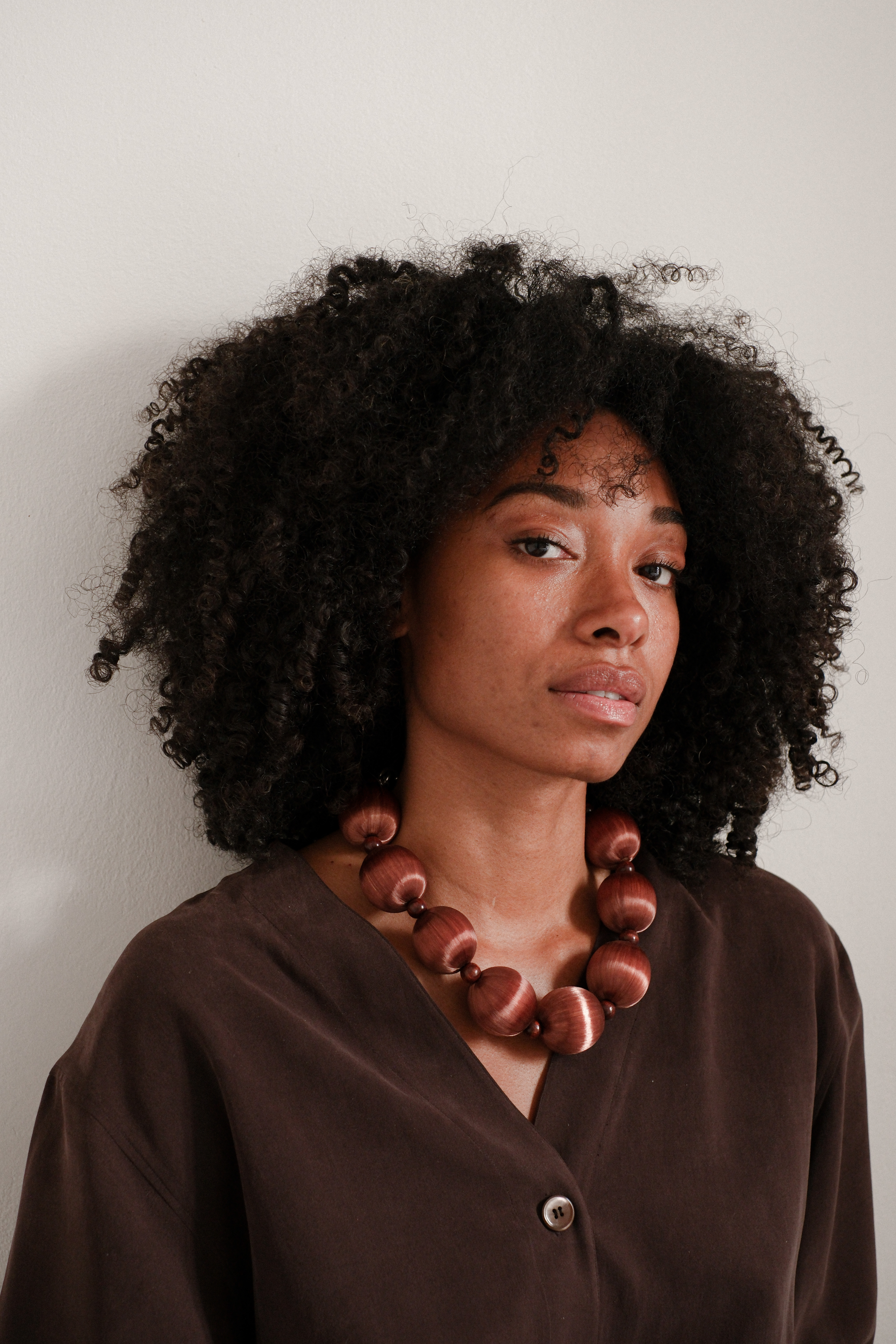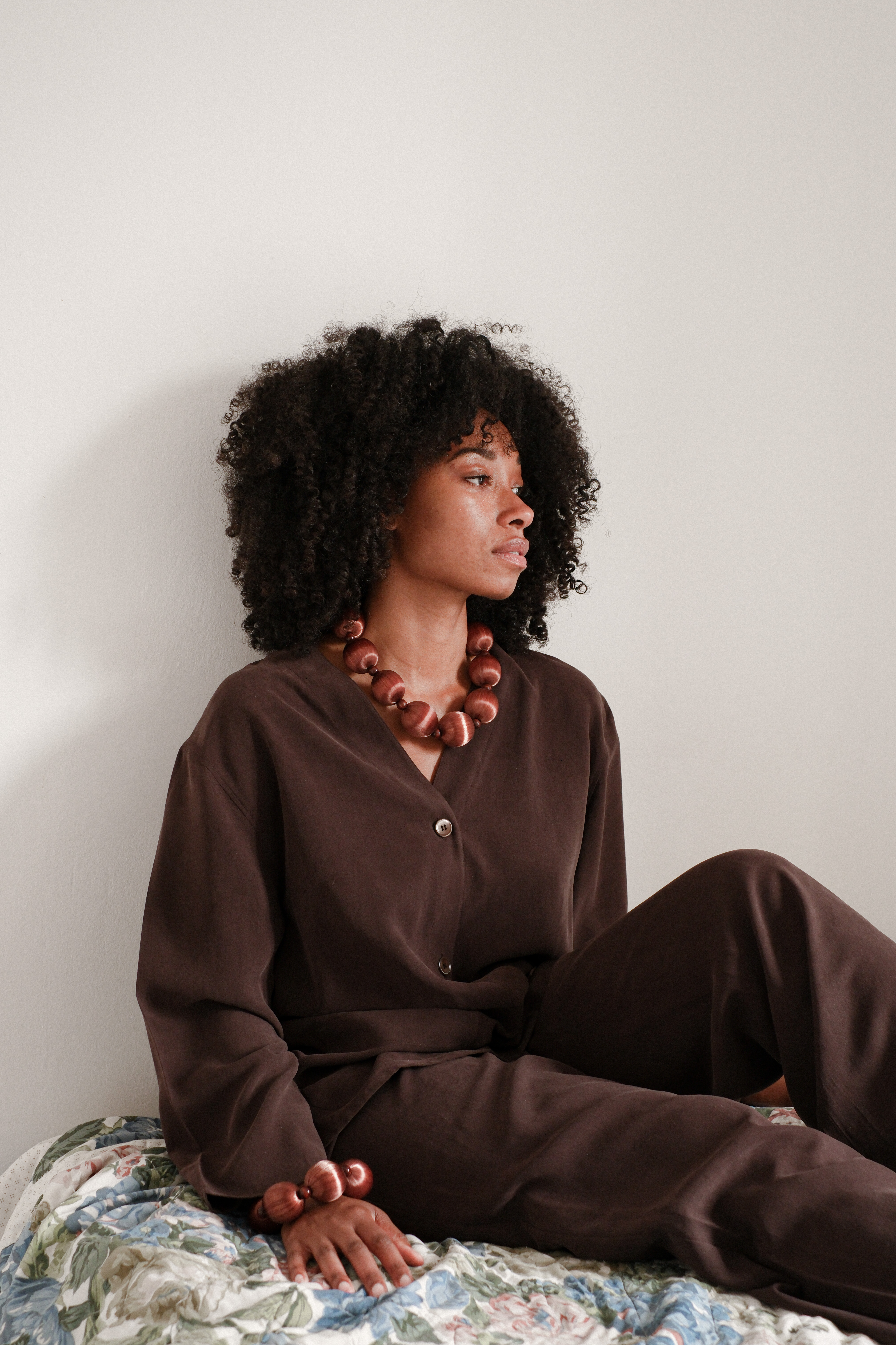 Le collier GRAND COMBIN est composé d’une tête de cuillère en argent et de perles rondes enrobées de fils de soie marron, séparées les unes des autres par de petites perles en bois.