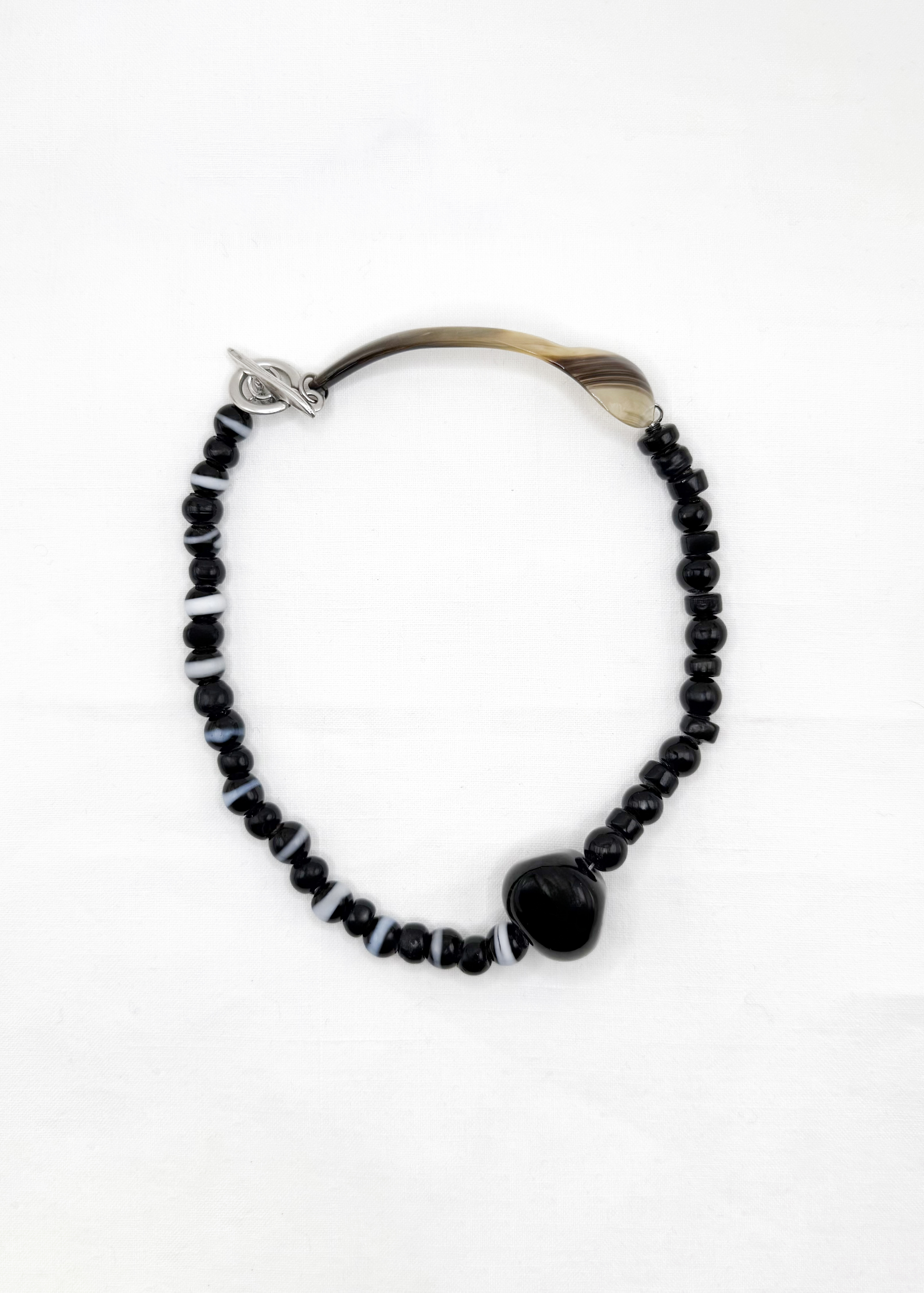 Le collier ROCCA PROVENZIALE est composé d’une cuillère à caviar en corne de zébu et de perles en verre.