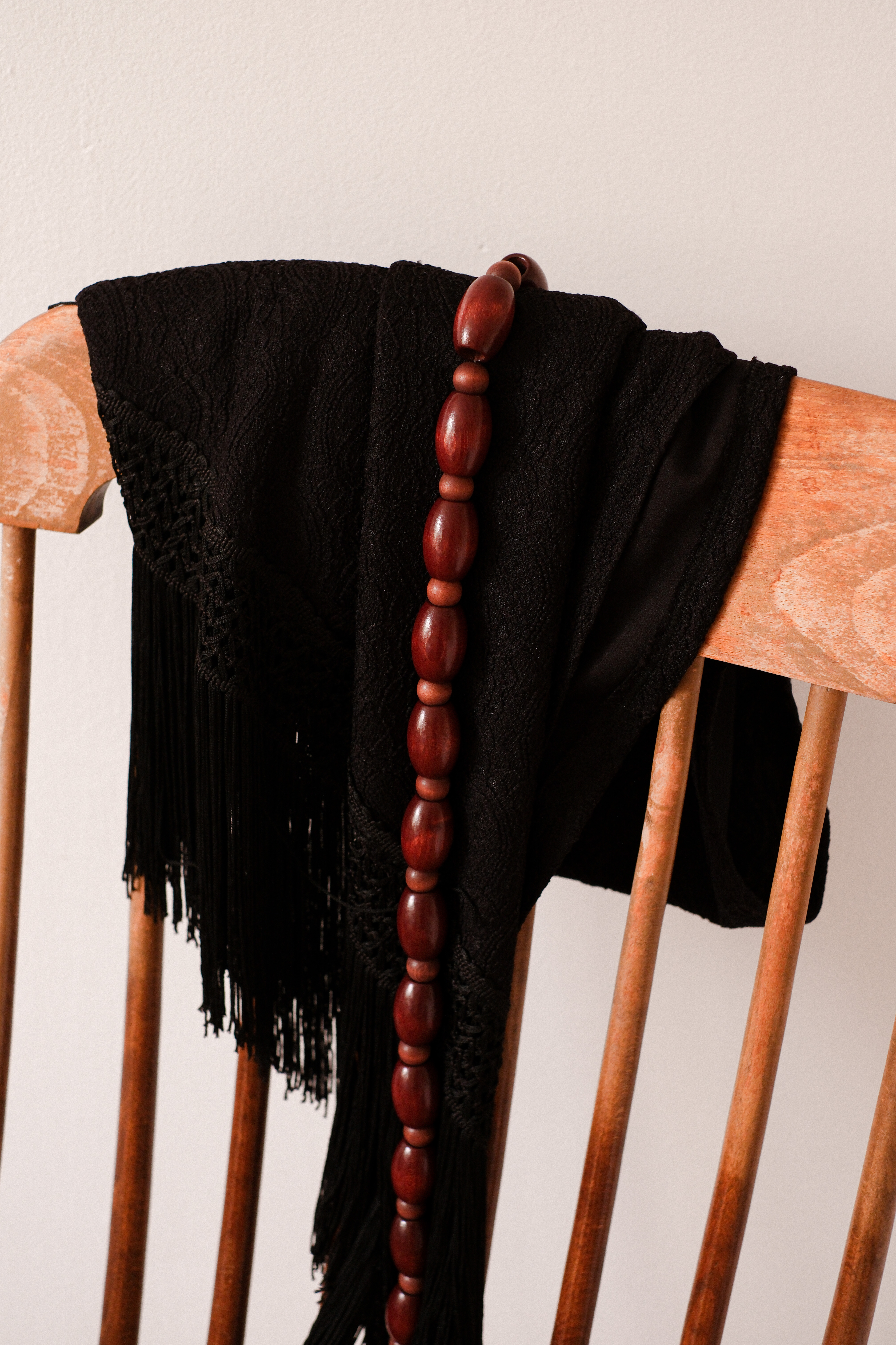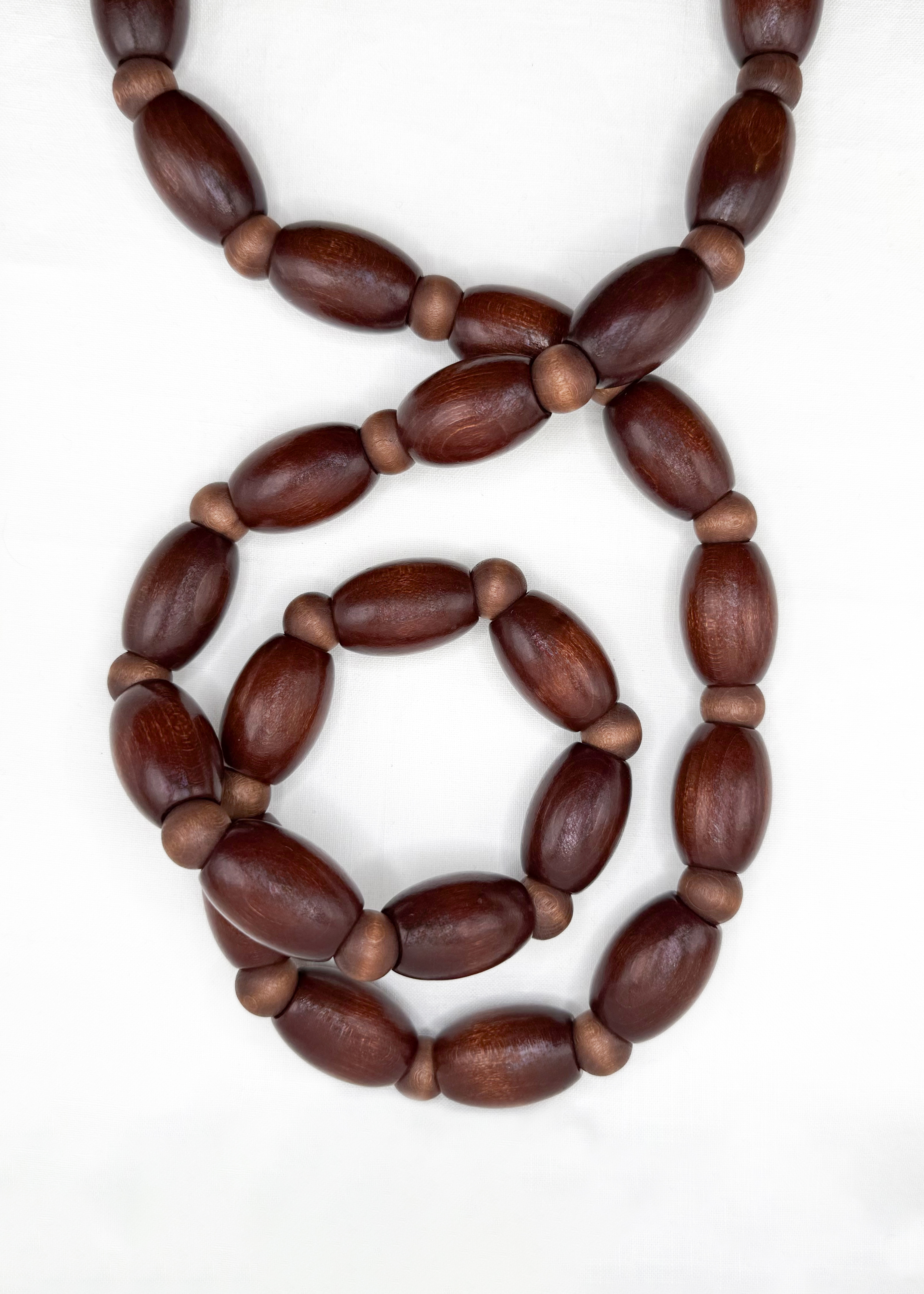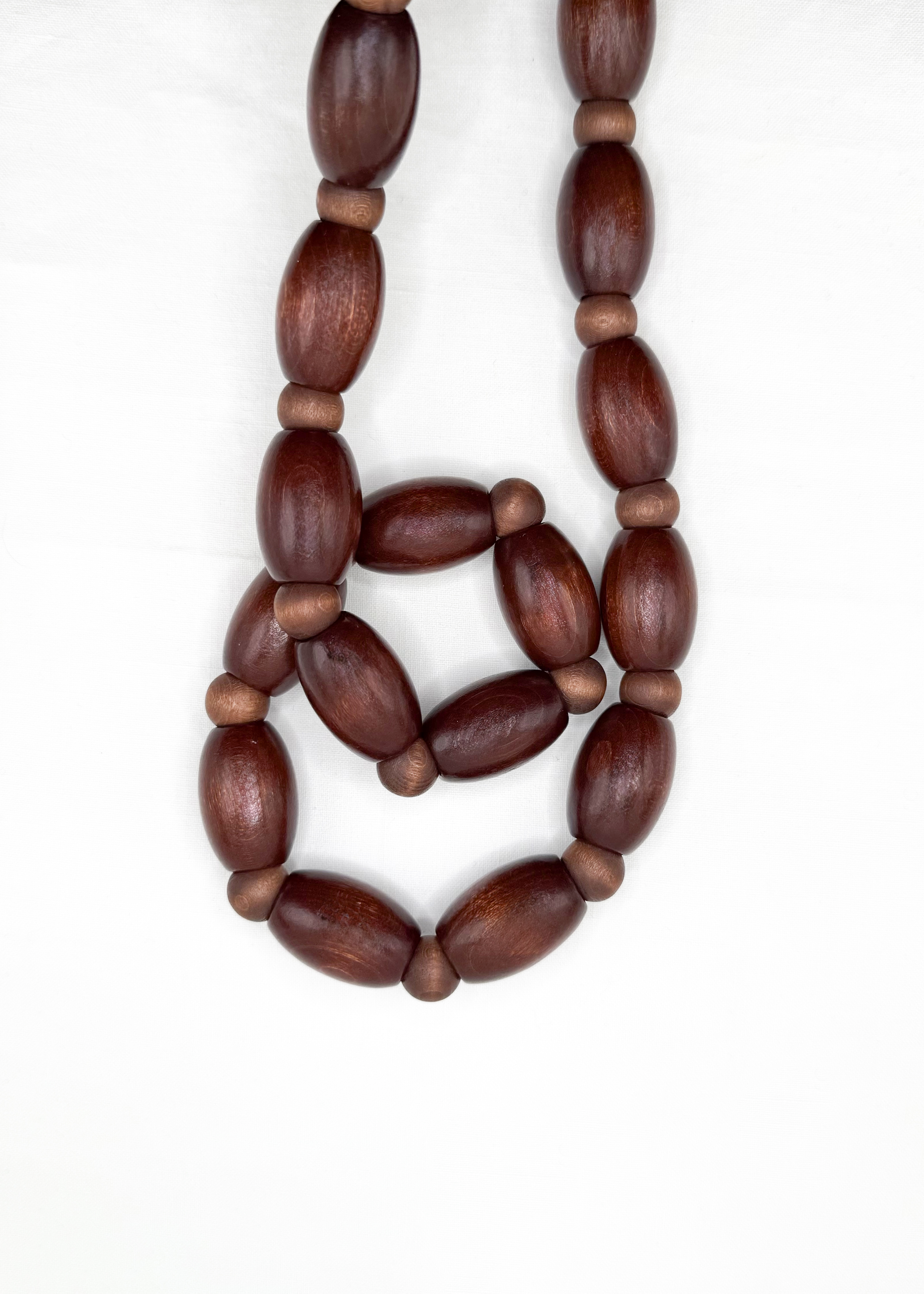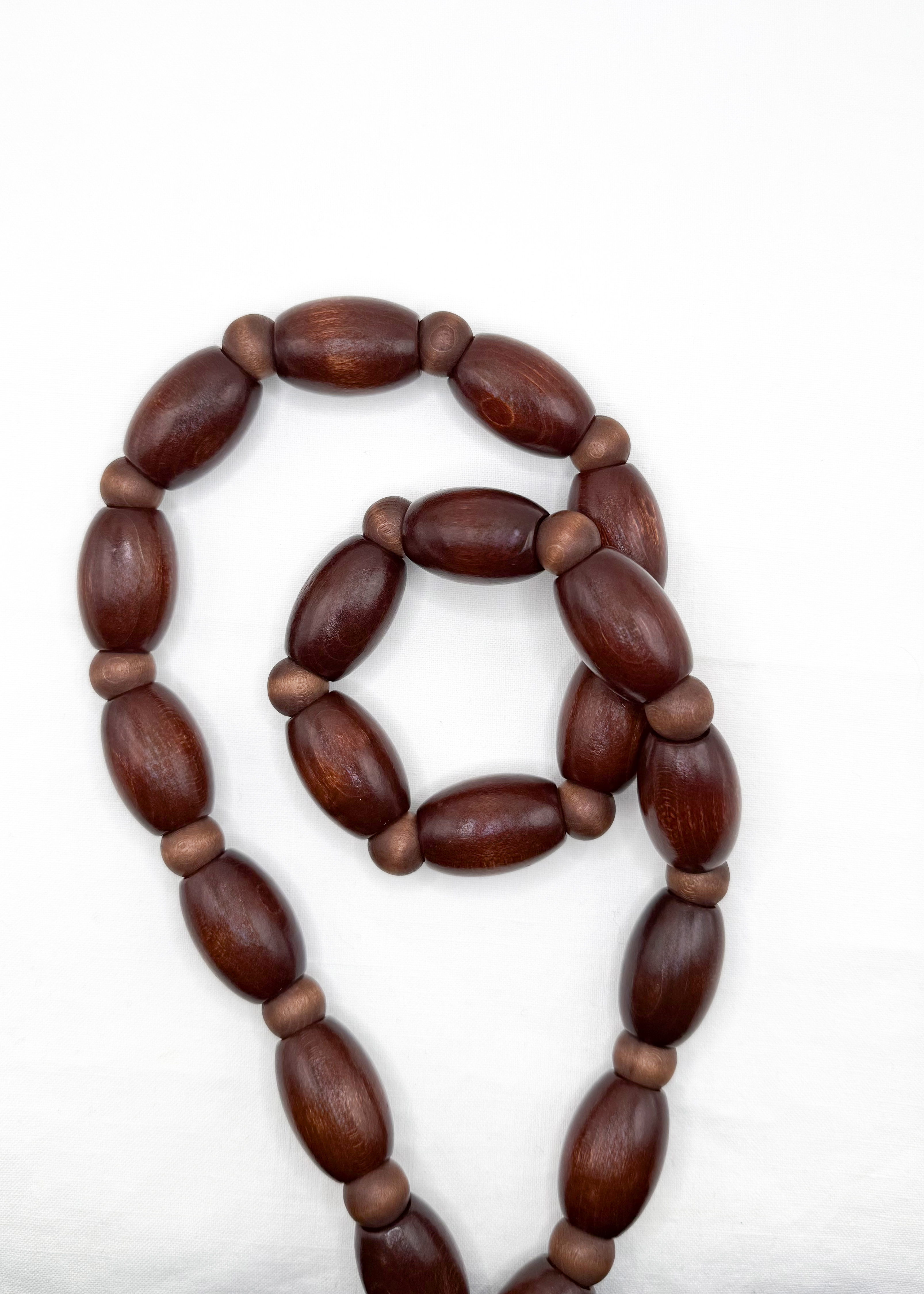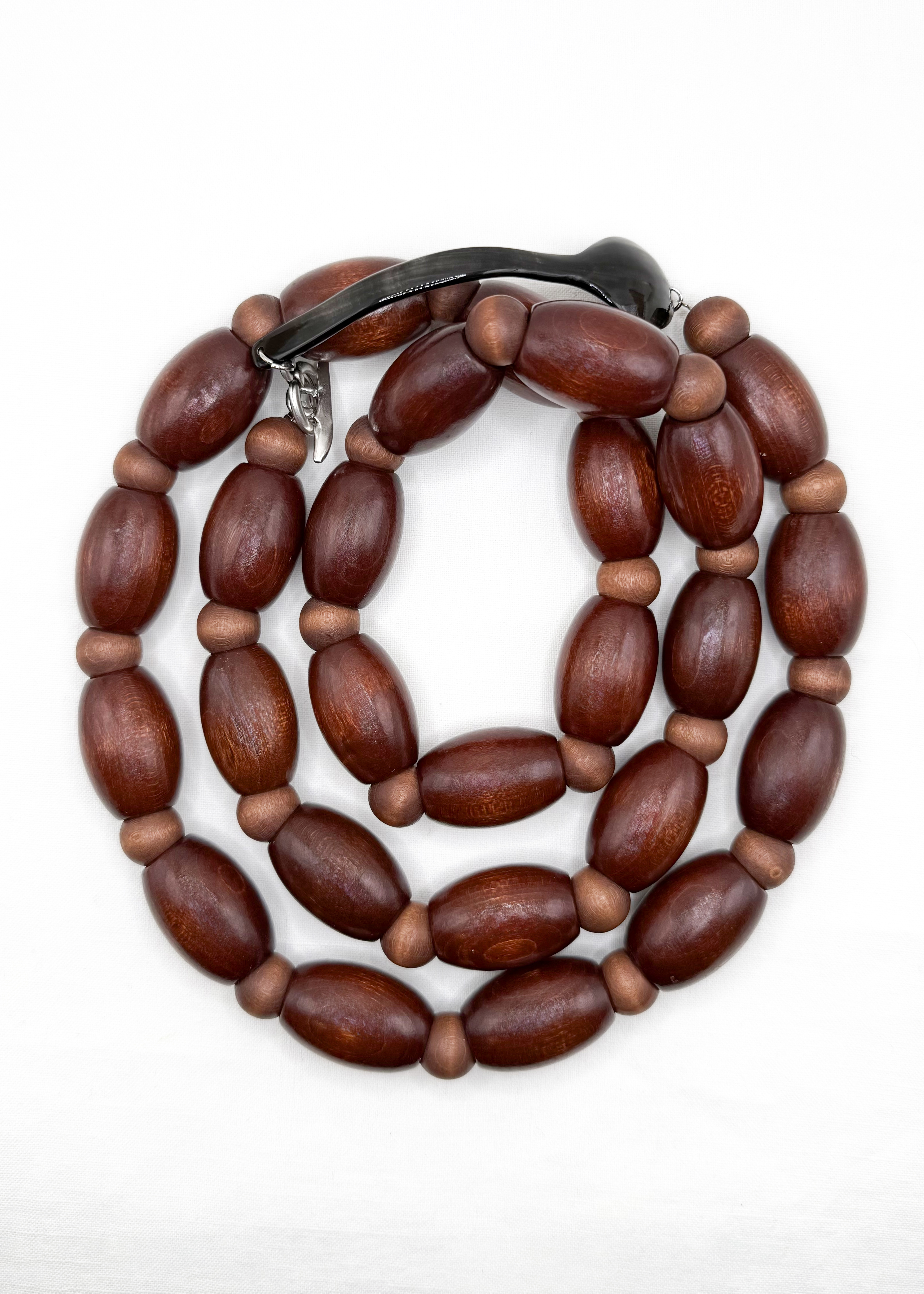 Le long SAUTOIR MONTE COGLIANS est composé d’une cuillère à caviar en corne de zébu et de perles anciennes en bois.